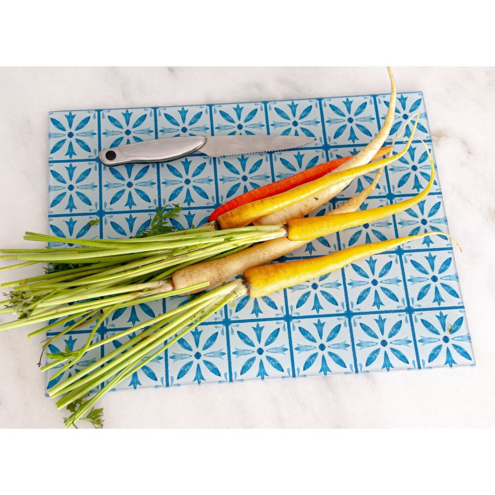 Stylish, sturdy, and multifunctional, this tempered glass cutting and snacking board measures 15” x 11” and brings aesthetic appeal, fun, and utility to every kitchen. From meal prep to entertaining, it’s equal parts useful and display-worthy—a delightful gift for anyone who loves to cook, host, or decorate. Chop and slice on it, serve and snack on it, or put it to use as an eye-catching kitchen and bar decor piece.