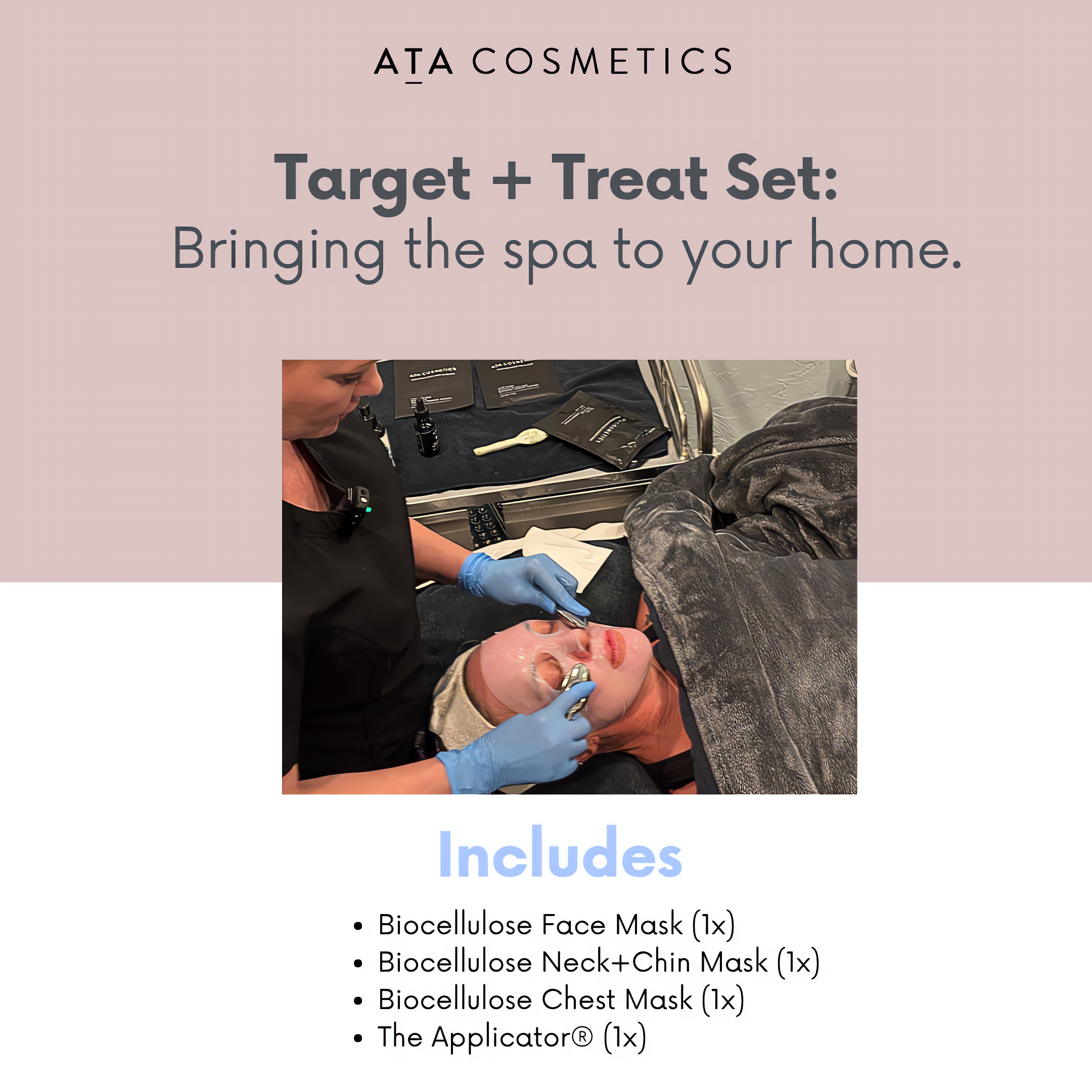 Experience next-level skin recovery. The Target + Treat Set pairs The Applicator®, ATA’s patented stainless-steel skincare/makeup applicator tool, with medical-grade biocellulose masks designed for full-coverage rejuvenation. This synergistic system is designed to enhance collagen, hydration, and absorption for lasting firmness and radiance.