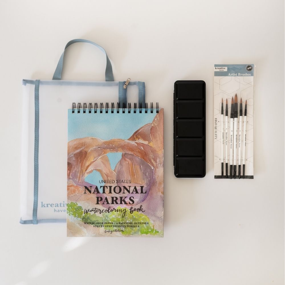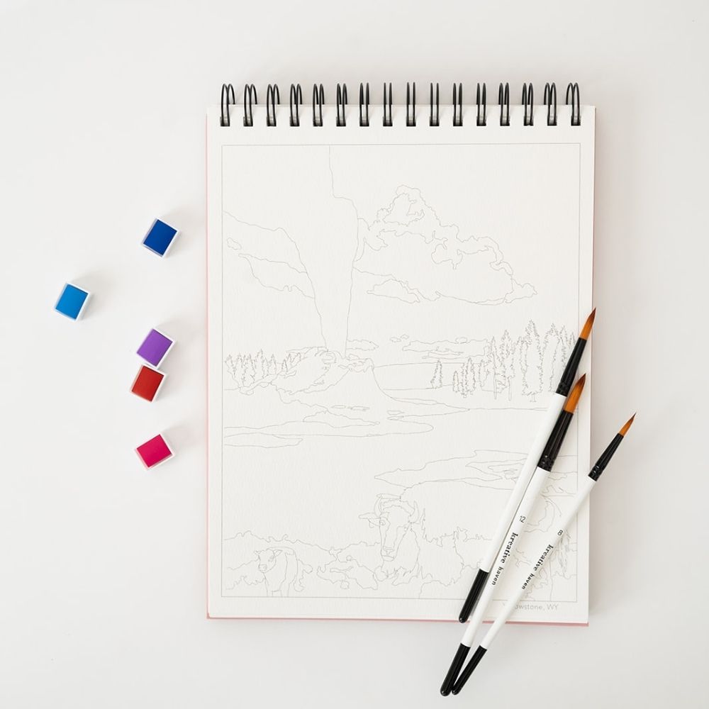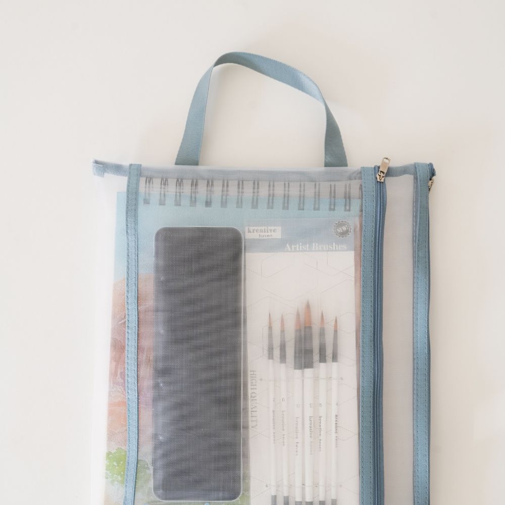 • Set up your space: Unpack the carry-all bag and lay out the watercolor book, paint palette, and brushes. Each piece is designed for easy travel and creative flexibility