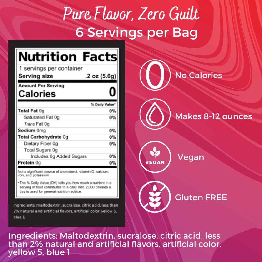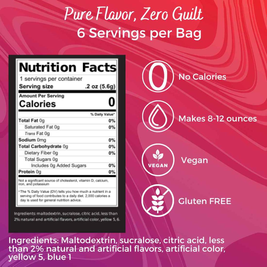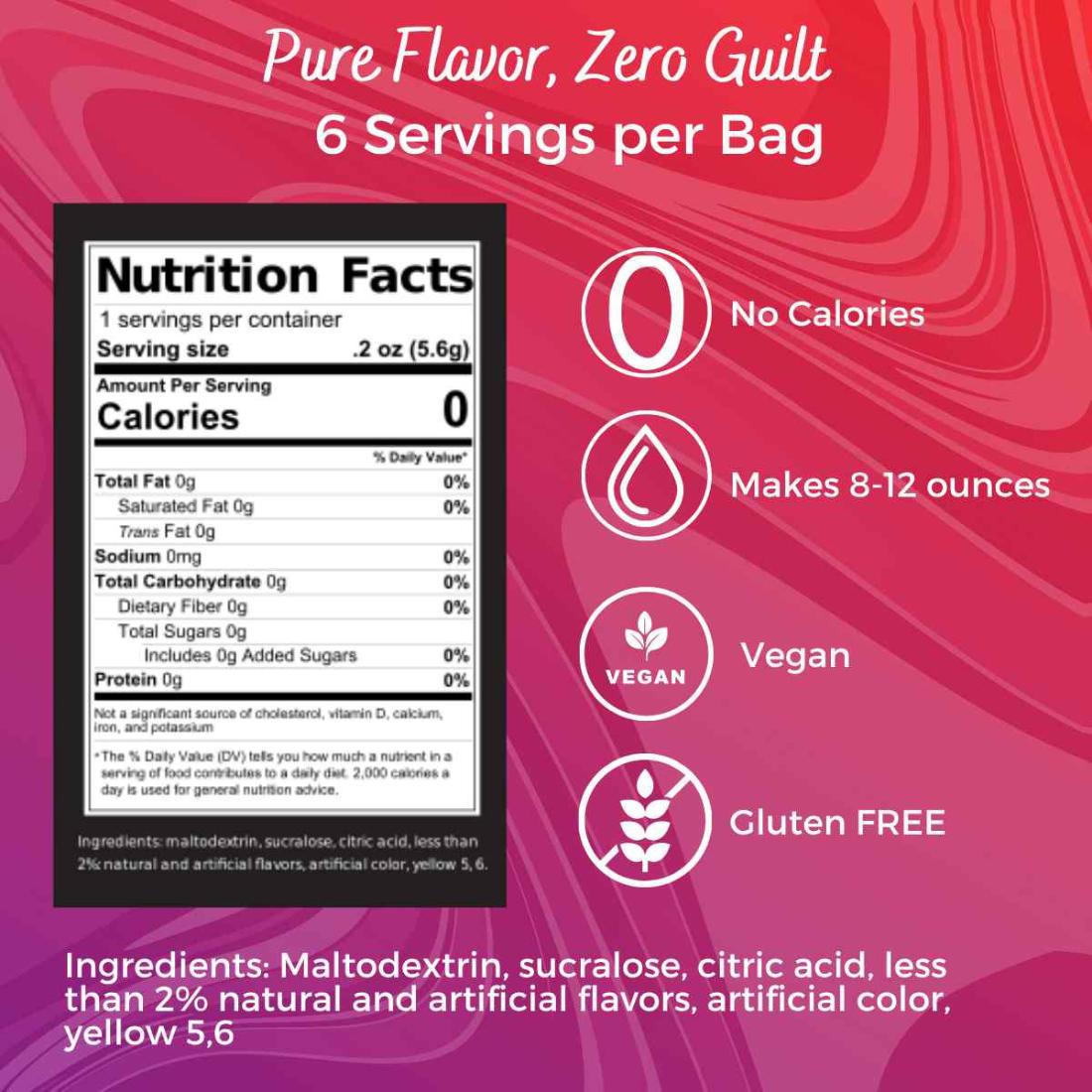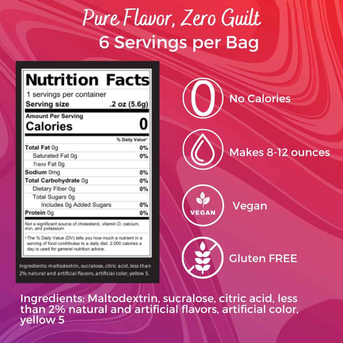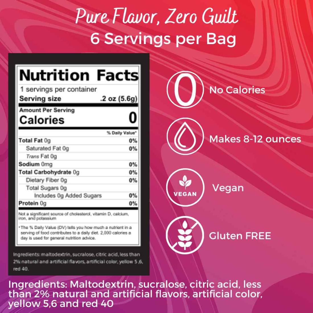 • Lemon Drop: Maltodextrin, Sucralose, Citric Acid, less than 2% Natural and Artificial Flavors, Artificial Color, Yellow 5