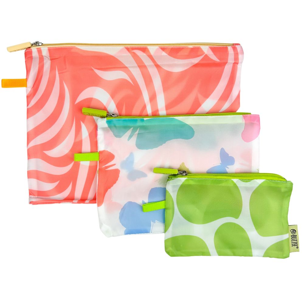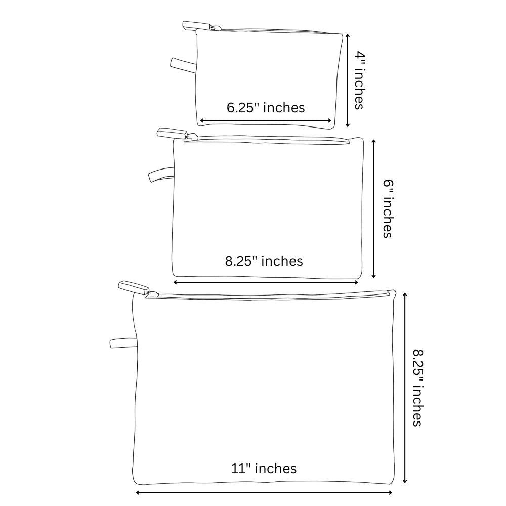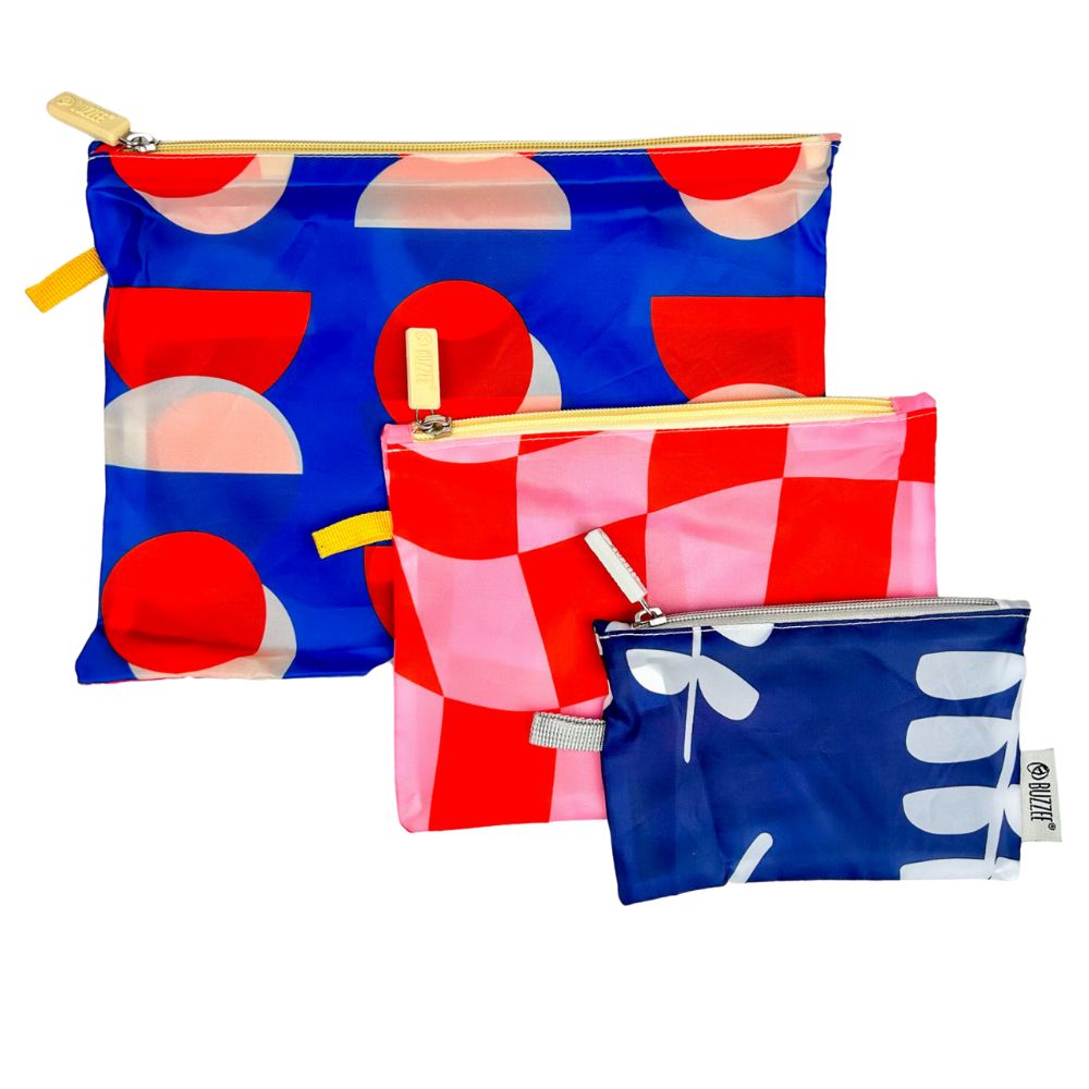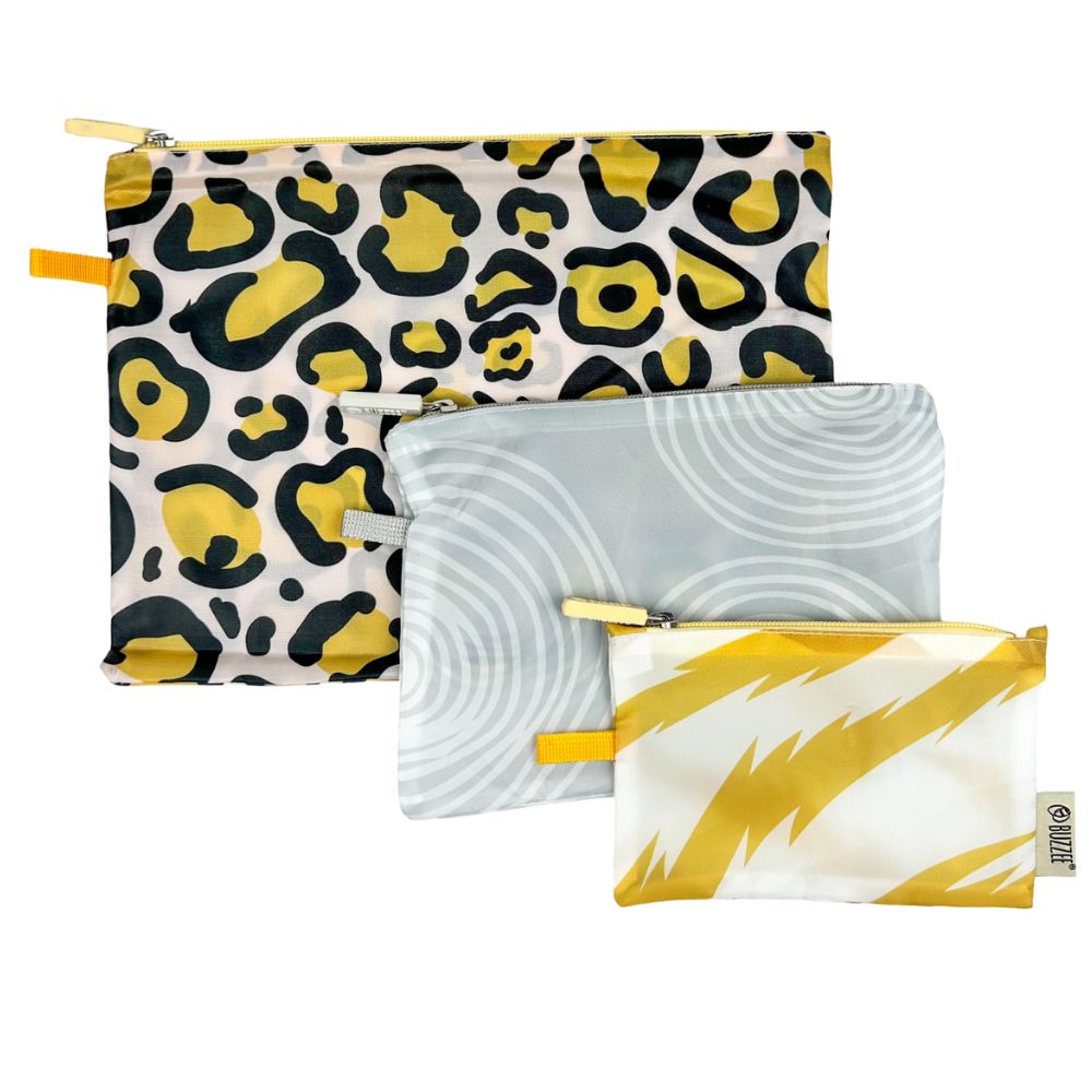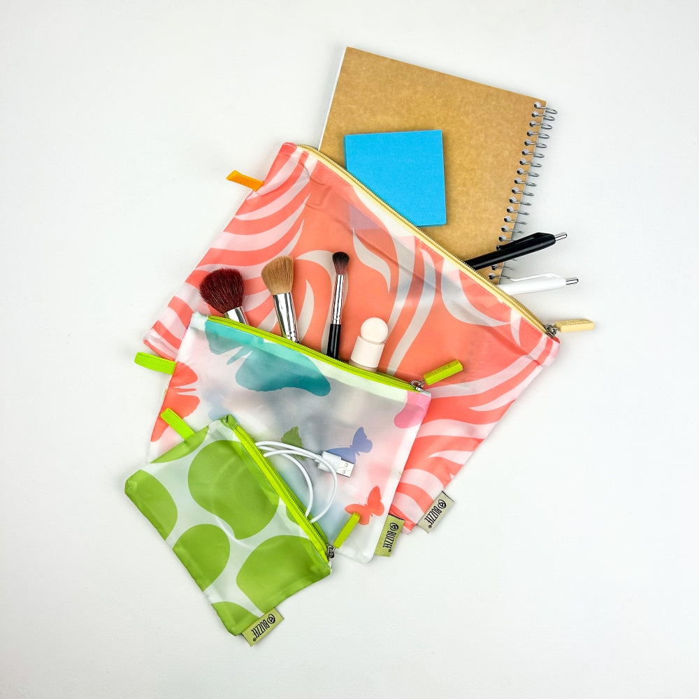 • Three (3) reusable zipper pouches in three (3) sizes and coordinating designs: