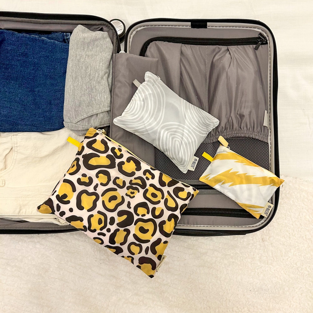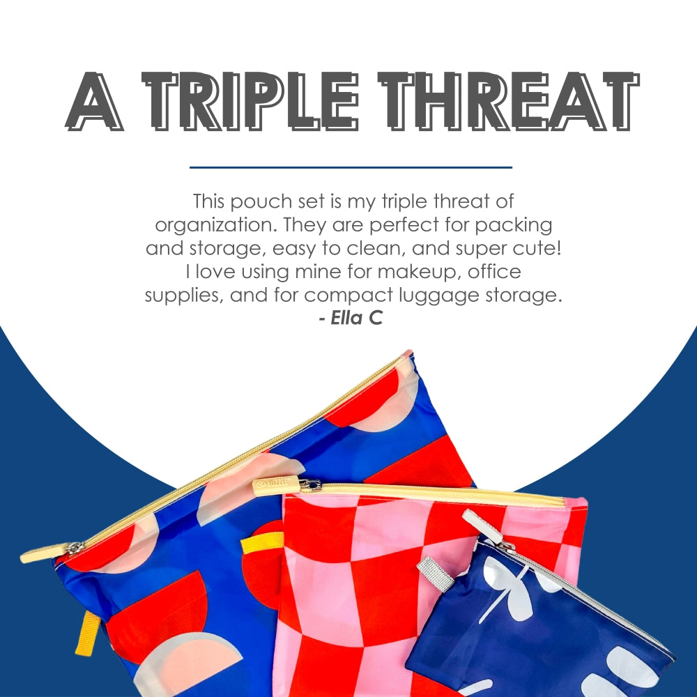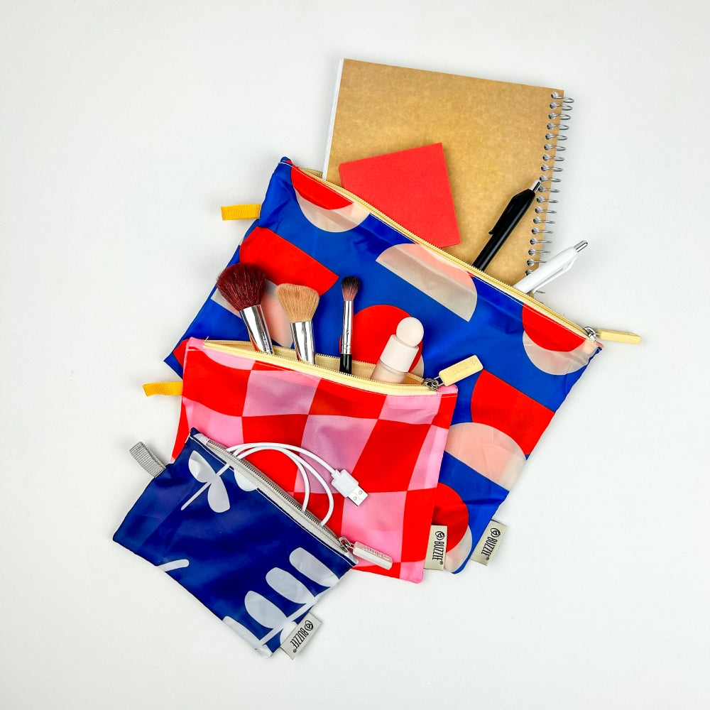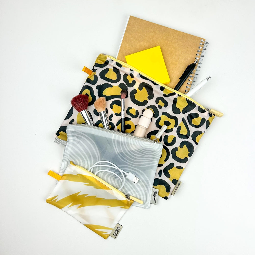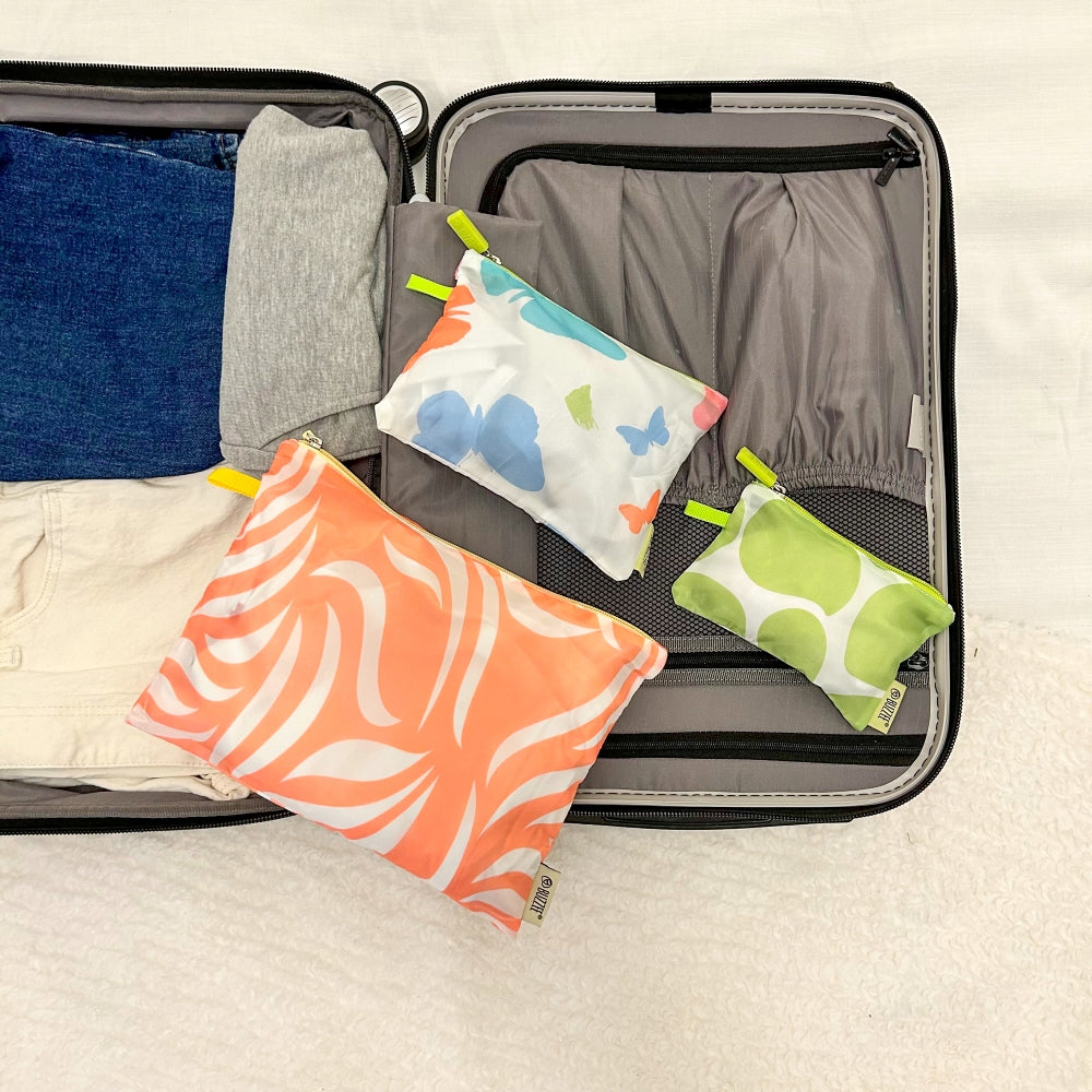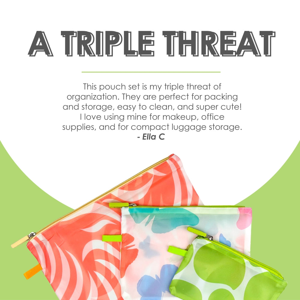 • Three (3) reusable zipper pouches in three (3) sizes and coordinating designs: