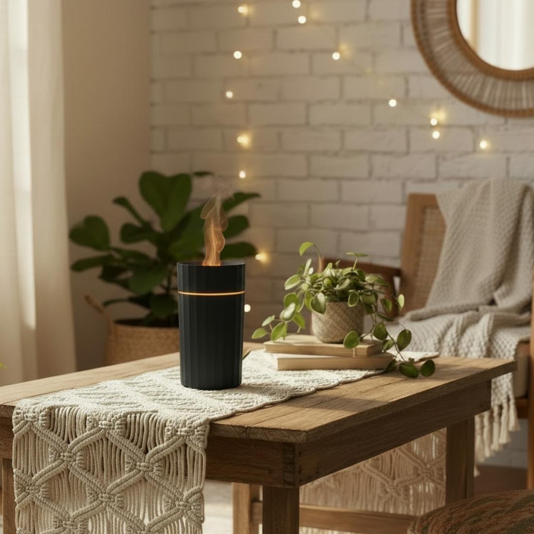 Small size. Big vibes. This mini diffuser adds colorful and soothing mood lighting to your essential oil routine. There’s no actual heat or smoke involved—just the tranquil aura of a realistic-looking candle flame, or a calming seven-color spectrum. Powered by USB-C, it’s ideal for moving around the house or on-the-go in your car’s cup holder.