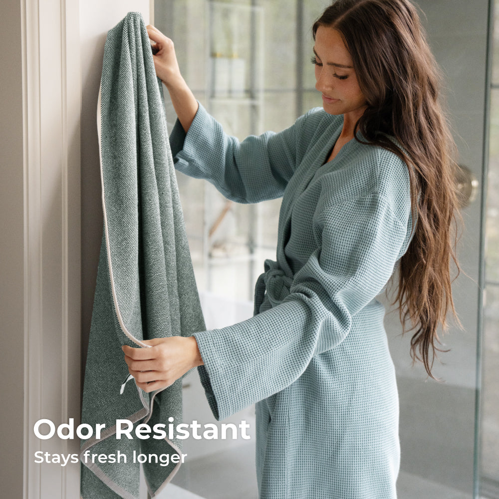 A quality bath towel that combines luxury softness and odor resistance. Experience the natural odor-resistant properties bamboo fabric has to offer. Extra-smooth, slightly twisted yarn is loomed to 600 grams per square meter for increased comfort. This bath towel is optimized for softness, weight, and plushness. Not too thin, not too thick—just right.