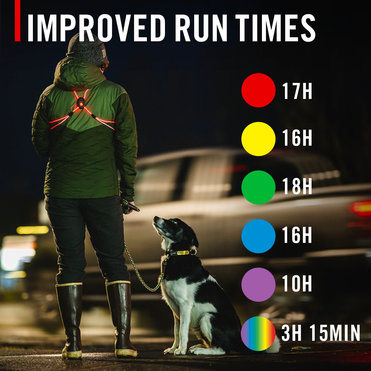 • Six+ color modes to match the light output to your need in the moment: Red, yellow, green, blue, purple, and multicolor sequencing mode
