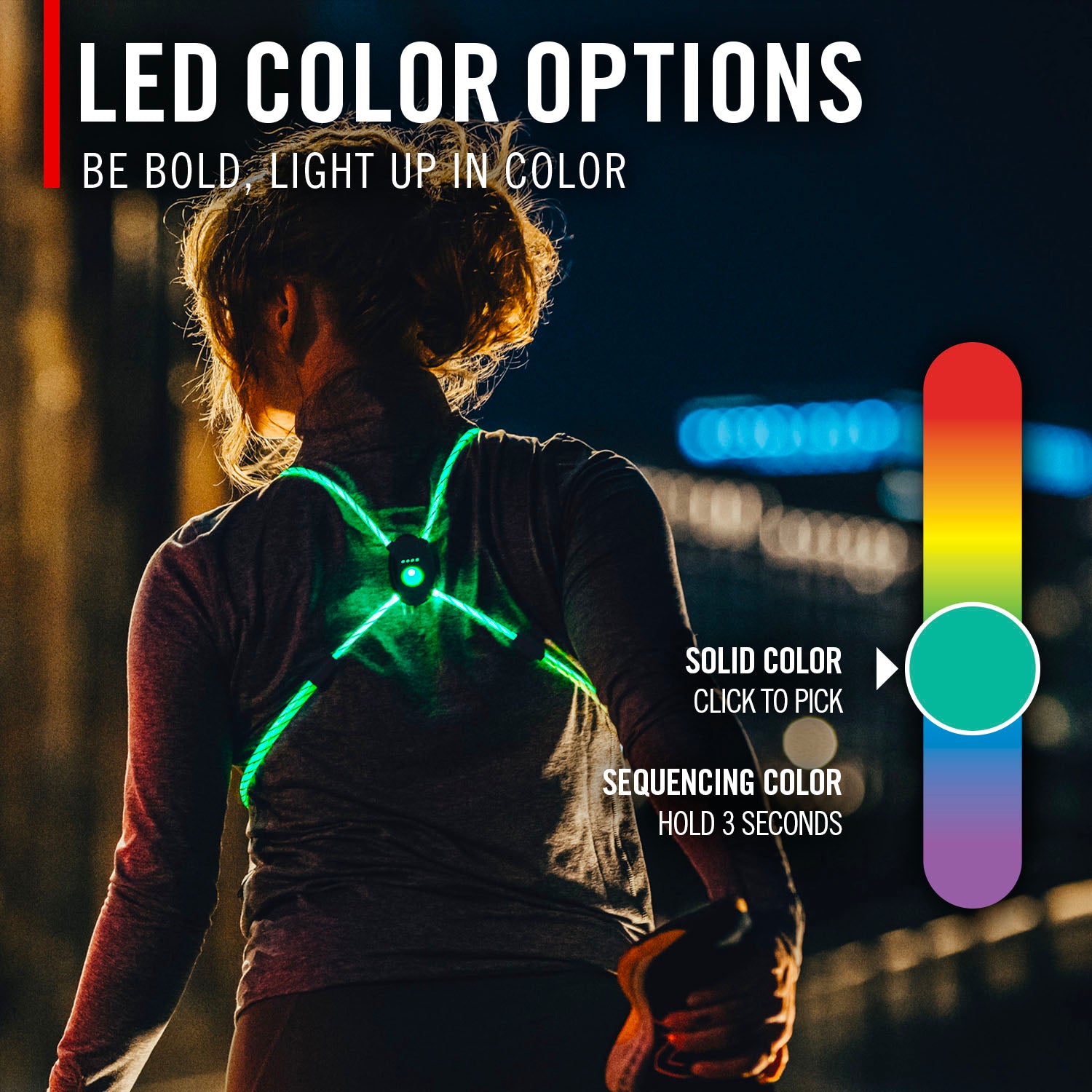 Color modes: Use the power button to turn on harness and cycle through color modes. After 5 seconds in any mode, pressing the power button will turn off the harness