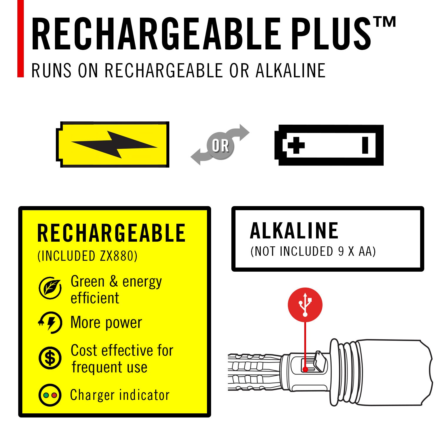 Take light to an all-new level. Built for maximal output, the XP80R Rechargeable Flashlight is top-quality, portable lighting on absolute overdrive—peaking at 15,000 lumens. This five-mode flashlight—medium, high, low, Turbo, MoonGlow™—features a Focusing Pure Beam adjusted at the easy push or pull of the SLIDE FOCUS®.