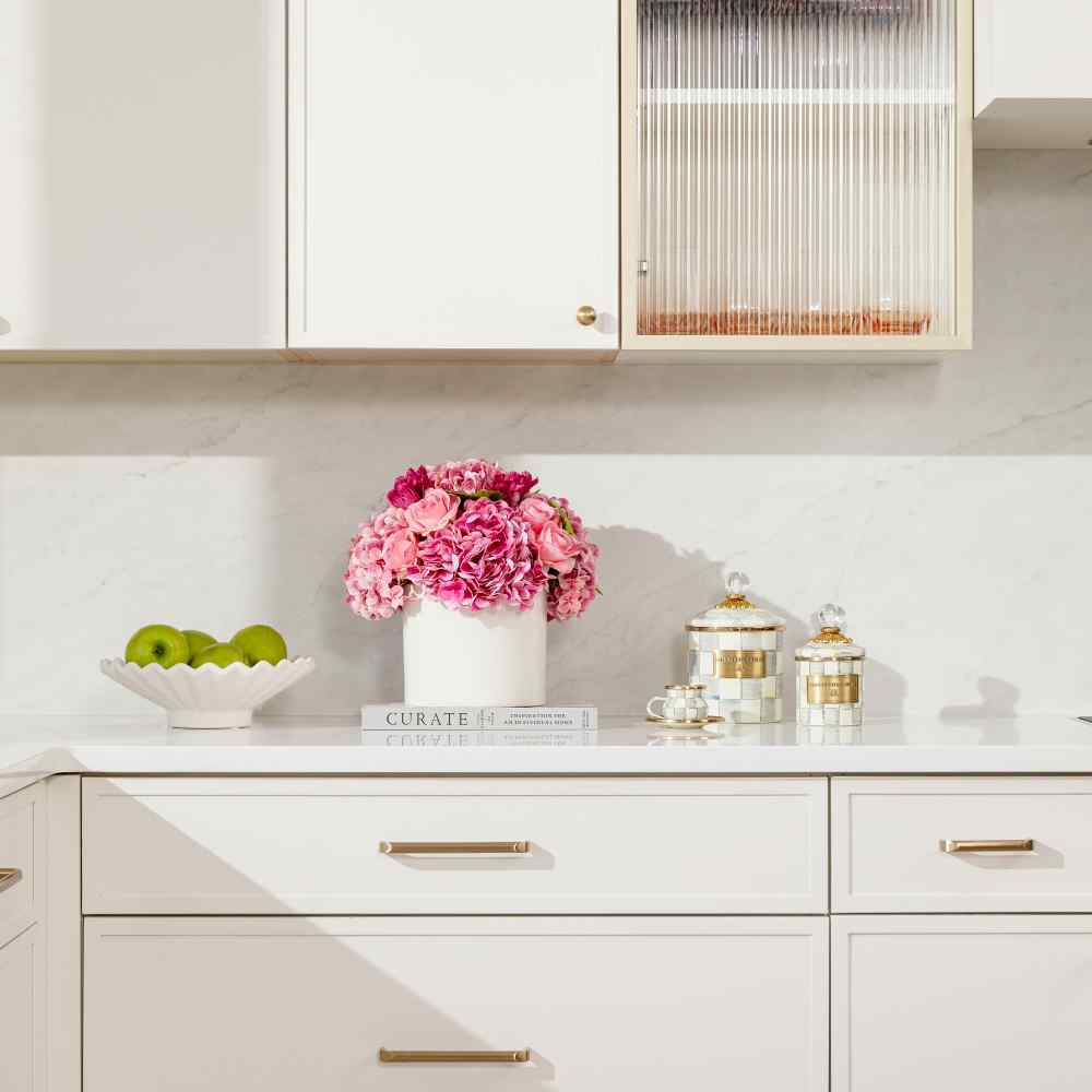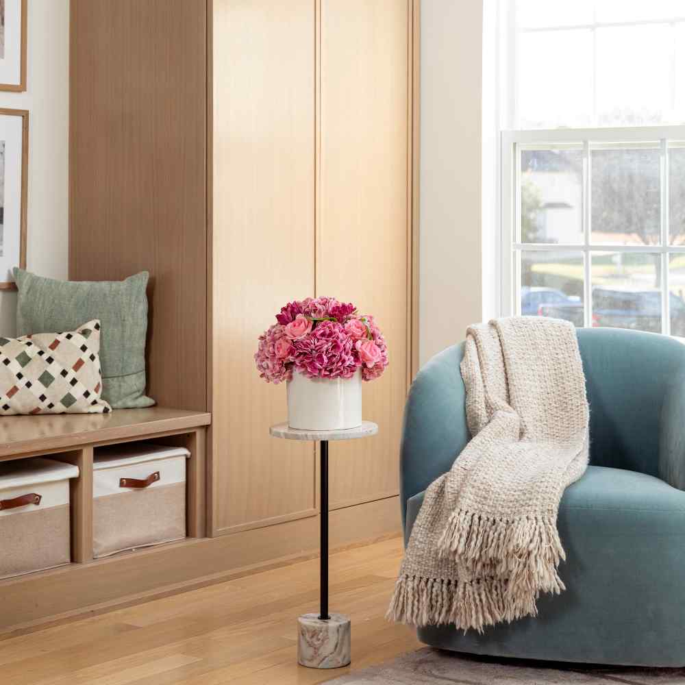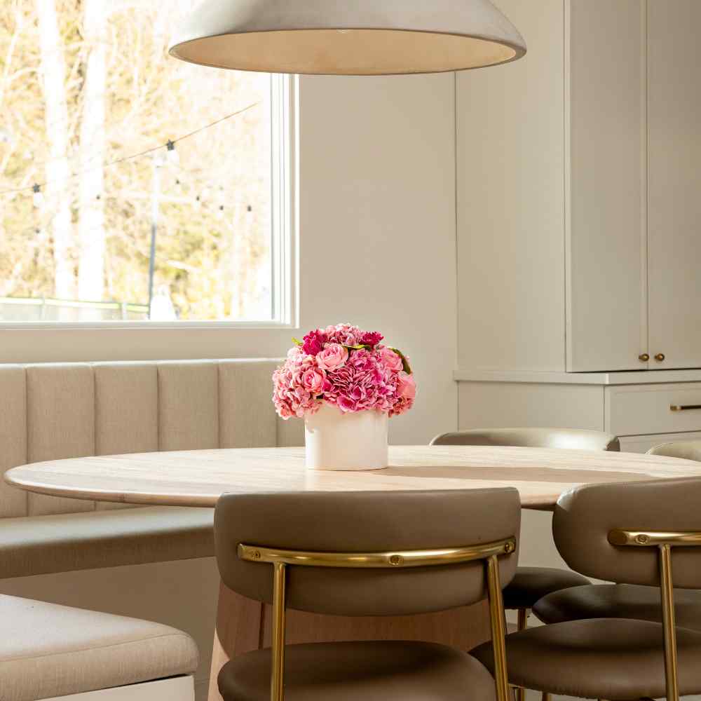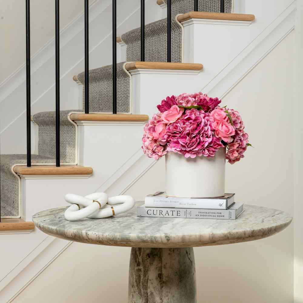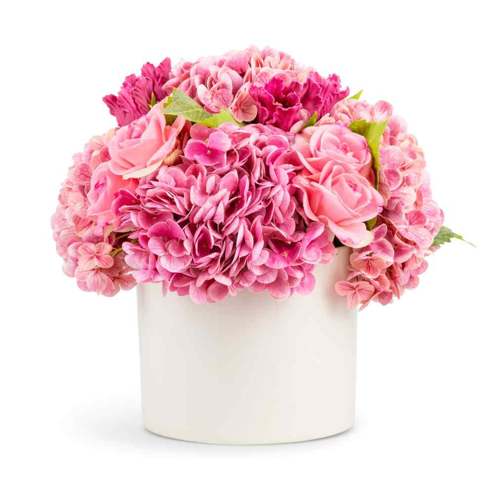 The Amour RealTouch Mixed Floral Arrangement is a romantic composition of lush pink hydrangeas, soft roses, and layered accent blooms, designed to feel full, expressive, and beautifully lifelike. Set in a clean, modern vessel, this arrangement brings warmth, charm, and a sense of occasion to any space.