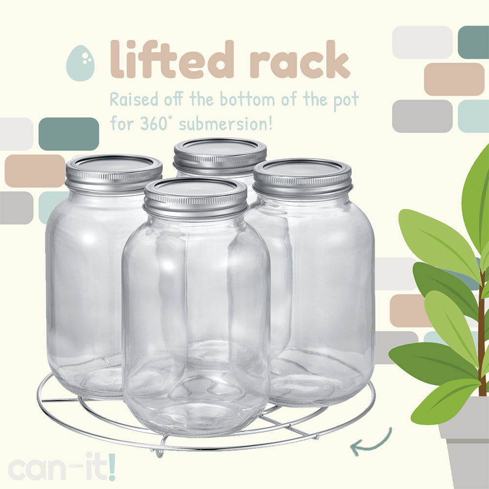 Stainless steel canning rack lifts jars roughly 1/2" off the bottom for 360° submersion