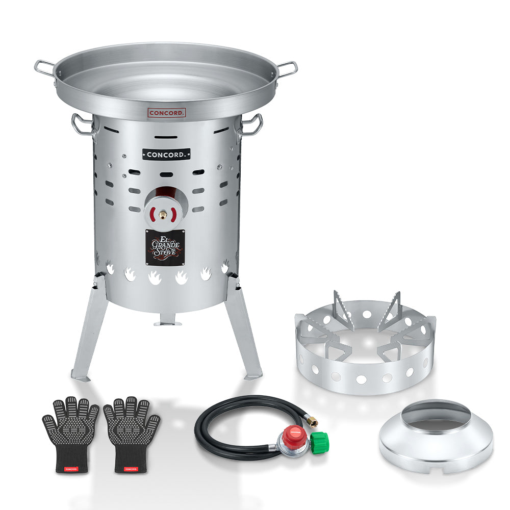 The El Grande Stove is a versatile outdoor single propane burner stove ideal for comal, discata, and cowboy wok cooking! It features the Banjo Burner head, capable of putting out 220,000 BTU, and a fully stainless steel, 16-gauge body frame.