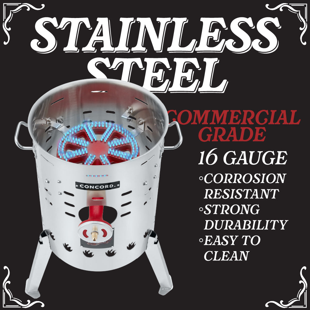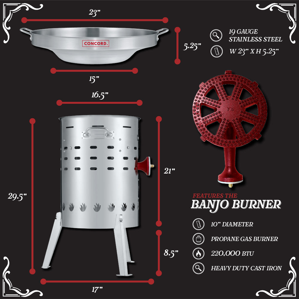 • Banjo Burner head capable of putting out 220,000 BTU, but can also be lowered to a simmer