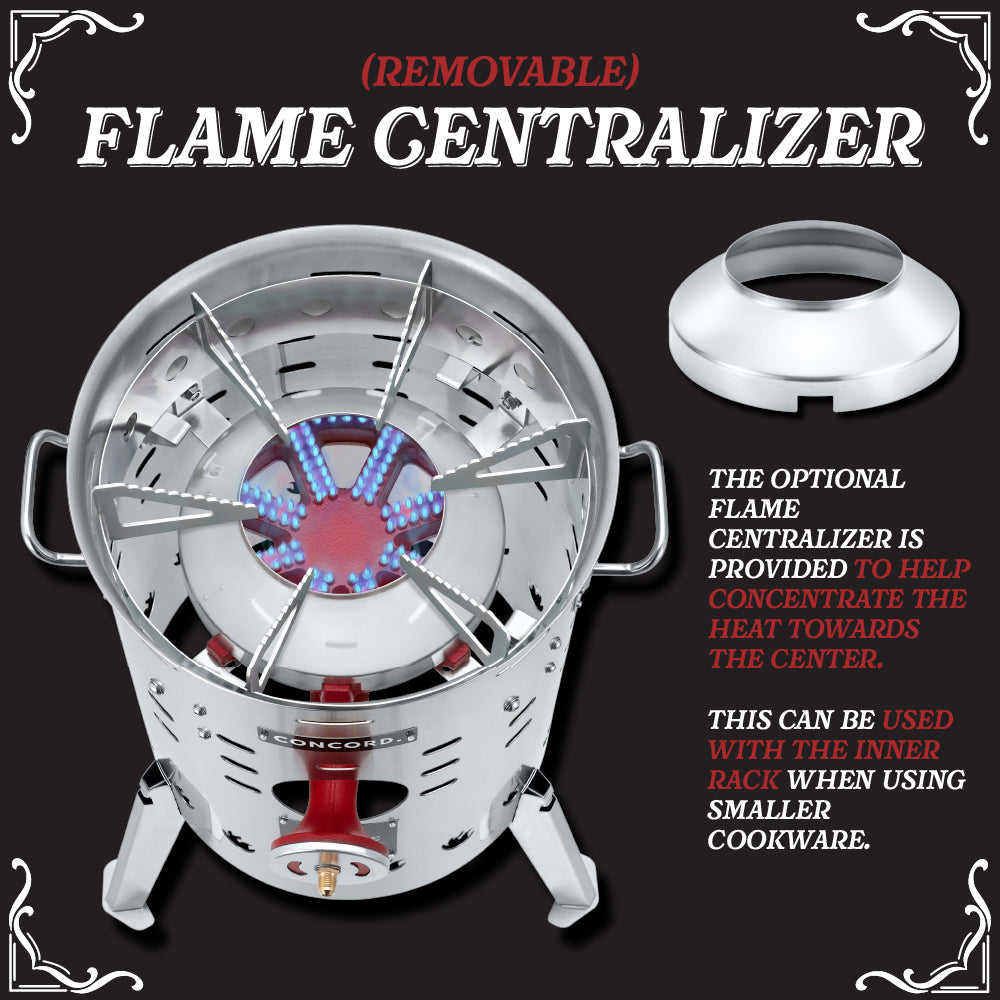 • Removable flame centralizer can be used when you need to centralize the flame for smaller cookware and woks