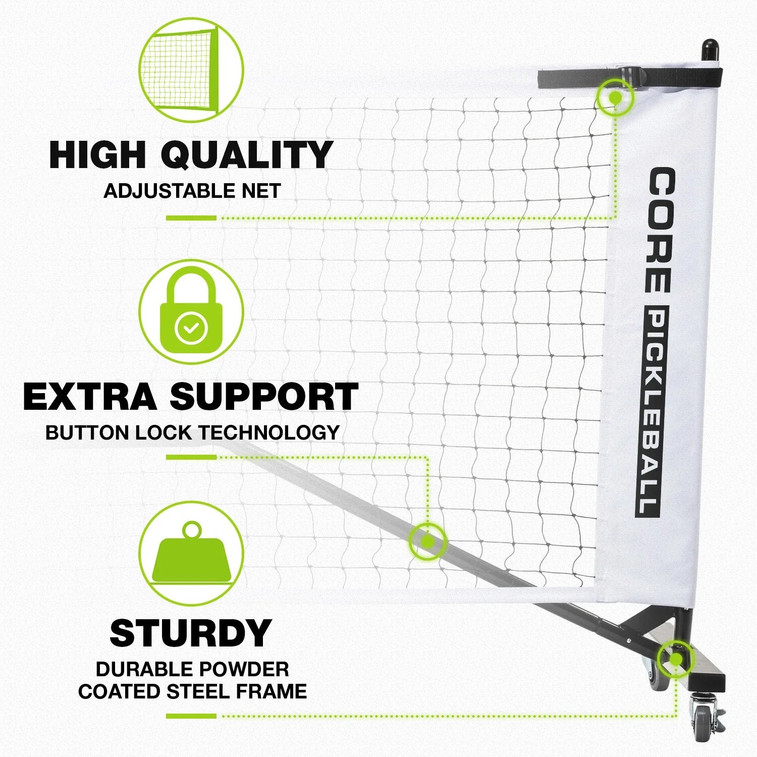 The Deluxe Pickleball Net is regulation size and built with wheels for easy transport. Suitable for competitive or recreational play.