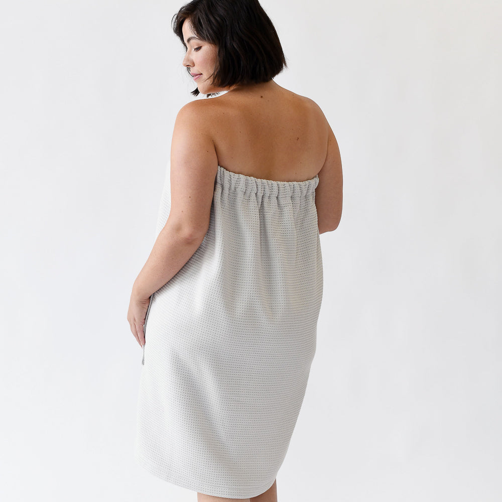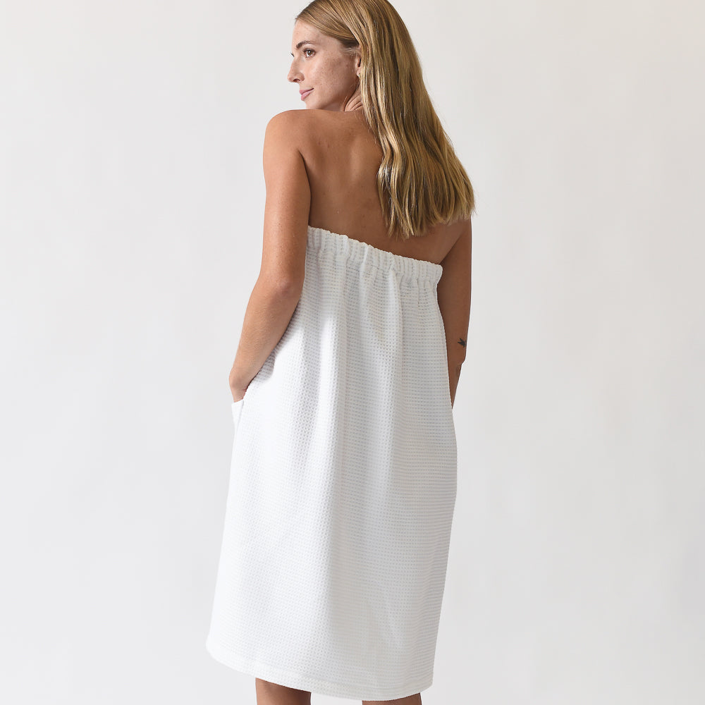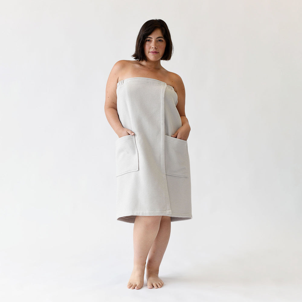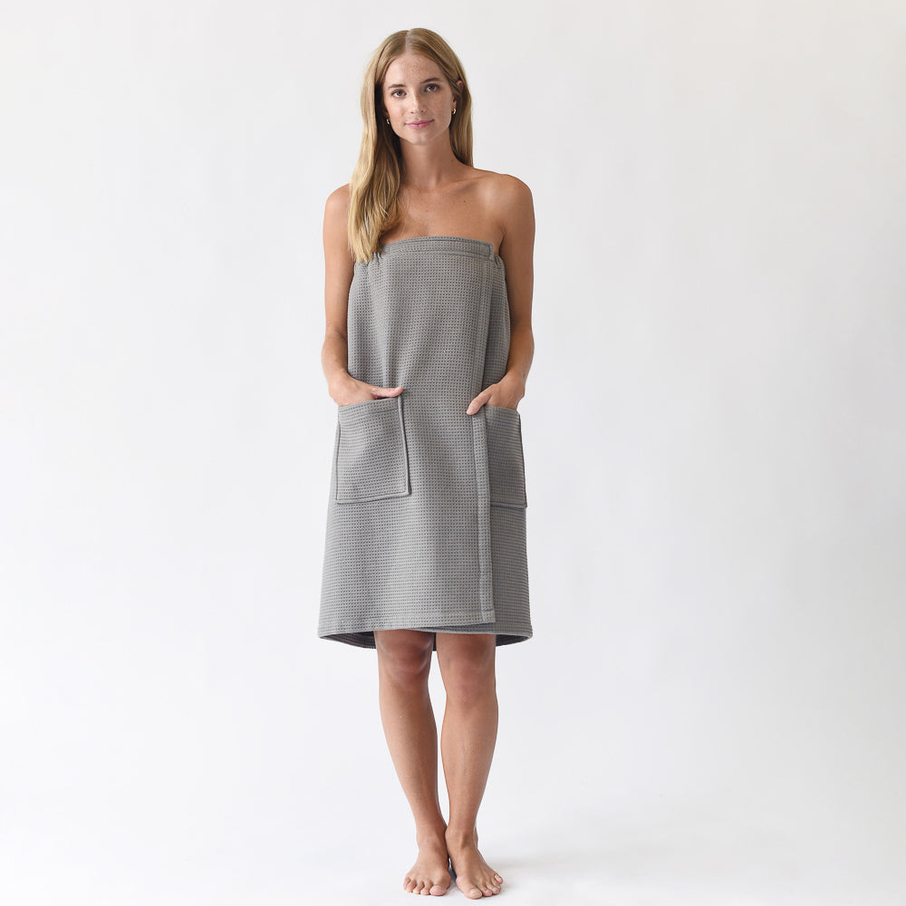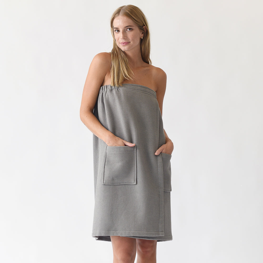 If you’re looking for a hands-free towel, the Waffle Bath Wrap is an ideal option. Featuring flexible elastic around the back, it provides a customizable fit for most body types. Plus, large front pockets were added to hold your phone, makeup brushes, and more!