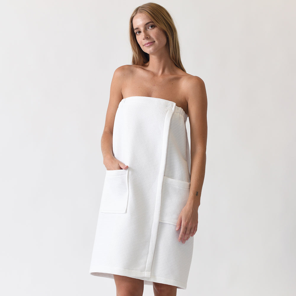 If you’re looking for a hands-free towel, the Waffle Bath Wrap is an ideal option. Featuring flexible elastic around the back, it provides a customizable fit for most body types. Plus, large front pockets were added to hold your phone, makeup brushes, and more!