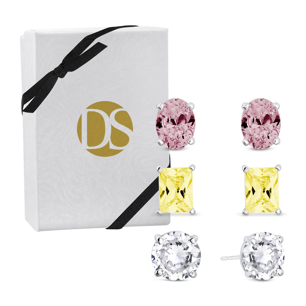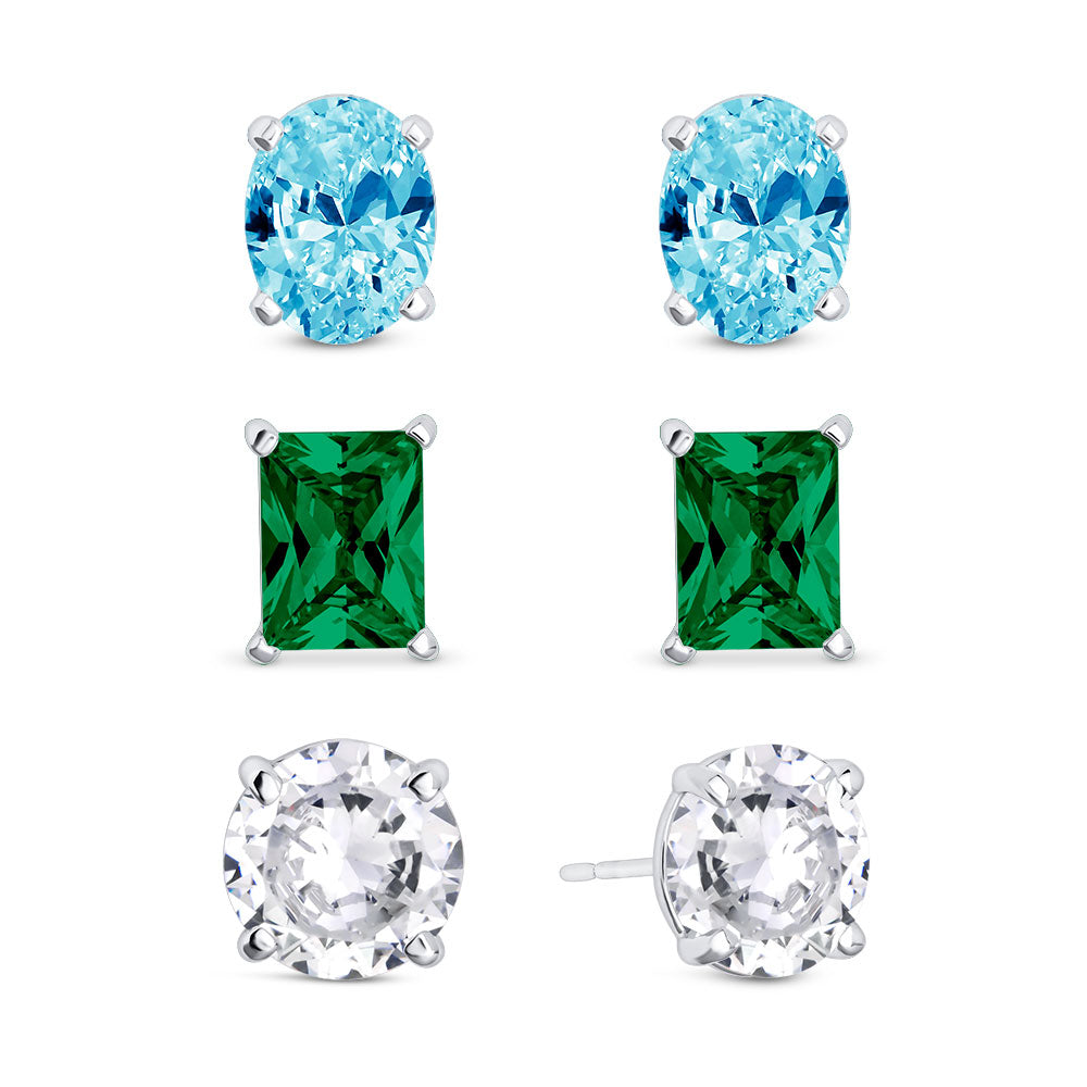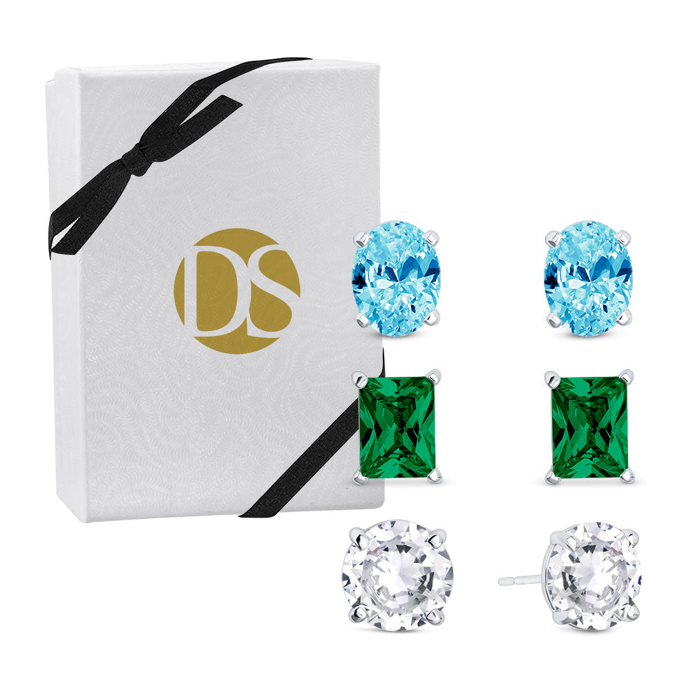 Indulge in the versatile elegance of the Shine Bright Together Earring Set, a trio of captivating earrings that harmoniously combines round, oval, and emerald-cut stones. Each earring features a prong-set stone, offering a secure, comfortable fit for everyday wear.