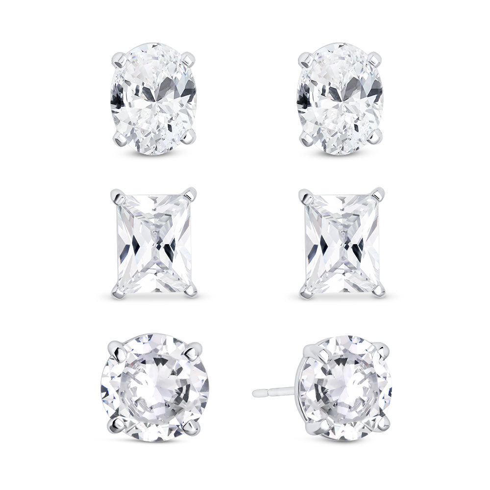 Indulge in the versatile elegance of the Sparkle Like a Star Set, a trio of captivating earrings that harmoniously combine round, oval, and emerald-cut stones for a dazzling variety. Each earring features a prong-set stone, offering a secure, comfortable fit for everyday wear.