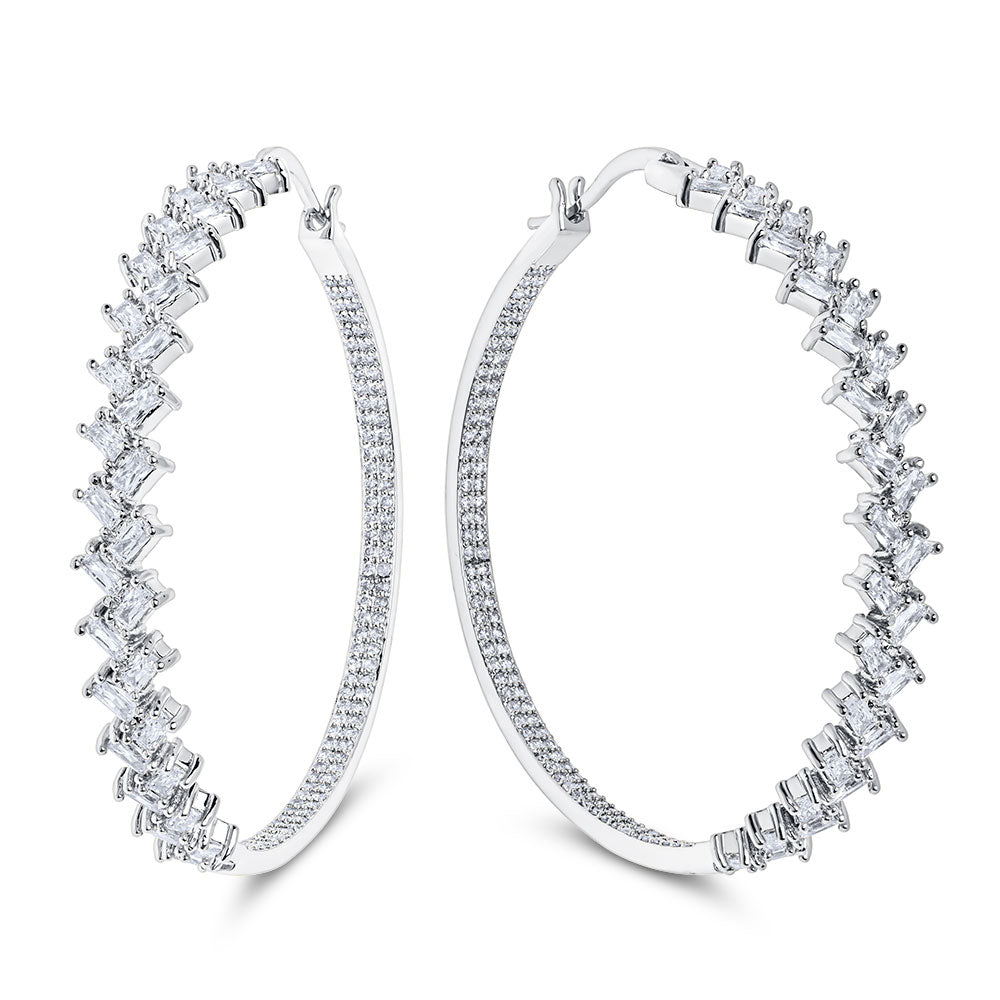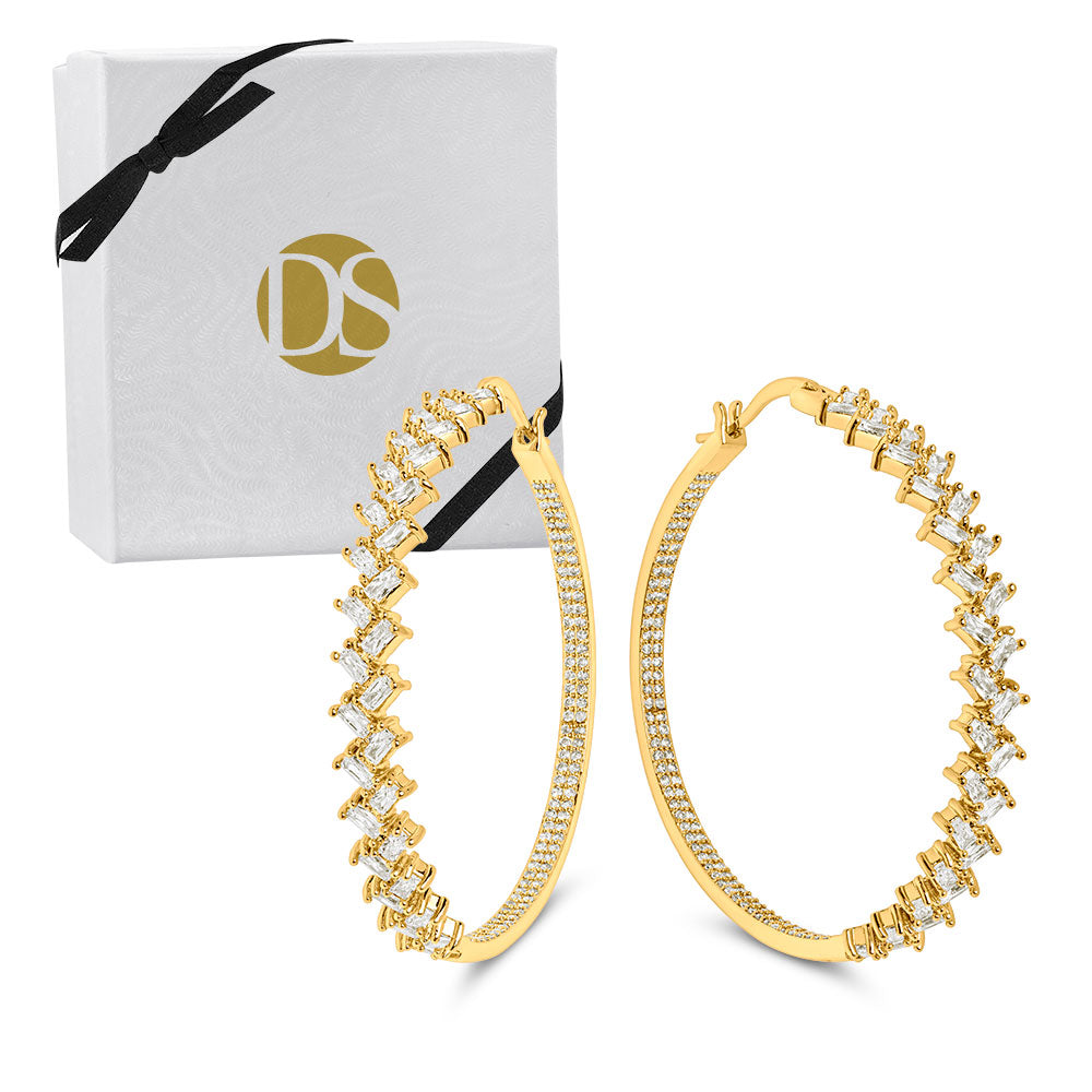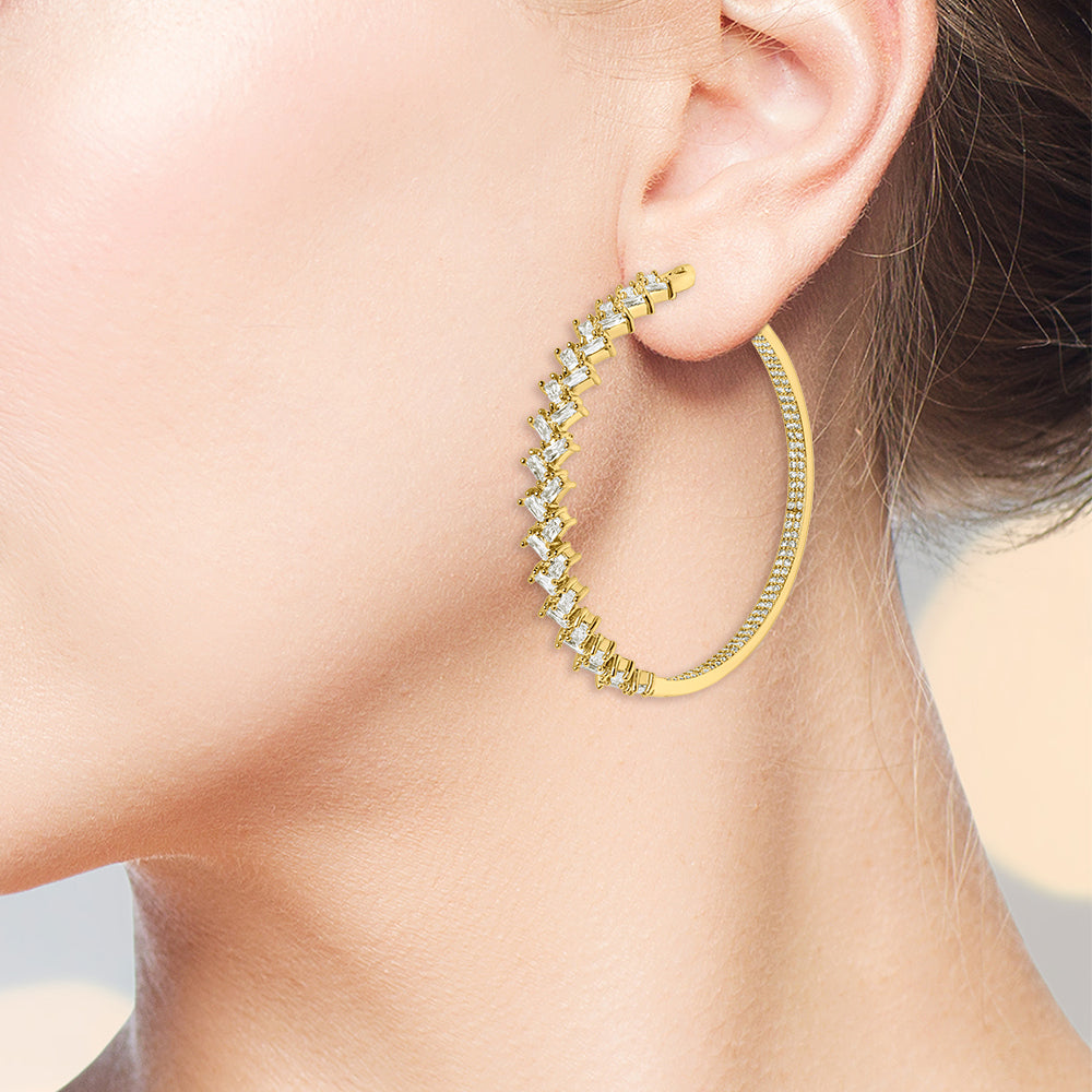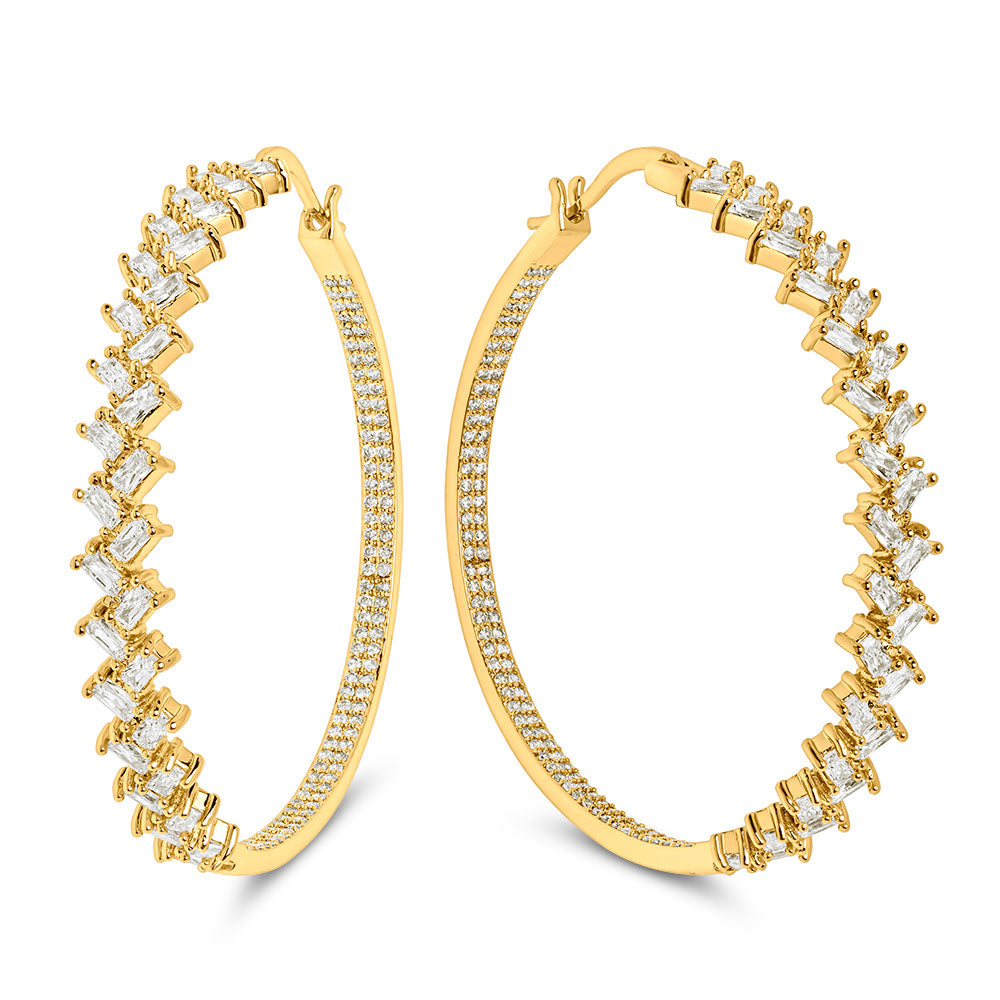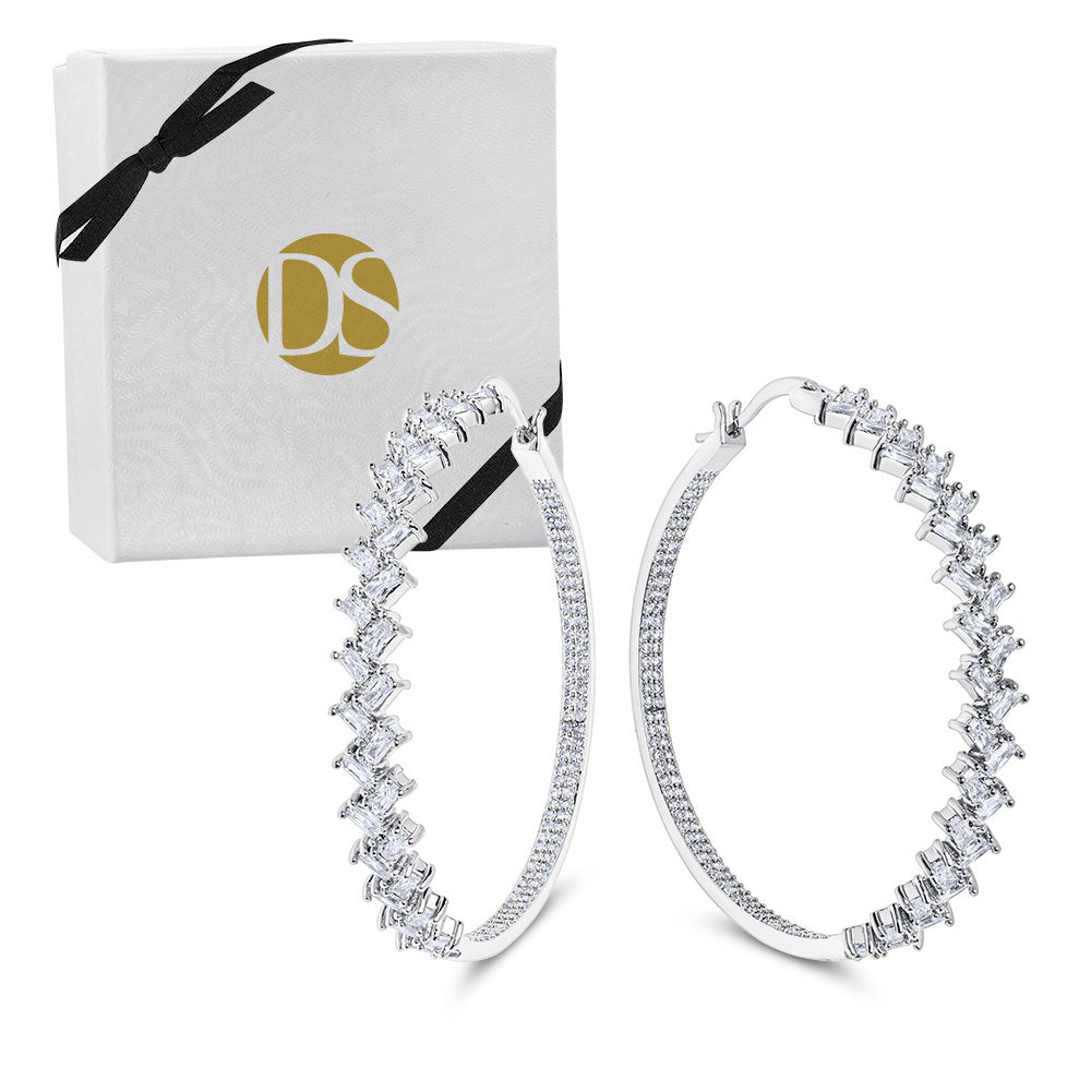 Give your glam look a bit of eye-catching dazzle in the Tiffany Hoop Earrings, featuring a 2” round hoop adorned with round and baguette stones. This type of earring turns heads when you flaunt it with your favorite cocktail dress. Simply too feisty to leave at home!