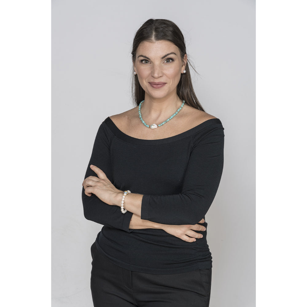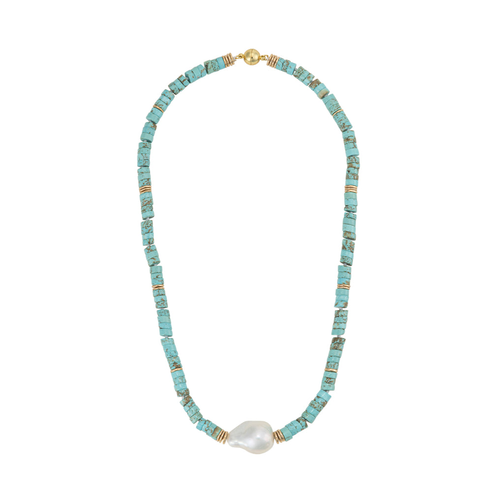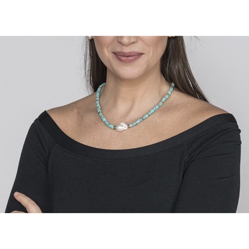 This necklace showcases a prominent Biwa pearl at its center and blue turquoise, making it a refined statement piece.