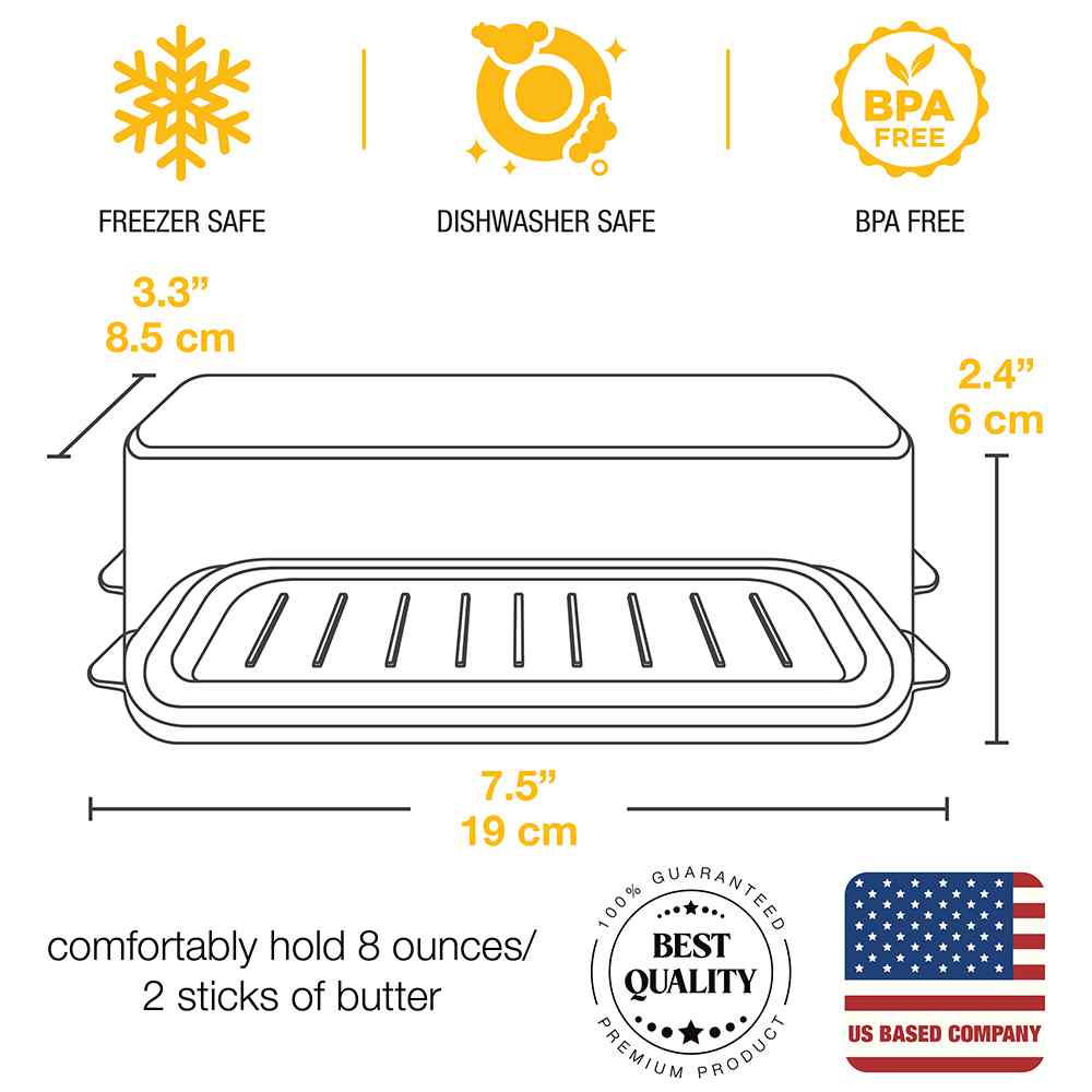 Have fresh, soft butter available for spreading conveniently waiting on your countertop. This attractive, versatile butter dish is made of quality BPA-free plastic and features built-in measurement markers for recipe execution. In addition to butter, it’s great for storing a variety of foods, such as cream cheese, cookies, spices, and more.