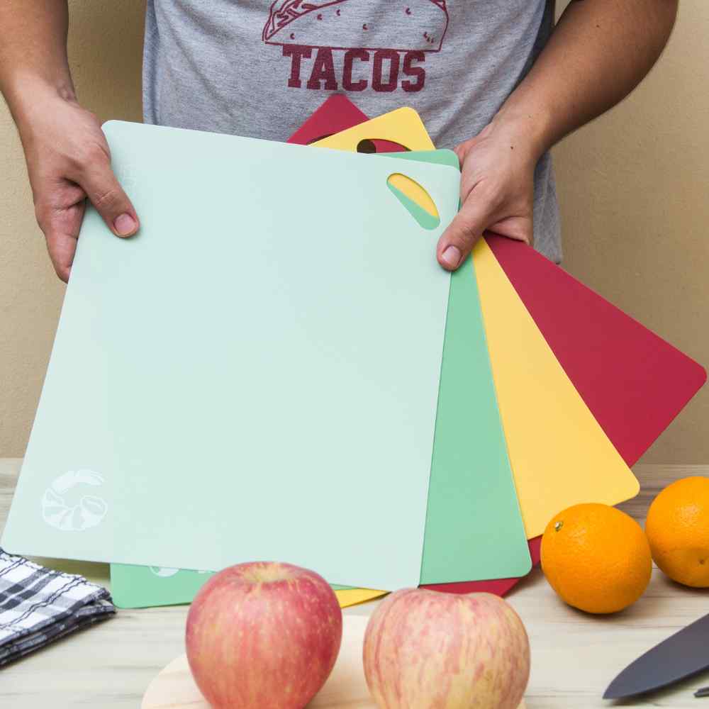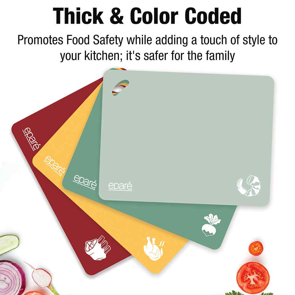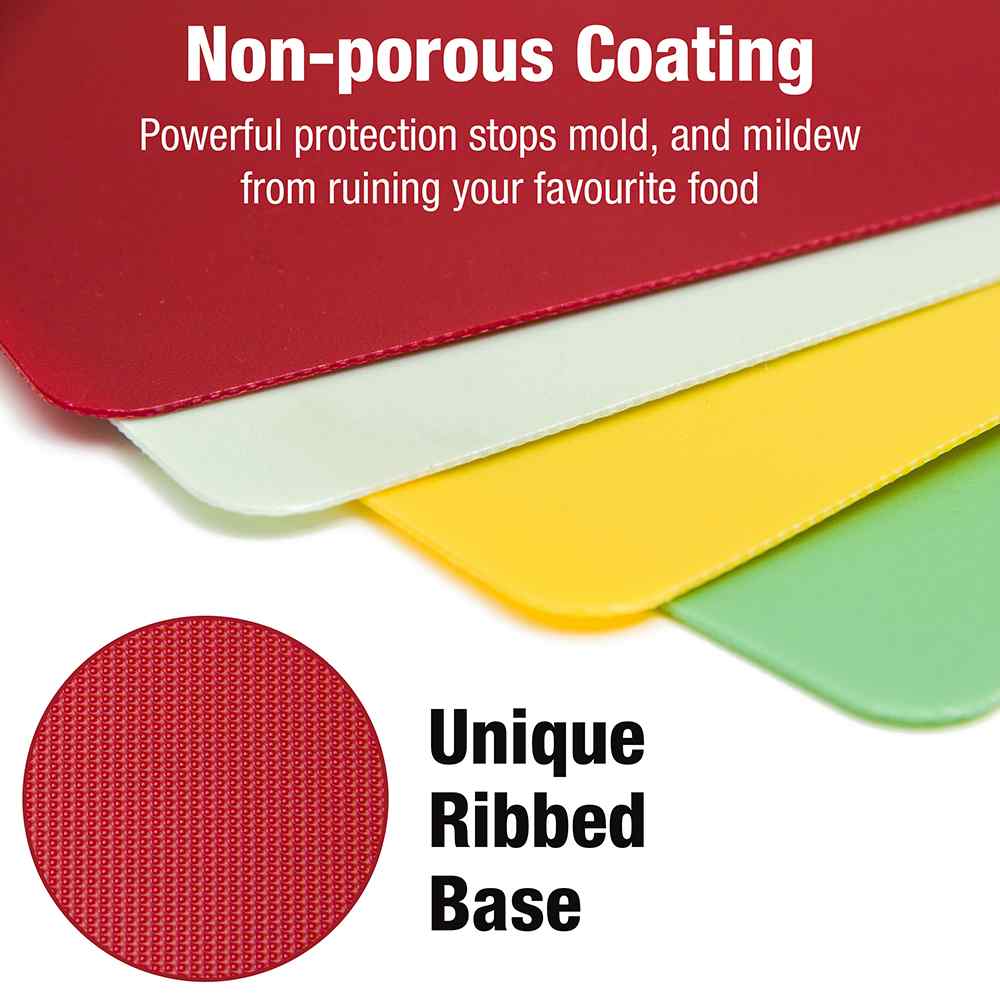 Prep your meals with confidence and ease using this set of color-coded cutting mats. Designed for safe, hygienic food preparation, each BPA-free mat is labeled by color to help prevent cross-contamination between meats, seafood, vegetables, and fruits. The textured, waffle-grip bottom prevents slipping on countertops, while the flexible, non-stick surface makes it easy to transfer chopped ingredients straight into the pan.
