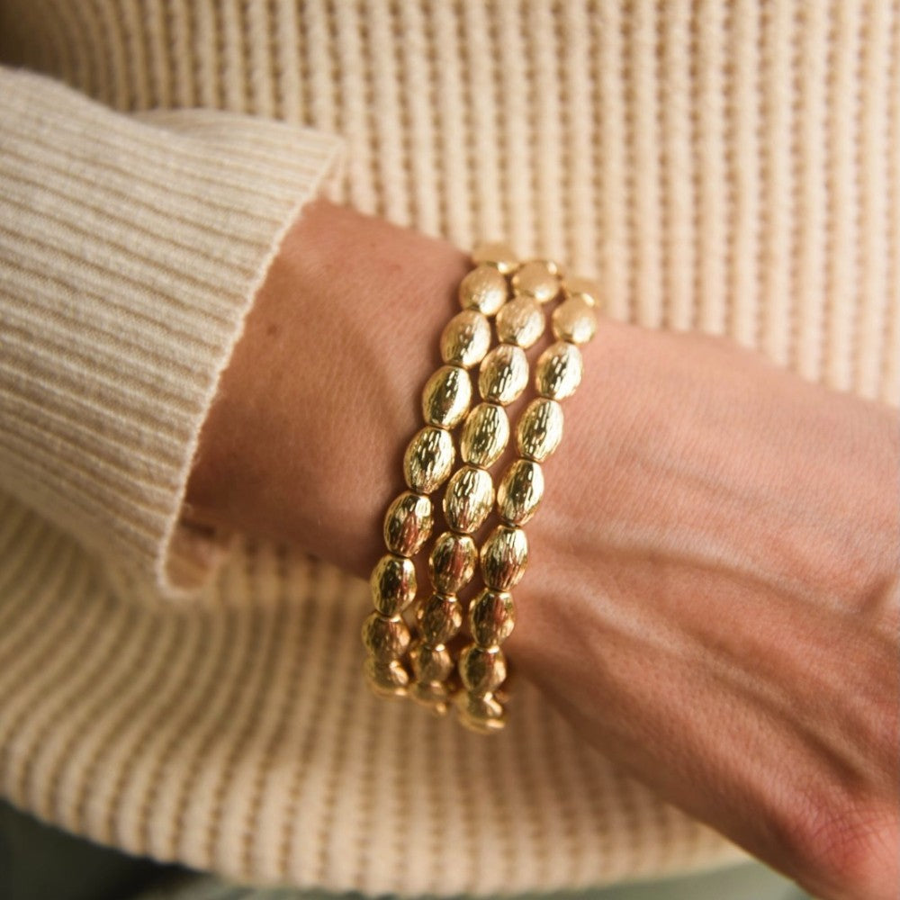 These three textured gold bracelets are crafted with effortless chic, ease, and are a fresh take on an everyday stack. The ideal size, weight, and shape make them easy to wear solo or integrate them with your favorite bangles, bracelets, watch, or stack.