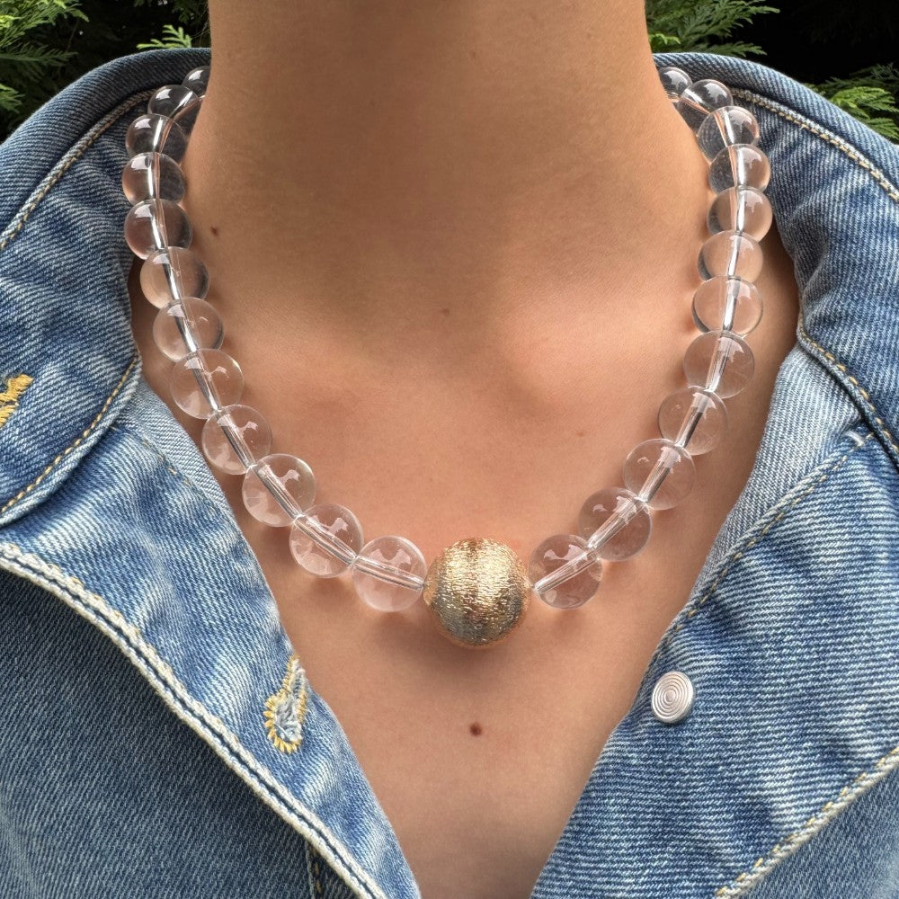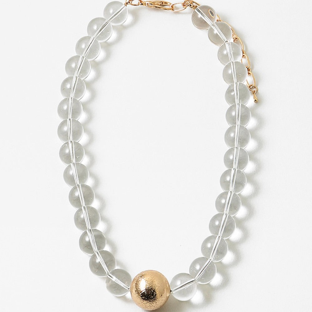 This Clear Lucite and Gold Ball Necklace makes the coolest statement piece. Created from oversized clear beads and textured gold balls, this piece pairs seamlessly with any look.