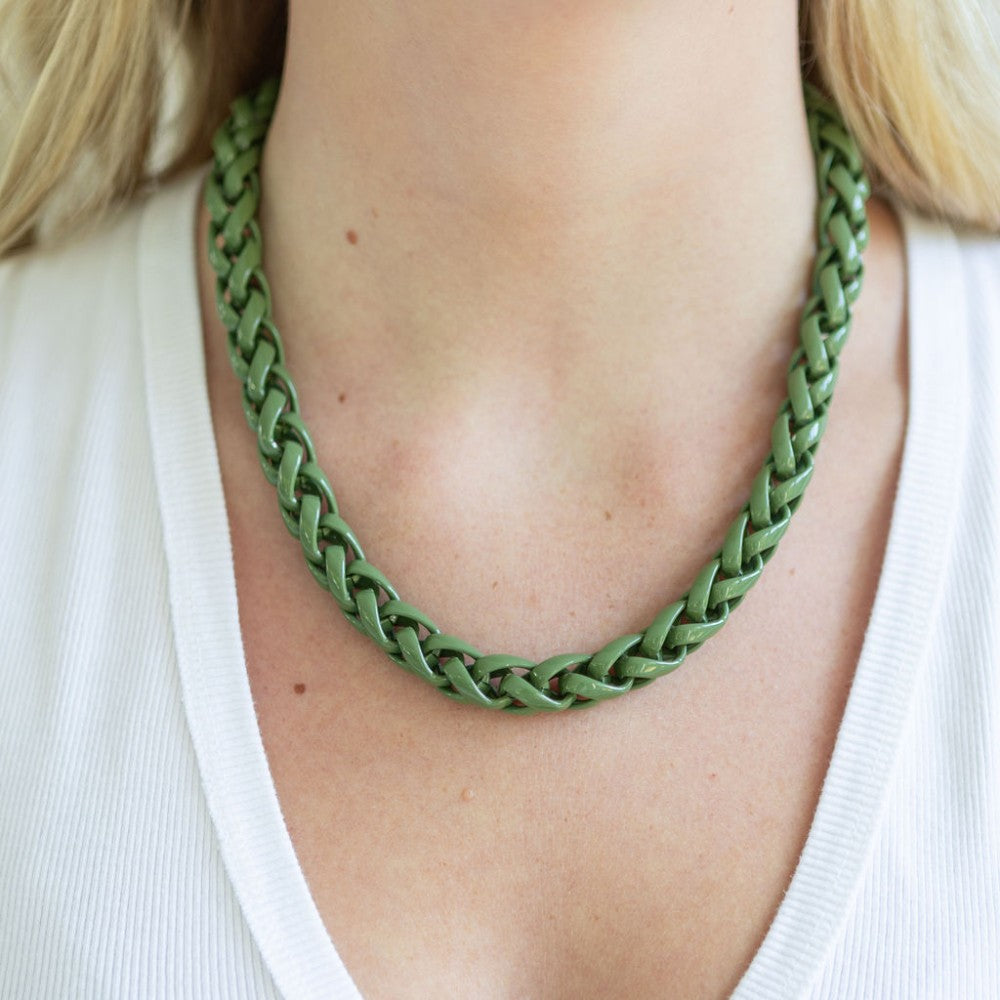 What’s not to love about this color, texture, shape, length, and look? The olive enamel coating covering this metal necklace creates an elevated look that is both chic and neutral.