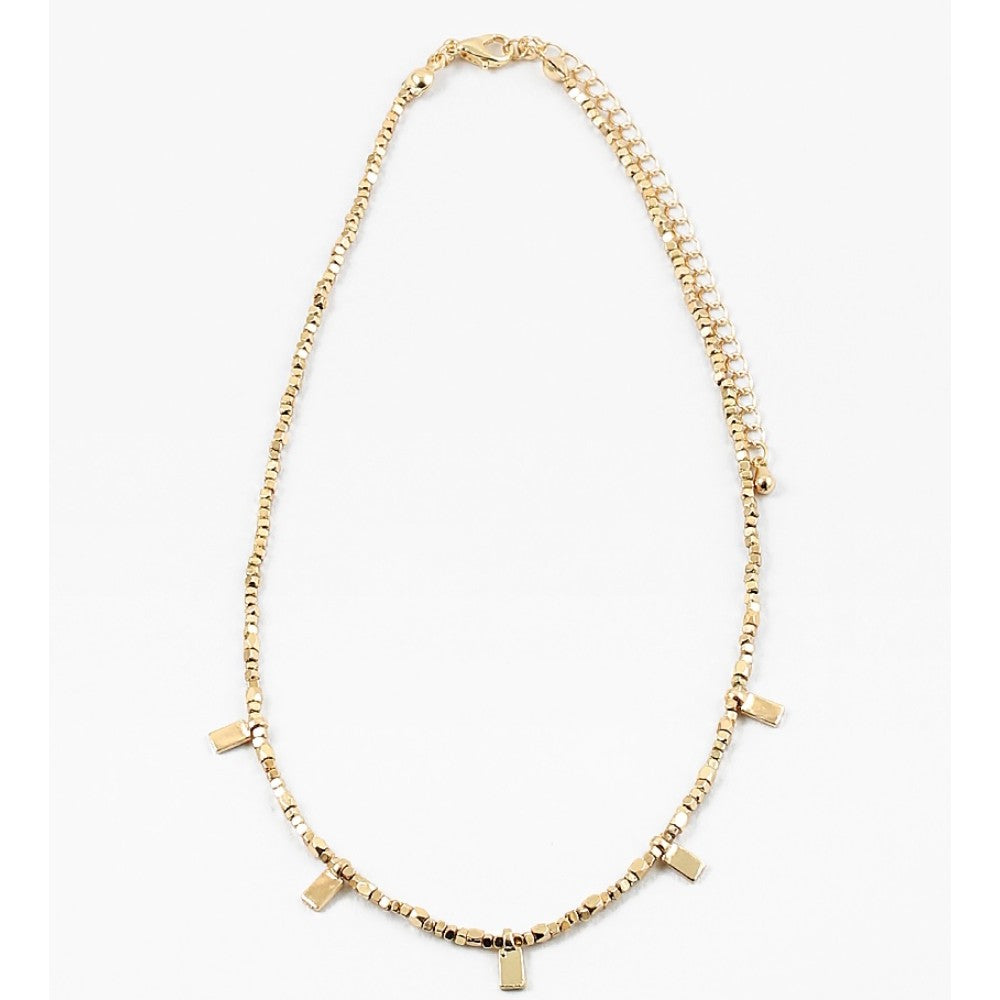 Every jewelry box needs a little gold necklace for your chic everyday uniform. This is an accessory to wear daily or gift to someone of any age. This necklace brings together tiny, gold seed beads with minimal rectangular charms for an instant golden glow.