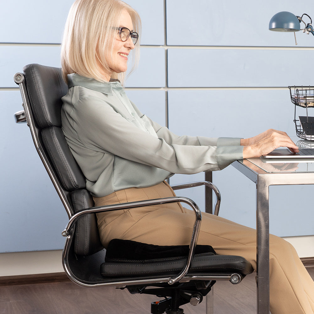 Place the cushion on your chair with the U-shaped cutout facing the back of the chair to elevate hips and reduce lower back pressure