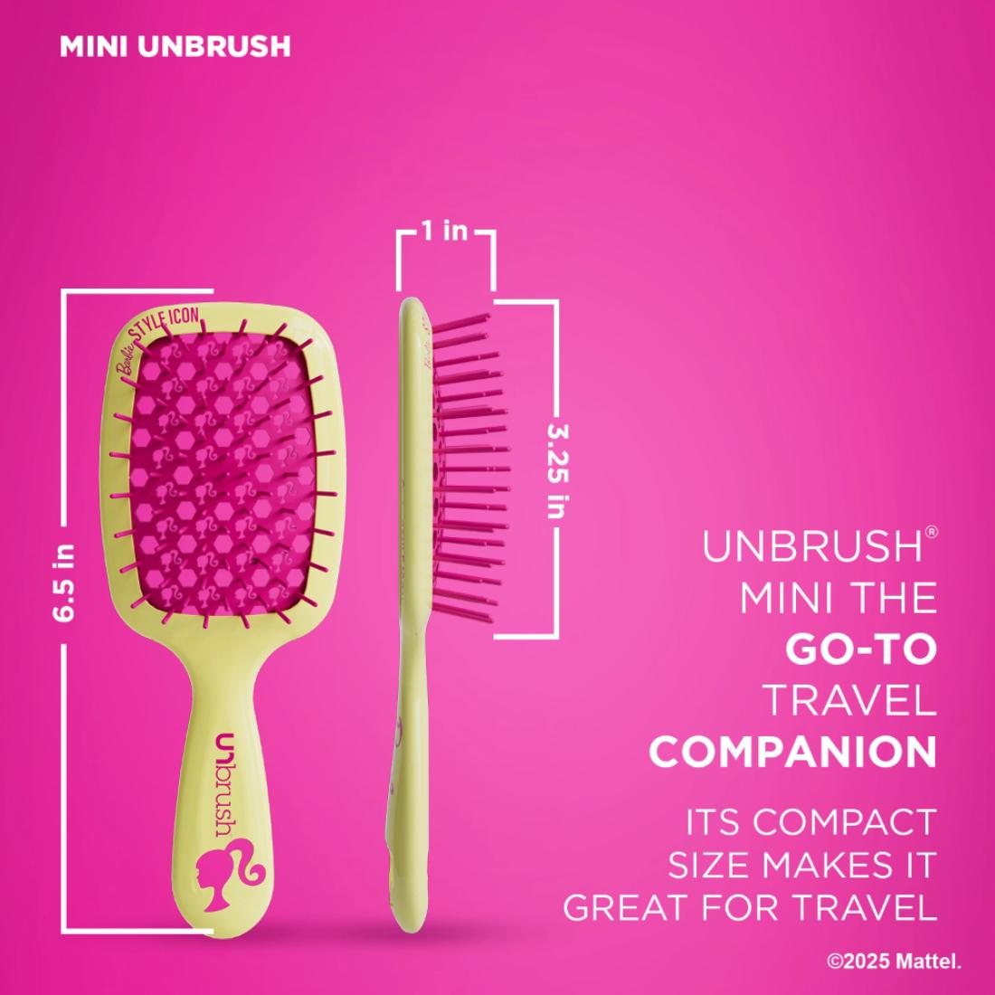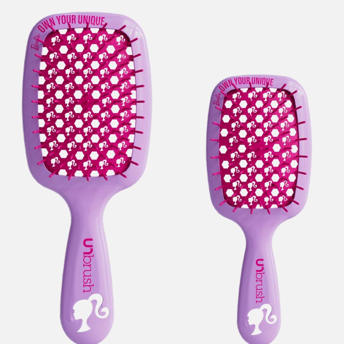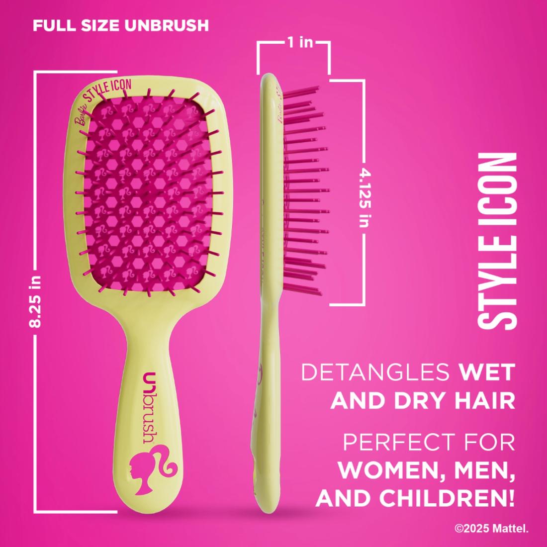 The Unbrush gift set features a full-size Unbrush and matching mini Unbrush, uniquely crafted with the silhouette of Barbie™. The Unbrush is designed to gently and thoroughly extract knots and tangles from even the most unruly hair—painlessly and easily.