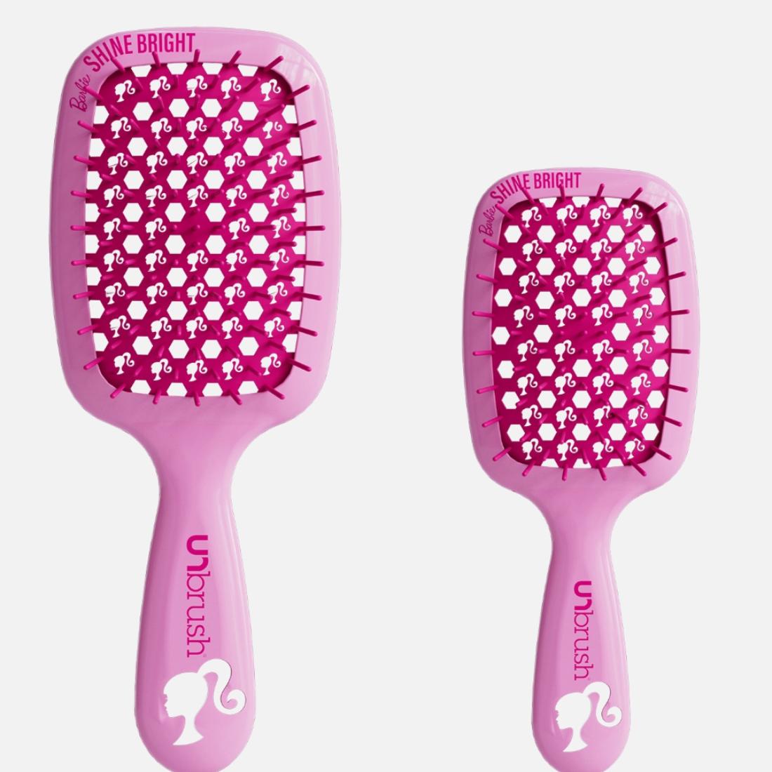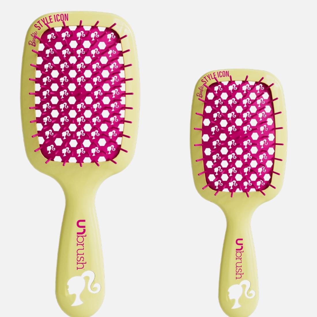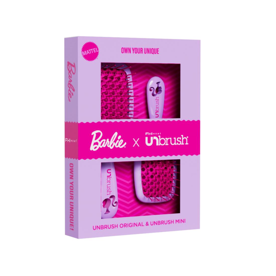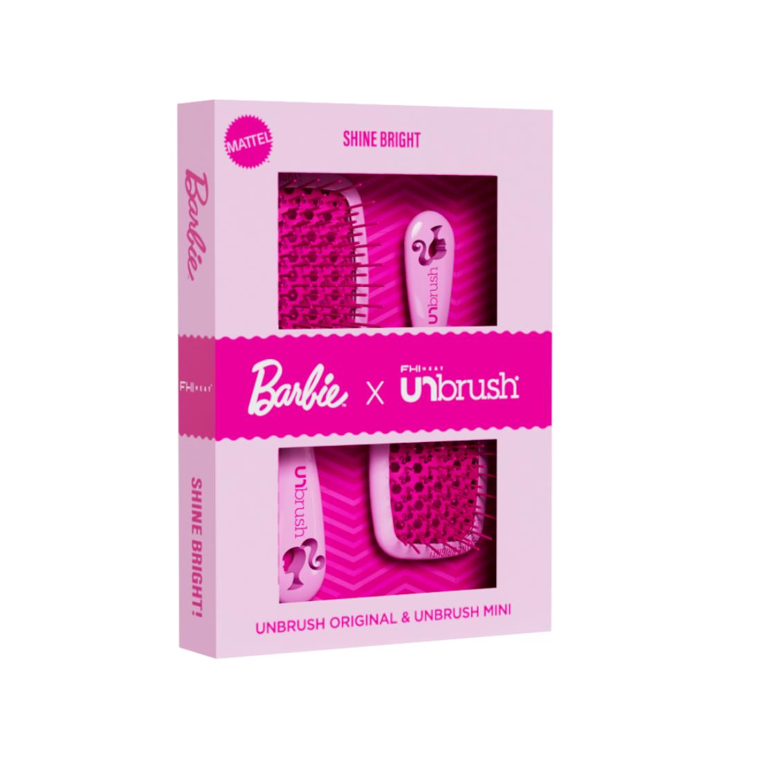 The Unbrush gift set features a full-size Unbrush and matching mini Unbrush, uniquely crafted with the silhouette of Barbie™. The Unbrush is designed to gently and thoroughly extract knots and tangles from even the most unruly hair—painlessly and easily.