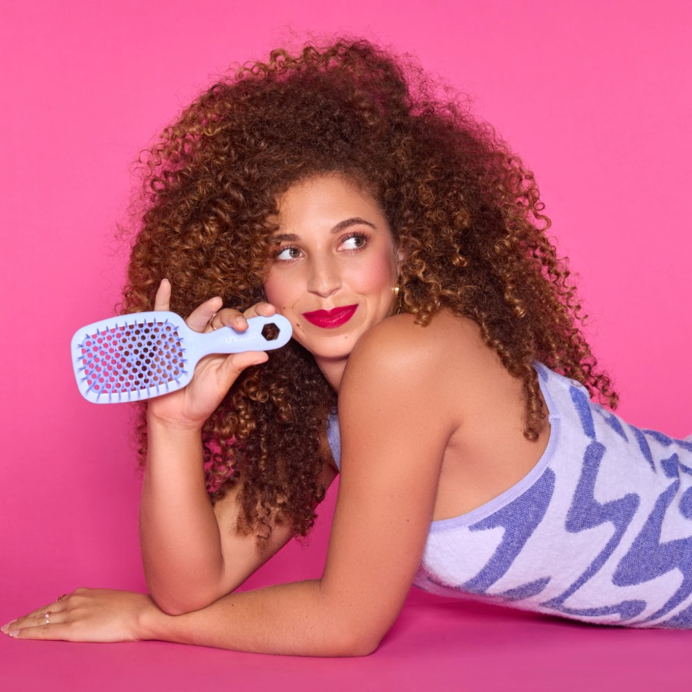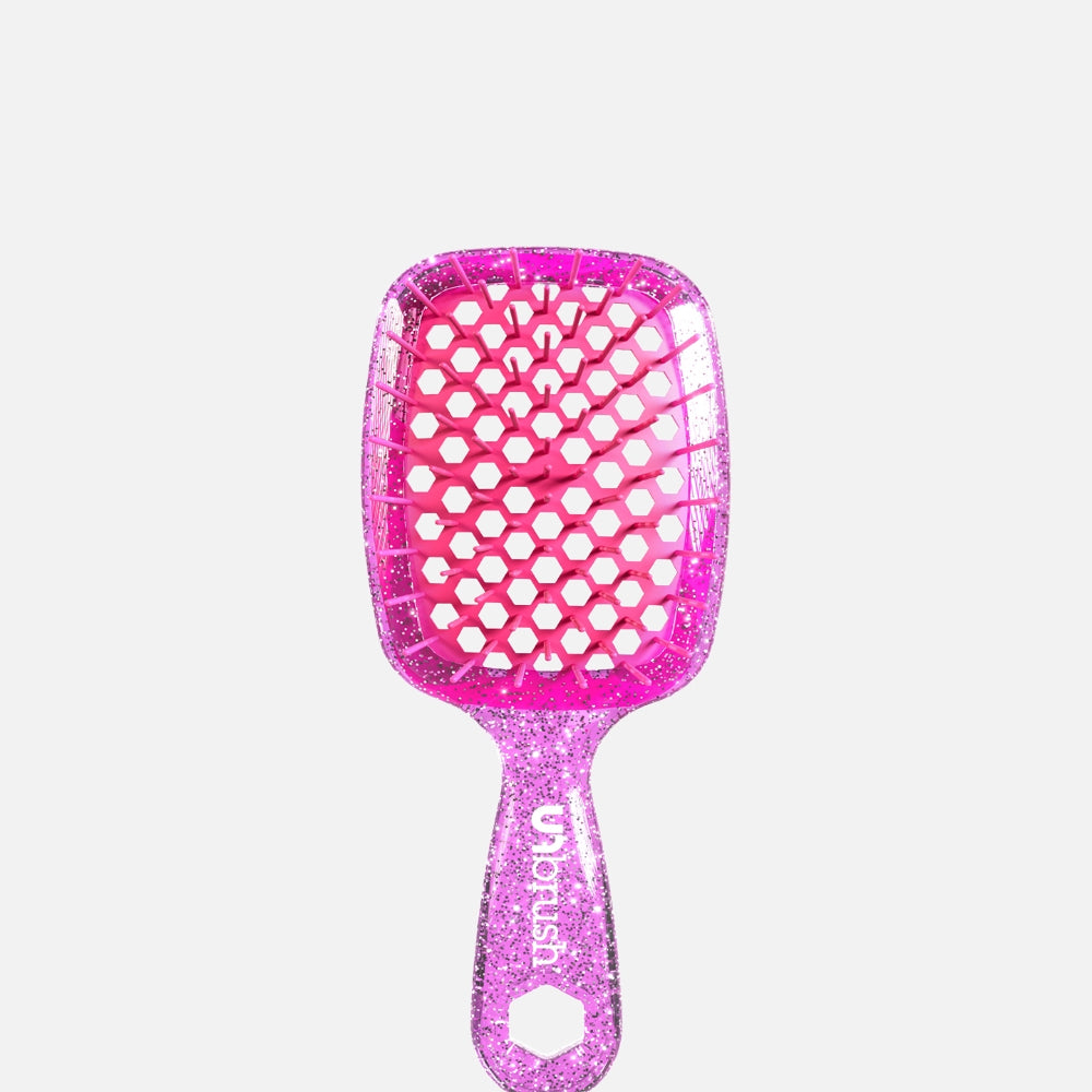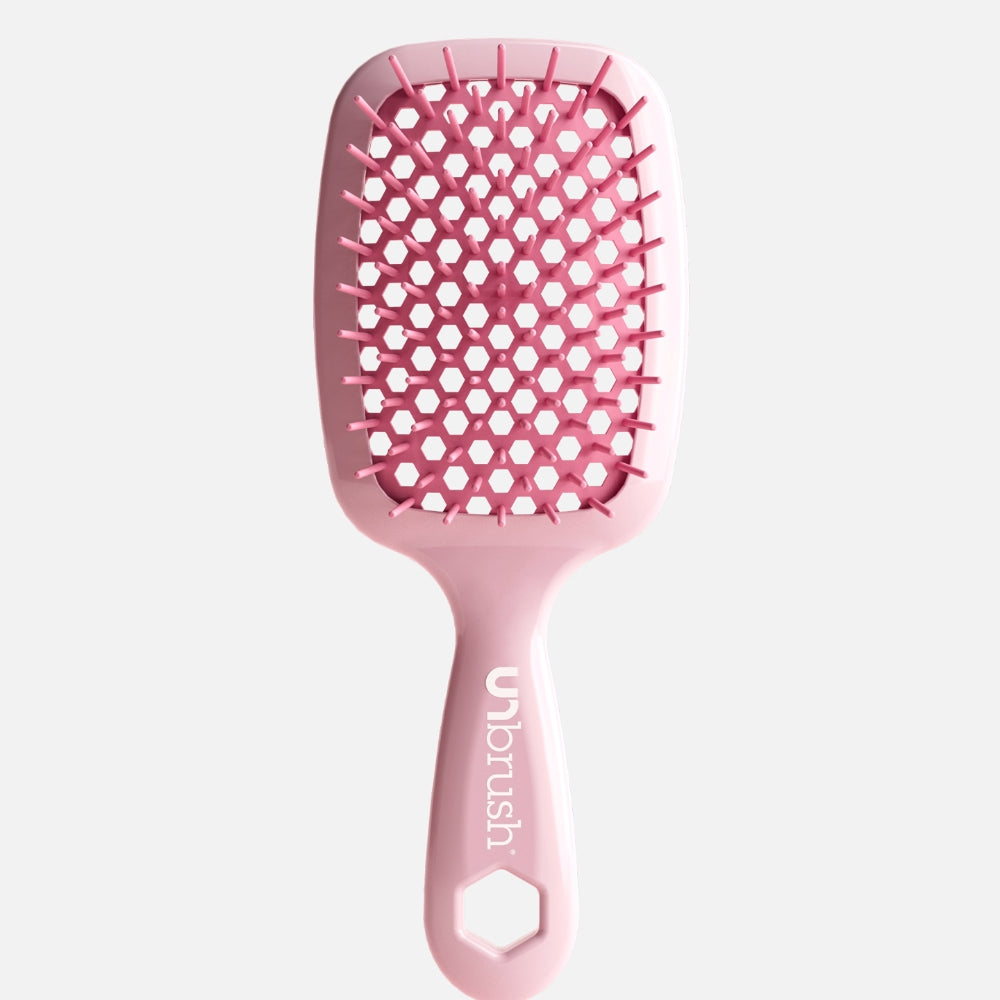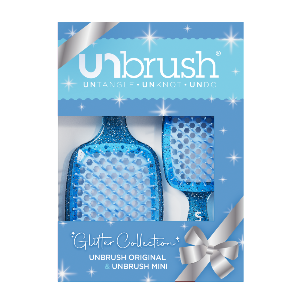 The Unbrush gift set features a full-size Unbrush and matching mini Unbrush. The Unbrush is designed to gently and thoroughly extract knots and tangles from even the most unruly hair—painlessly and easily.