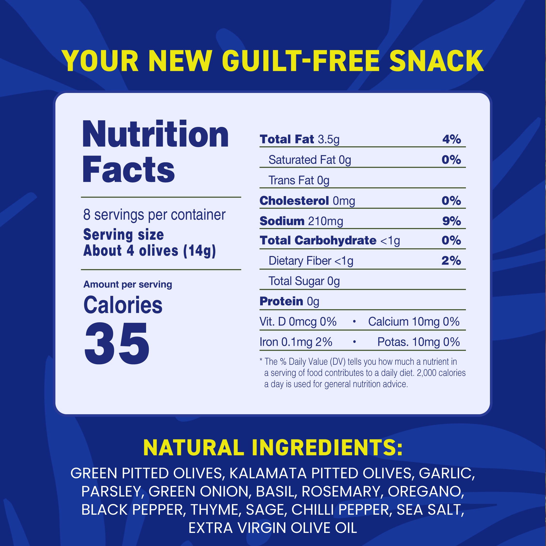 Green Pitted Olives, Kalamata Pitted Olives, Garlic, Parsley, Green Onion, Basil, Rosemary, Oregano, Black Pepper, Thyme, Sage, Chili Pepper, Sea Salt, Extra Virgin Olive Oil (EVOO)