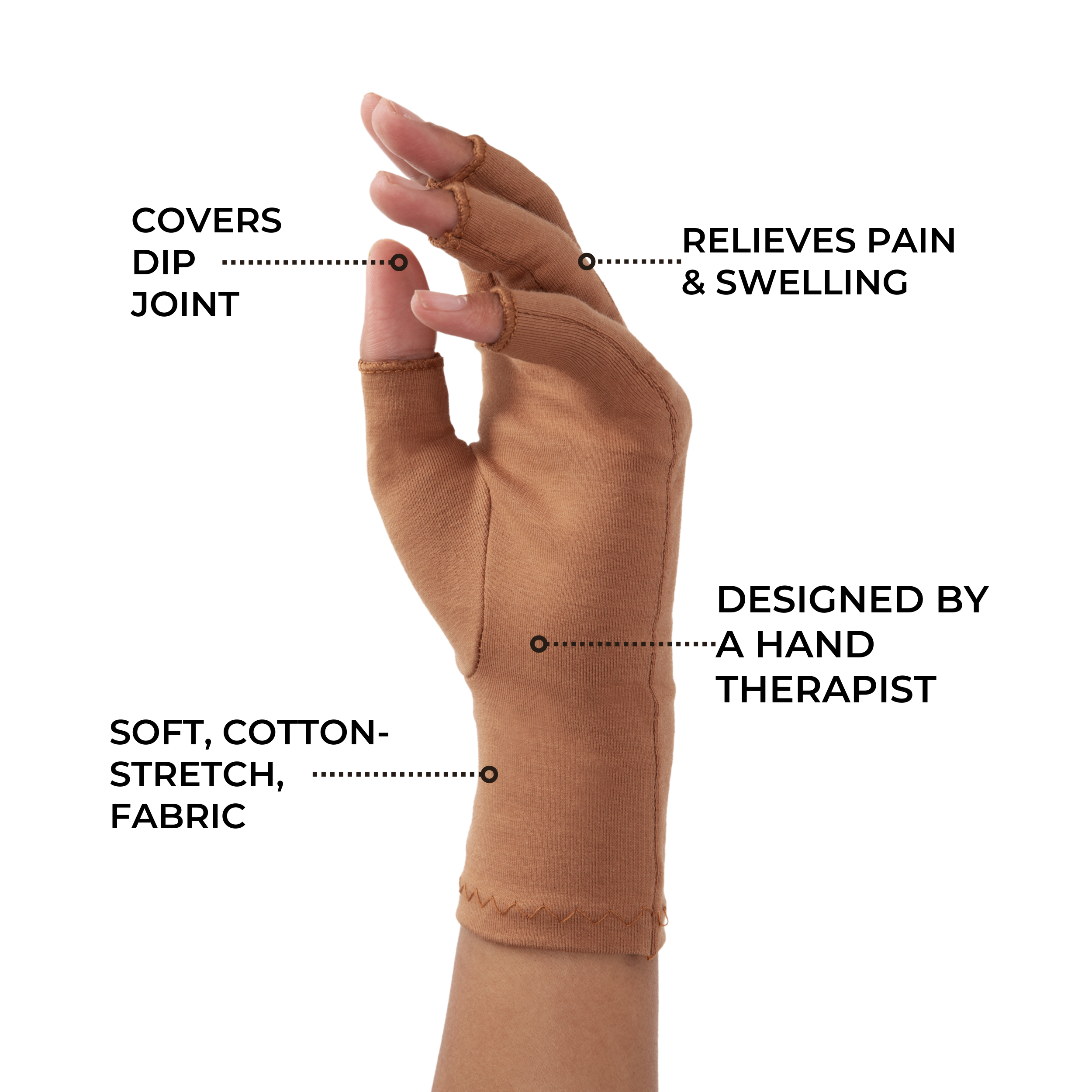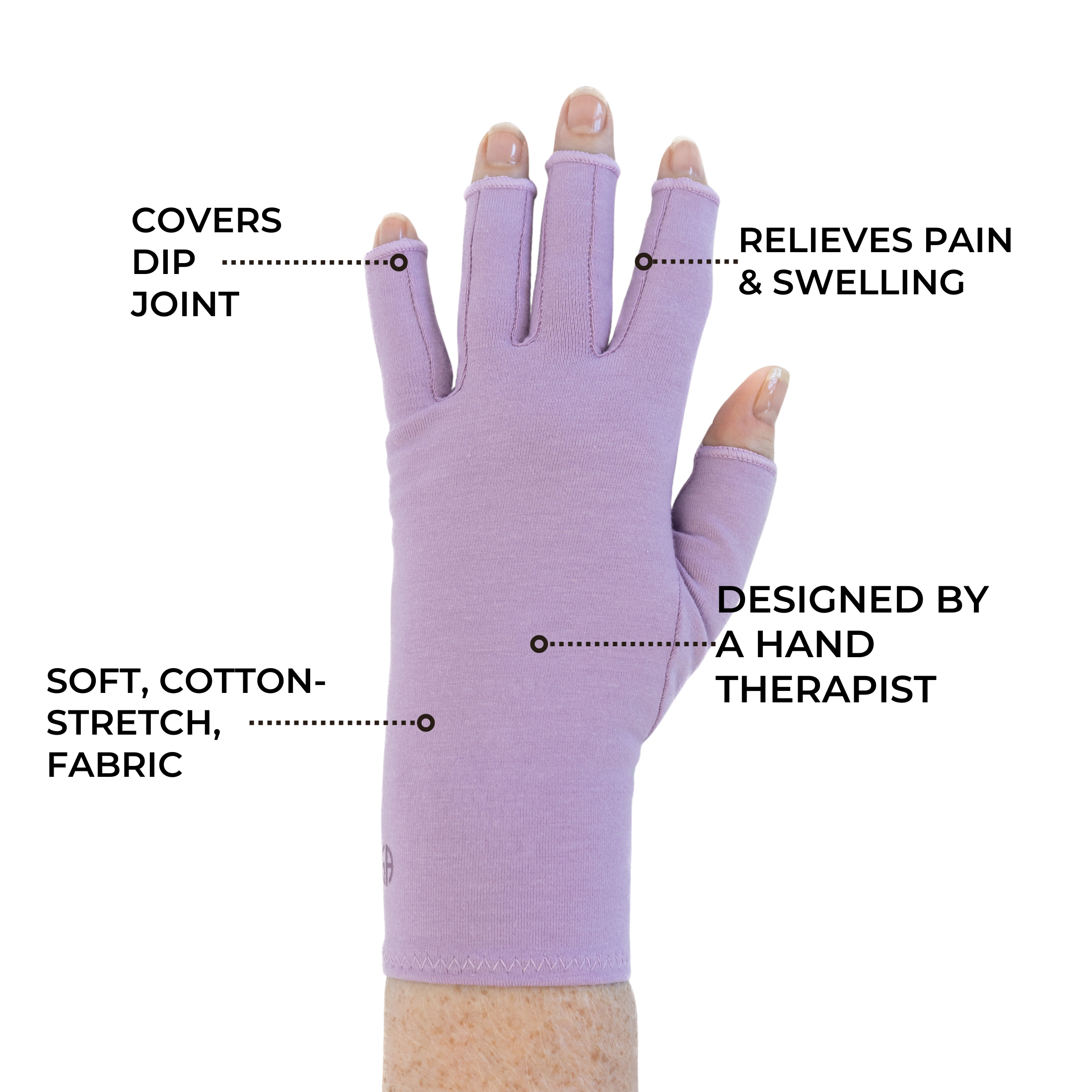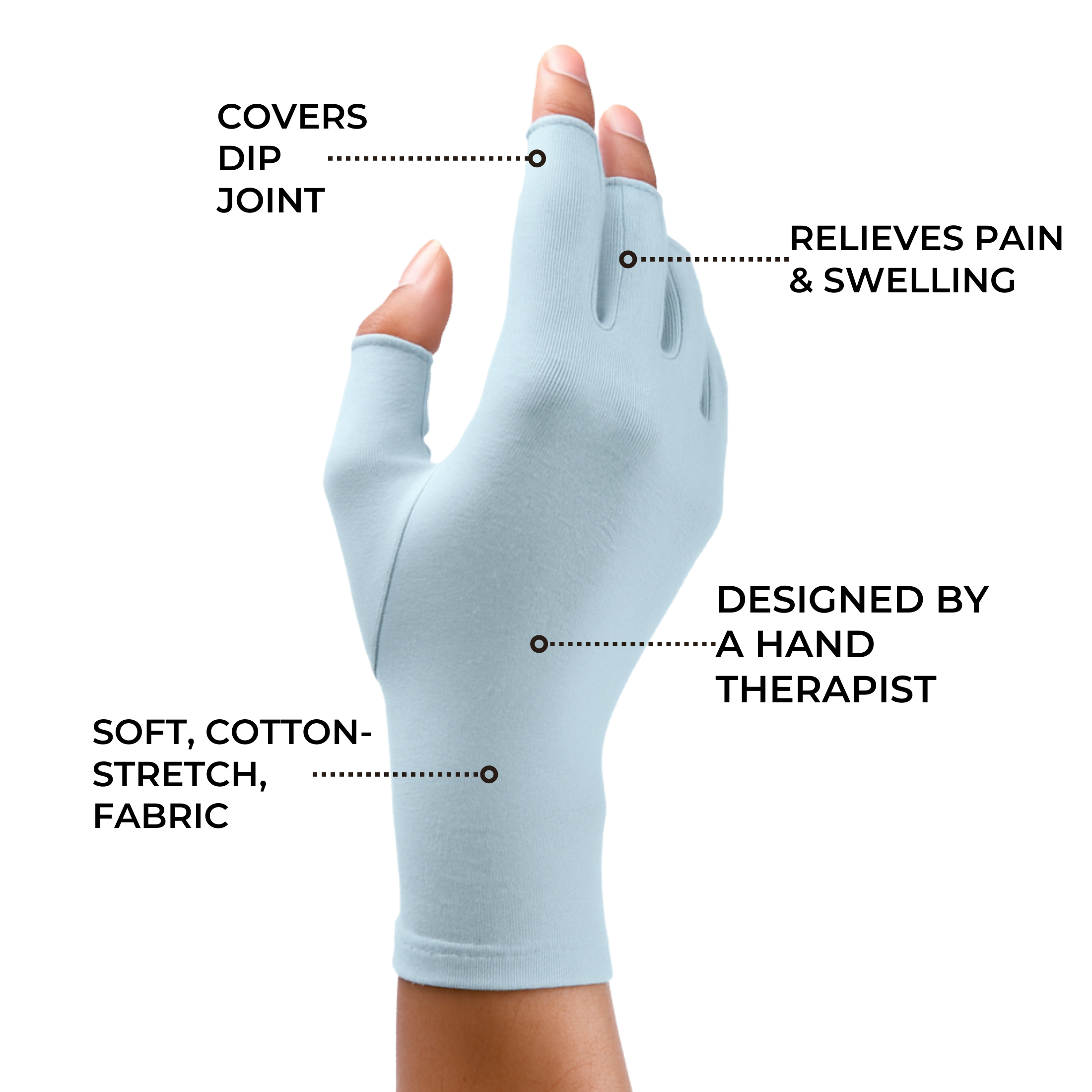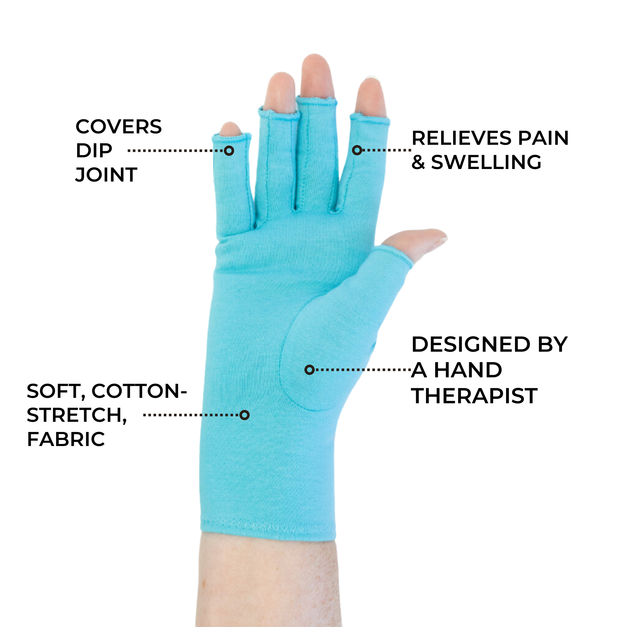 Get a hug for your hand! Gentle compression soothes sore fingers and supports sore joints. Designed by a hand therapist to relieve arthritic pain and swelling these gloves are great for people living with trigger finger, osteoarthritis, rheumatoid arthritis, EDS (hypermobility), neuropathy, and more.