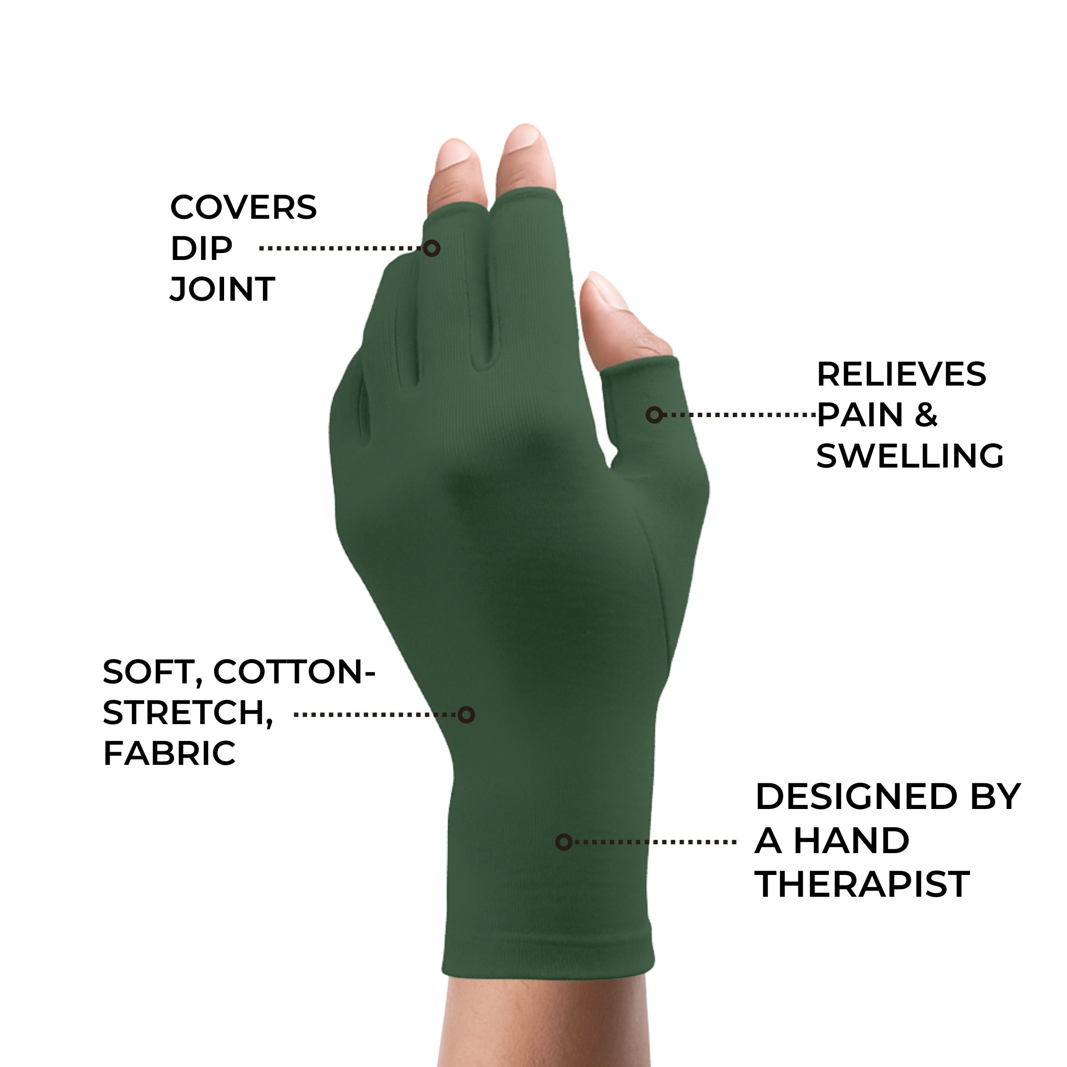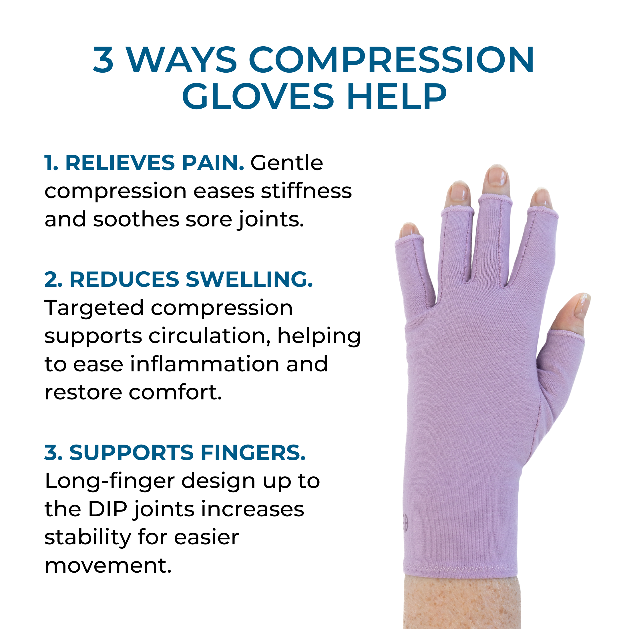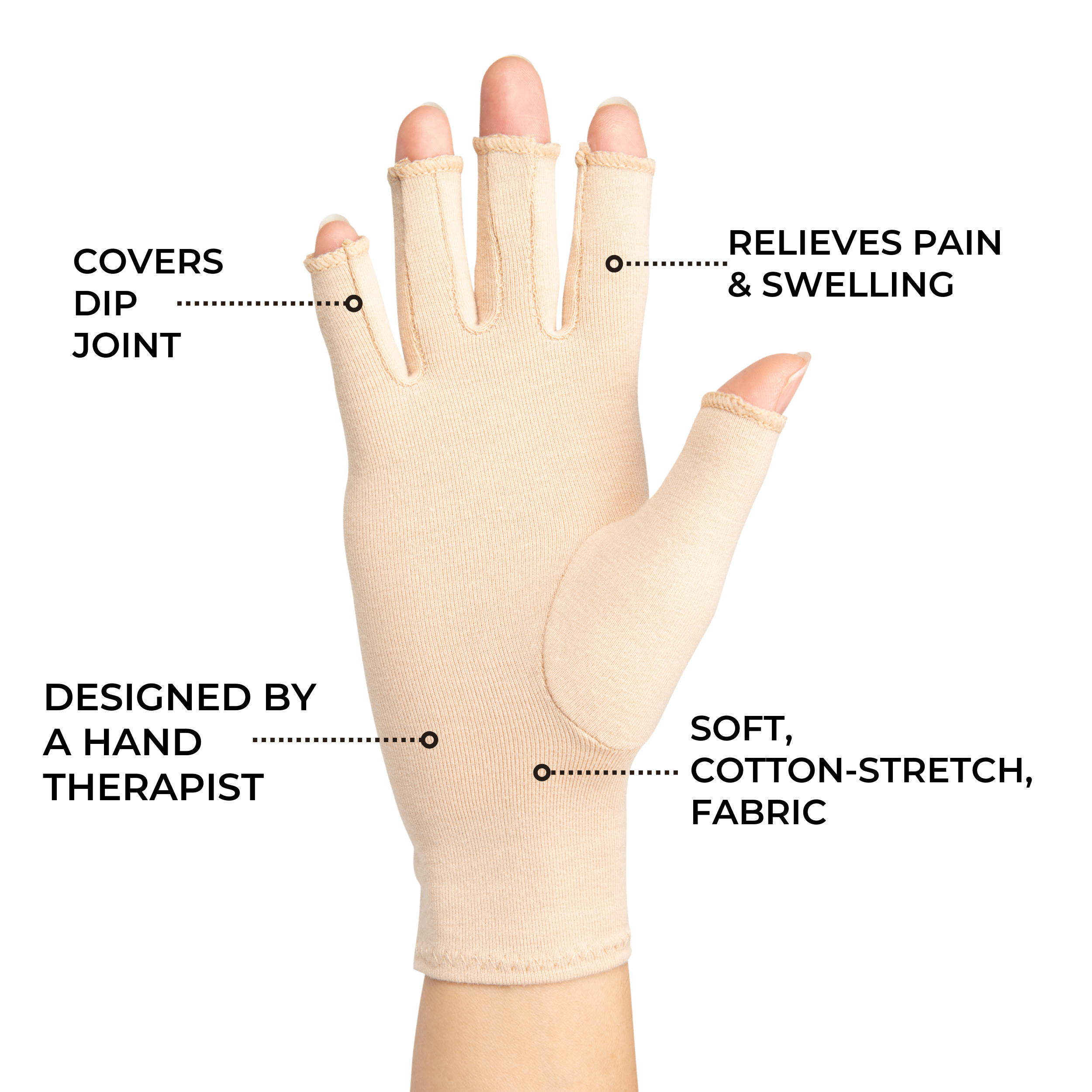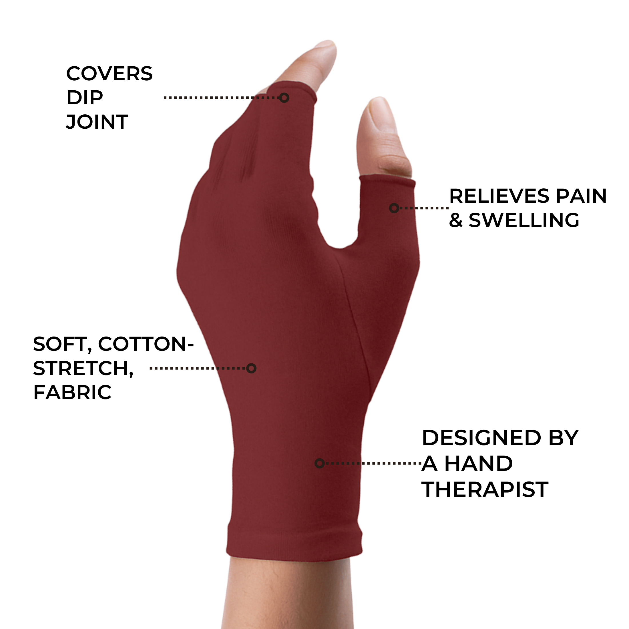 Get a hug for your hand! Gentle compression soothes sore fingers and supports sore joints. Designed by a hand therapist to relieve arthritic pain and swelling these gloves are great for people living with trigger finger, osteoarthritis, rheumatoid arthritis, EDS (hypermobility), neuropathy, and more.