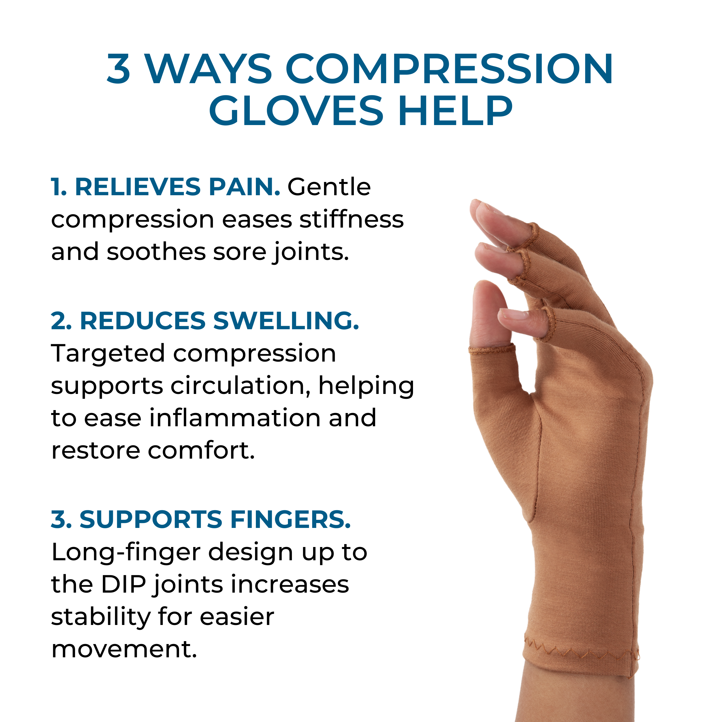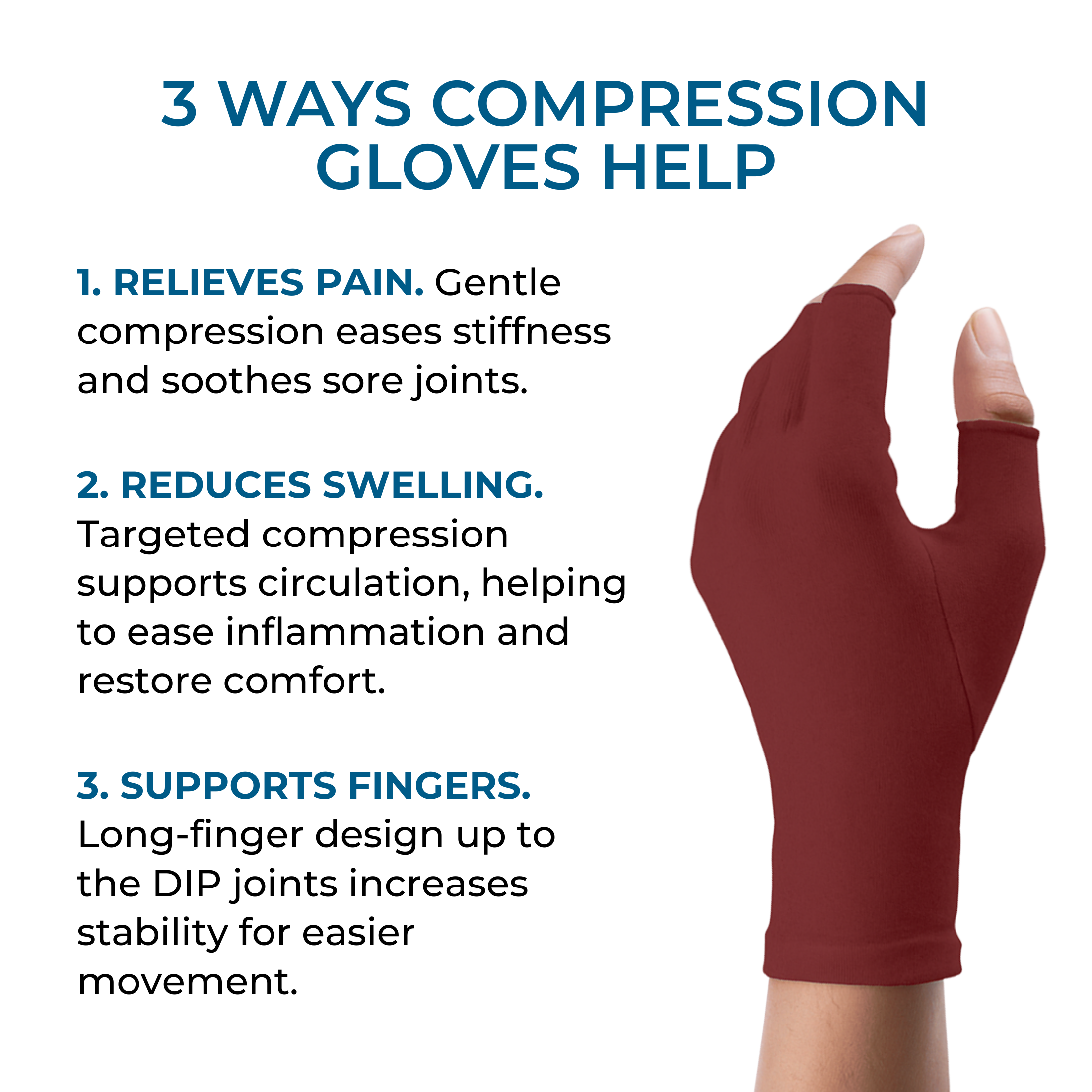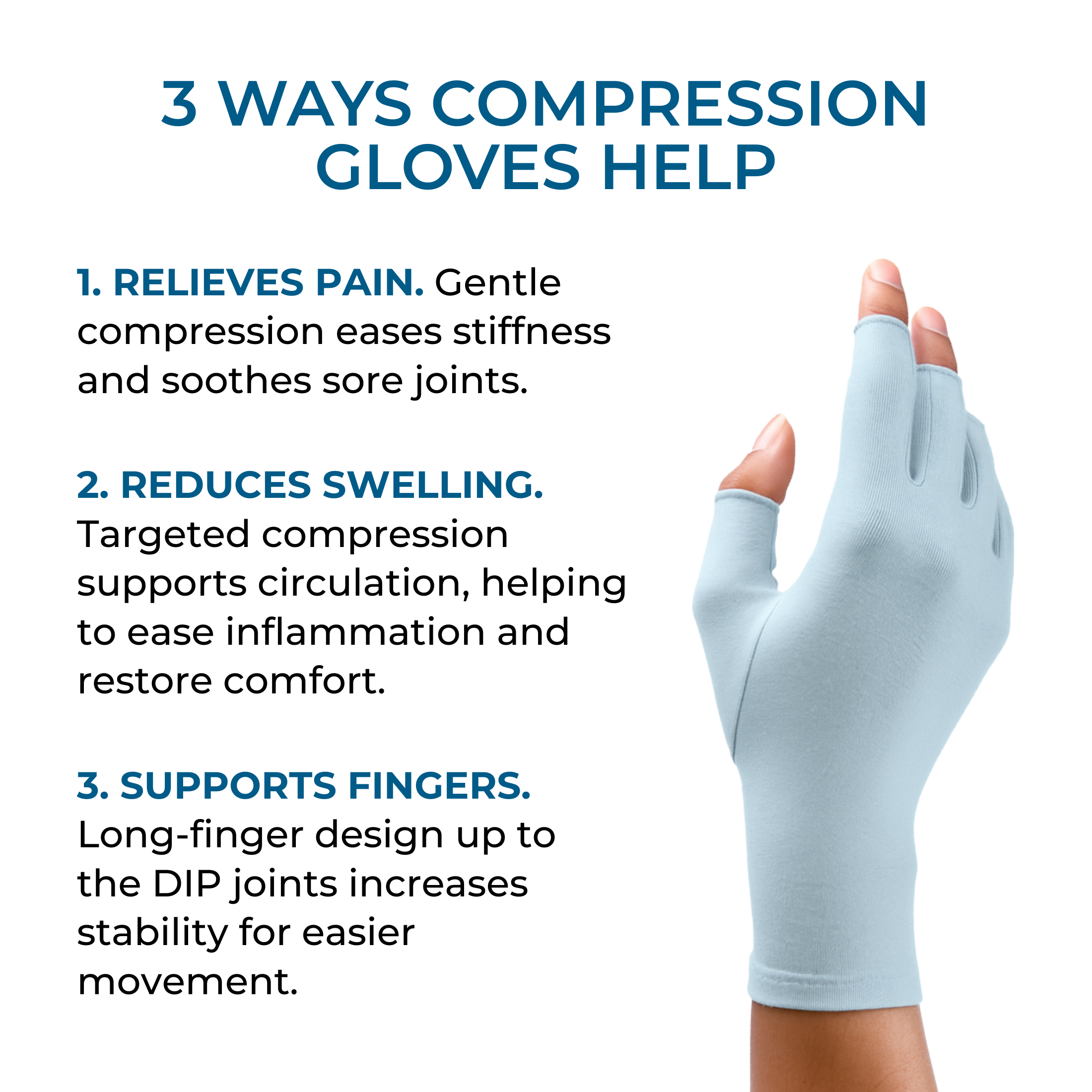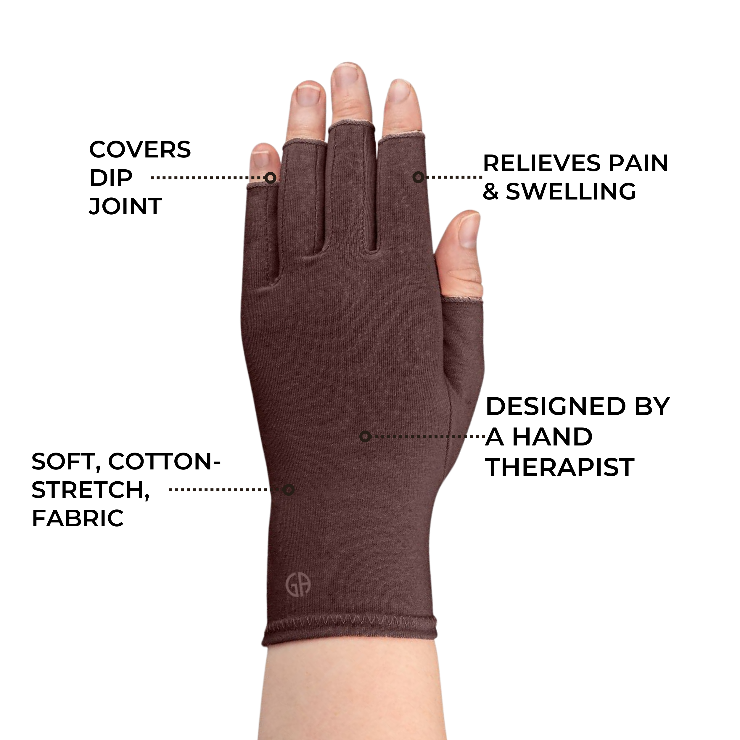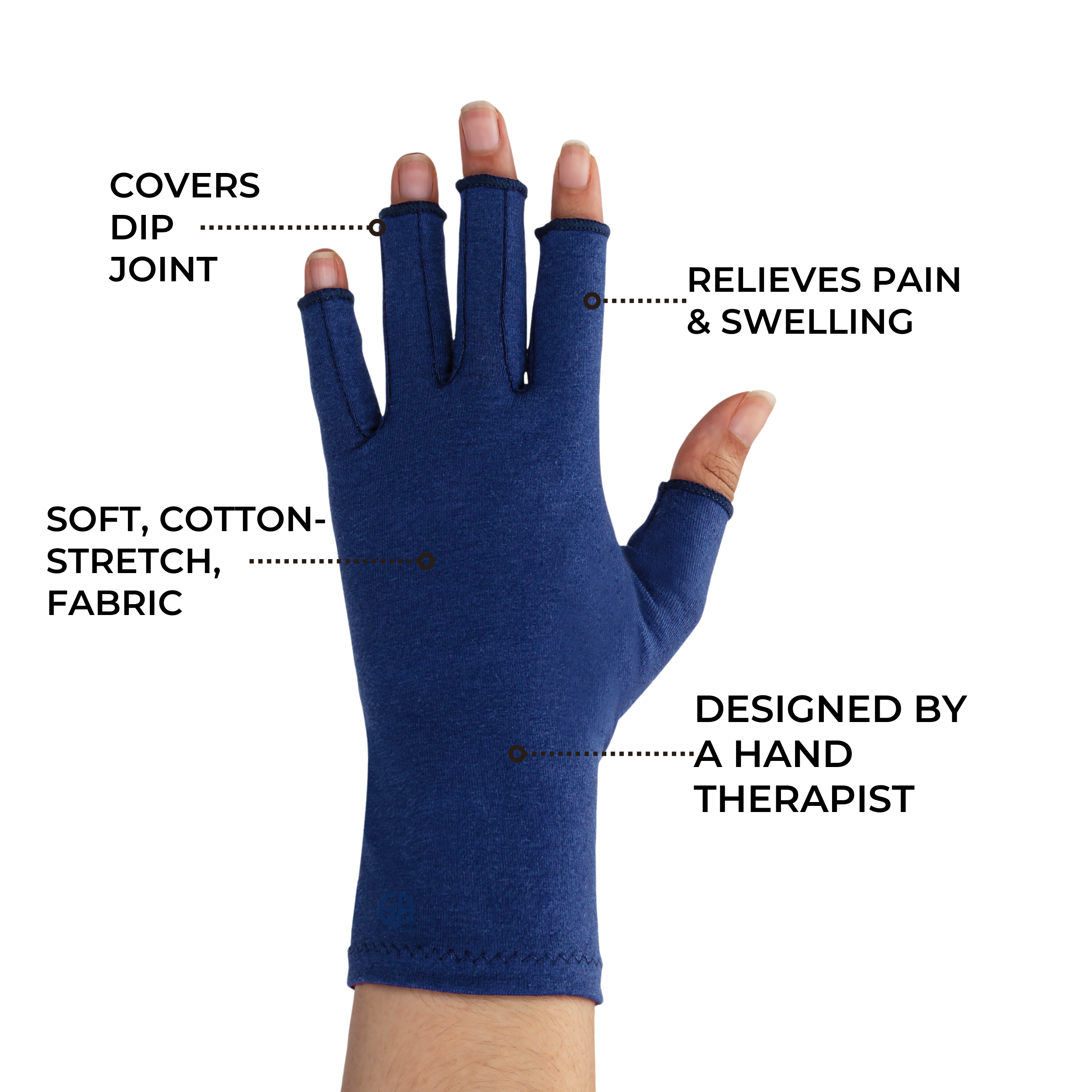 Get a hug for your hand! Gentle compression soothes sore fingers and supports sore joints. Designed by a hand therapist to relieve arthritic pain and swelling these gloves are great for people living with trigger finger, osteoarthritis, rheumatoid arthritis, EDS (hypermobility), neuropathy, and more.