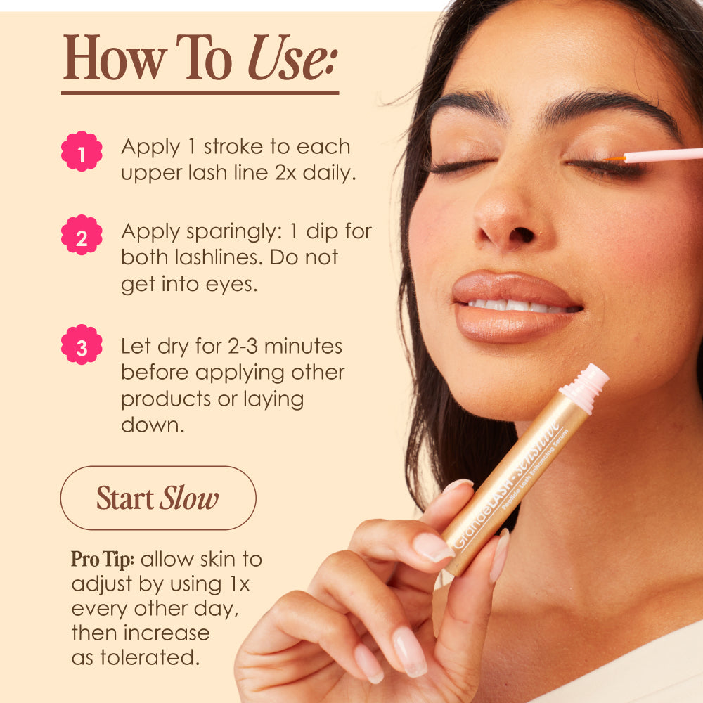 - Apply a single stroke to each upper lash line twice daily (AM and PM). Do not apply to the lower lash line