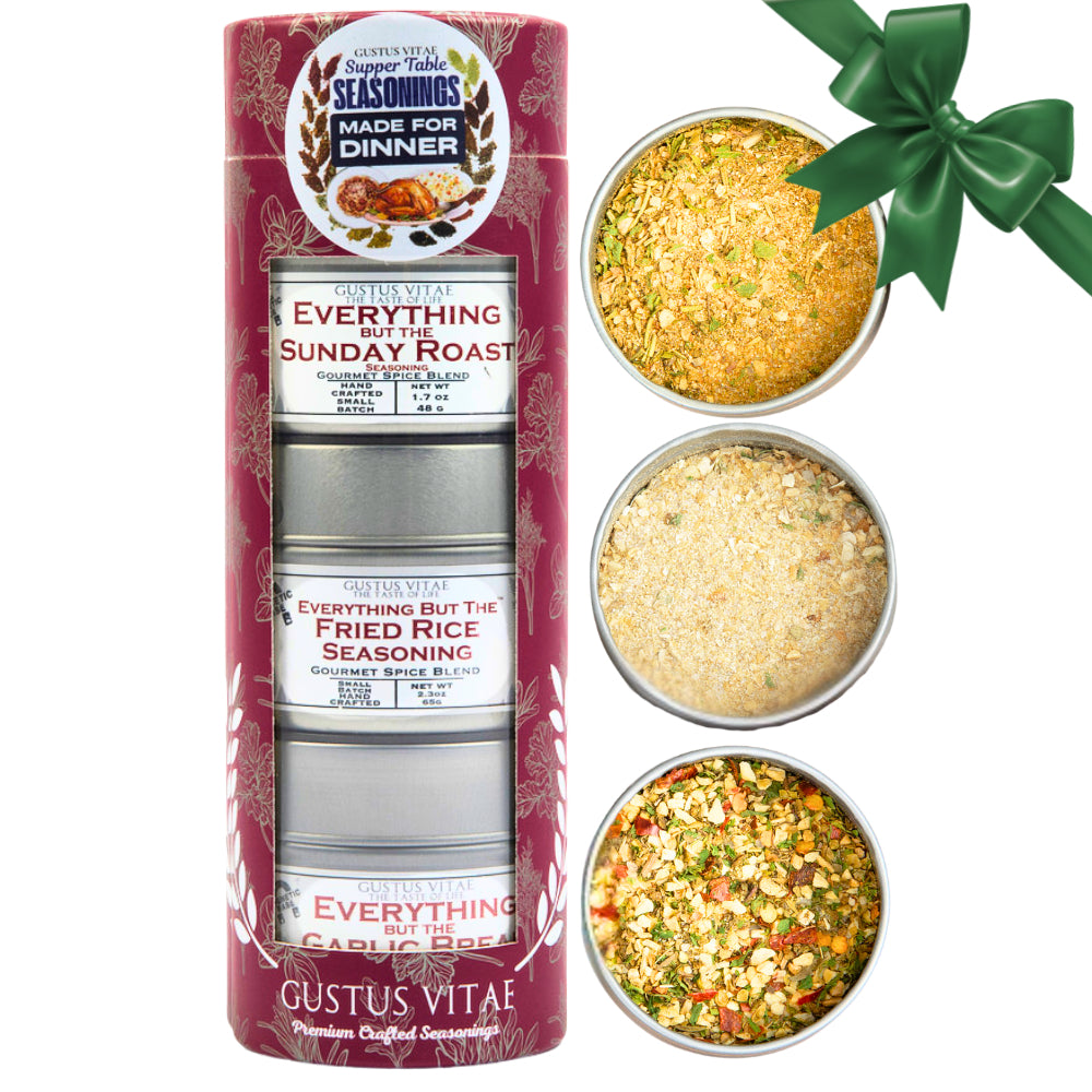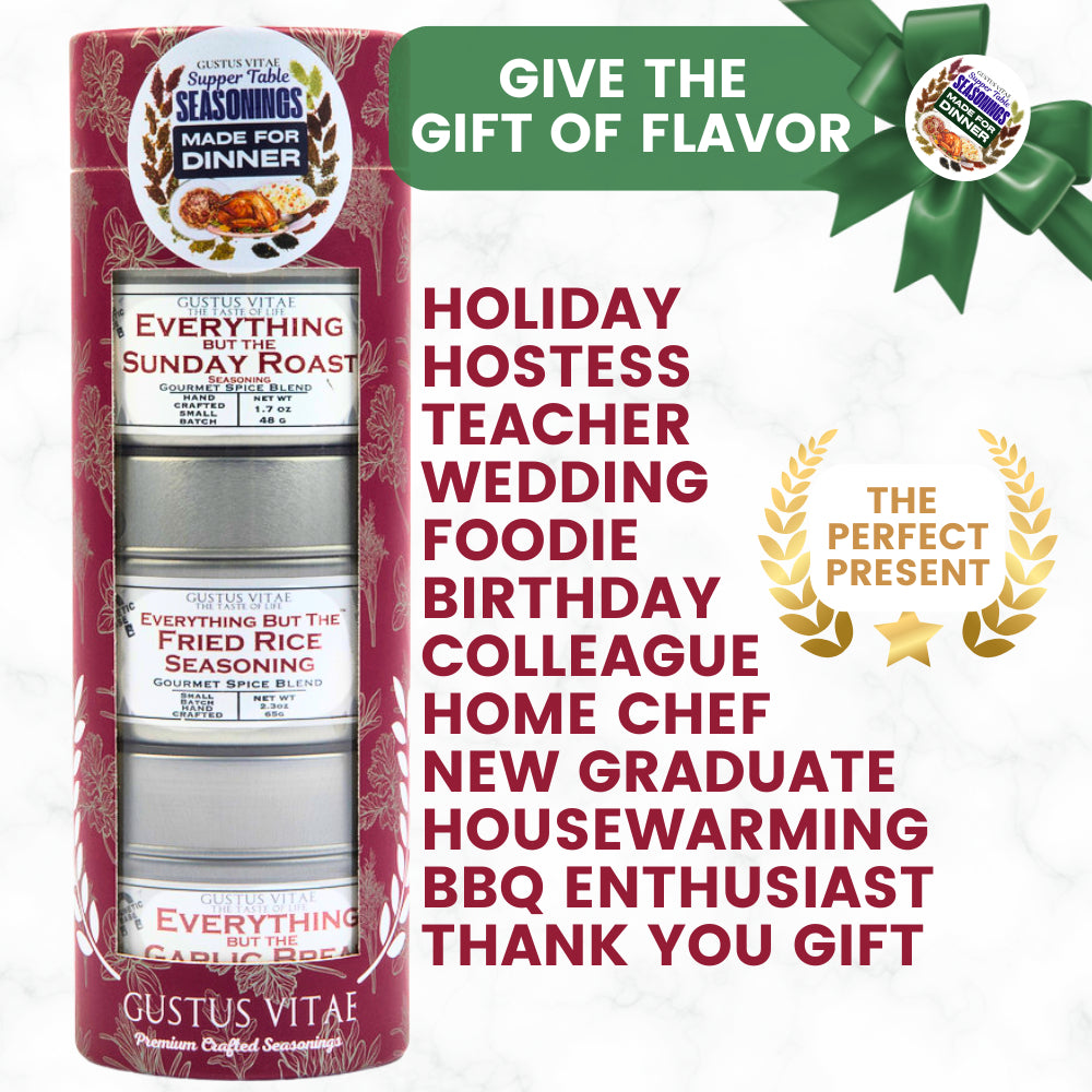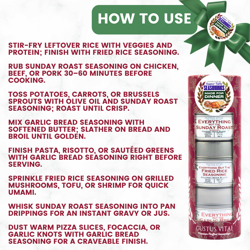 Shake, sprinkle, done—this do-it-all trio makes literally anything you’re cooking taste better: sheet pans, skillet tosses, soups, pastas, veggies, grains, even leftovers. The Made for Dinner Supper Table Seasonings Gift Set is a trio of small-batch, hand-crafted blends built to make stir-fries, sheet-pan meals, roasts, pastas, and garlic bread taste like you had all day to cook.