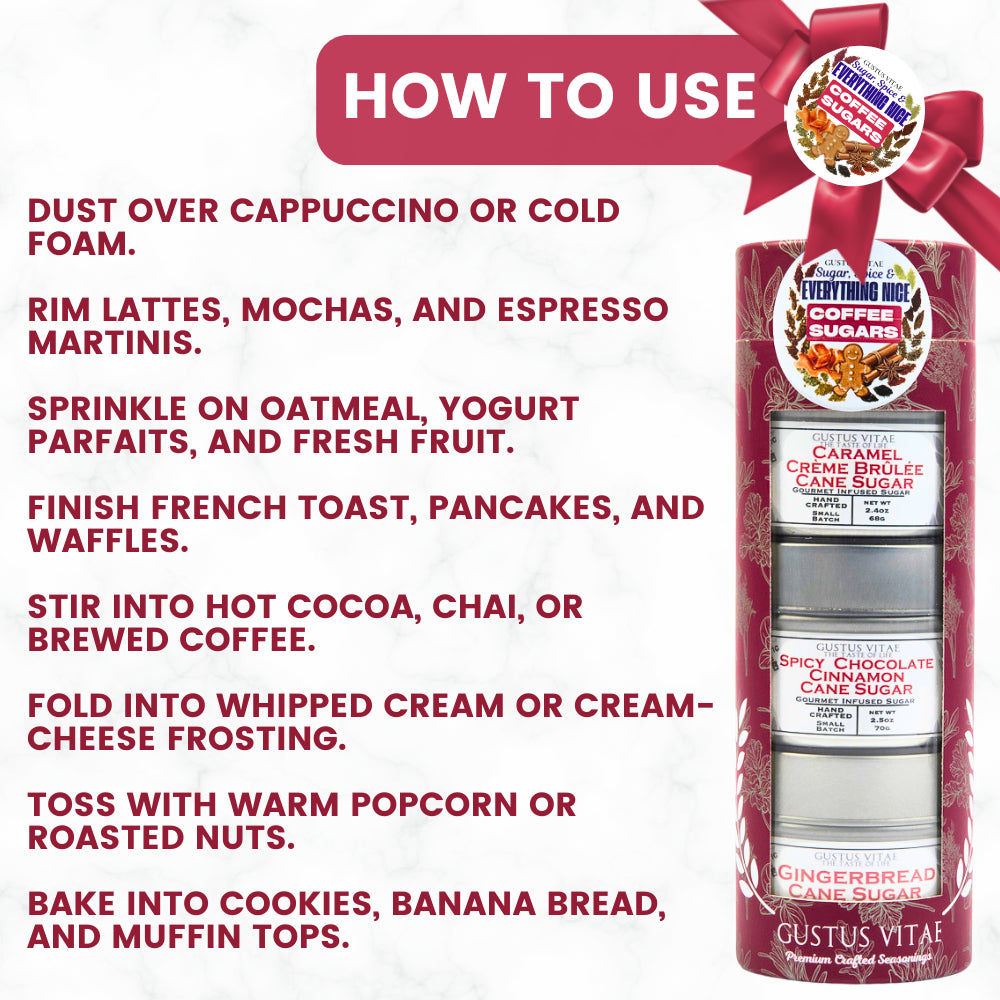 Sweeten the everyday ritual. The Sugar, Spice & Everything Nice Gift Set is a trio of small-batch, hand-crafted cane sugars designed to elevate everything from your morning latte to late-night desserts. Curated for coffee lovers and creative home bakers alike, this set delivers café-quality flavor in seconds—no syrups, no fuss, just instant delicious.