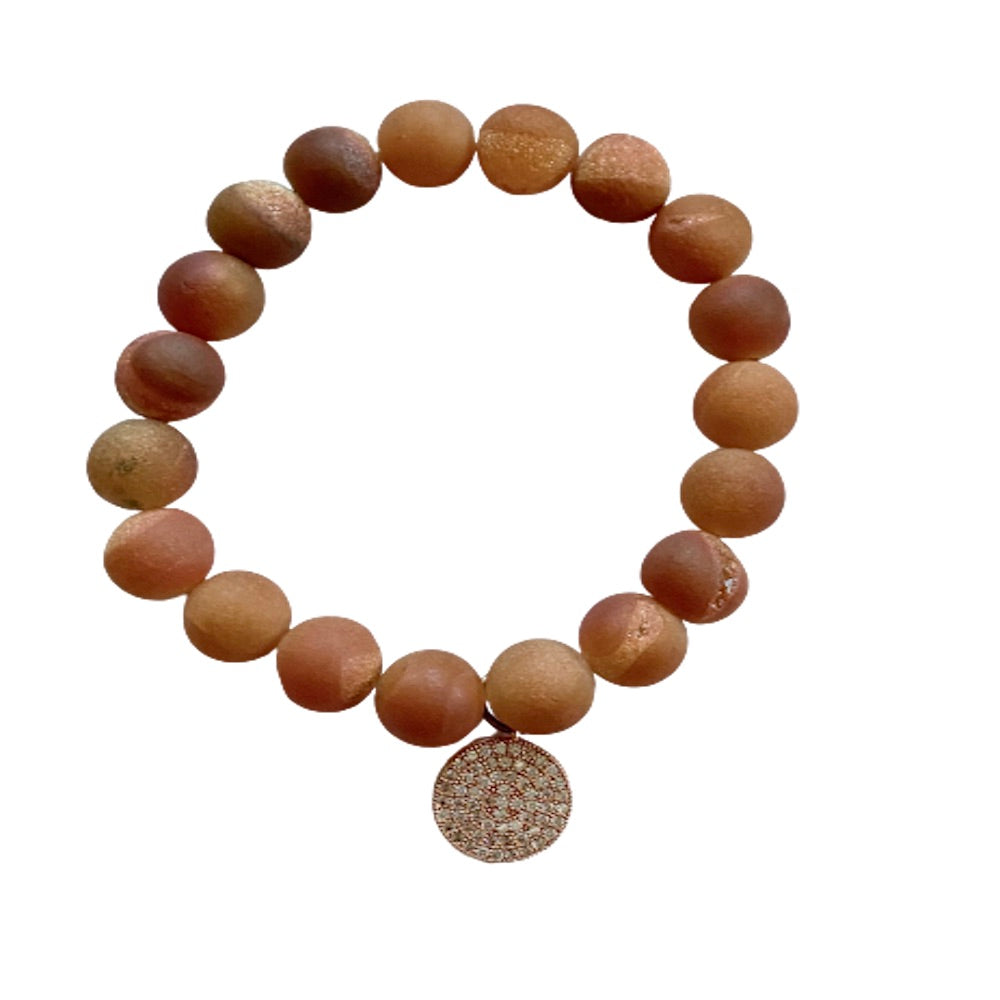 With pavé CZ stones and peach druzy beads, this bracelet makes a beautiful statement piece. Whether you wear it solo or stacked, it can effortlessly carry you from day to night.