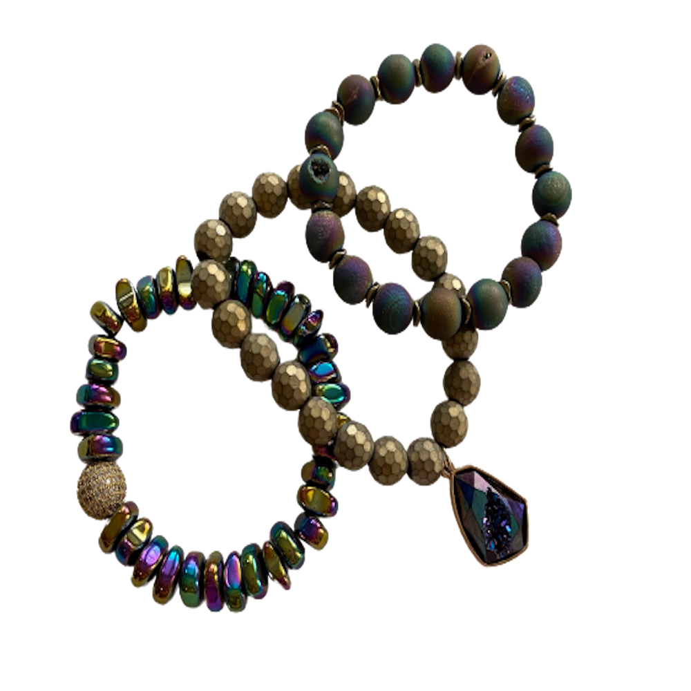 This stack of bracelets is truly unique! With rainbow druzy and hematite, these pieces can add a pop of color to your look.