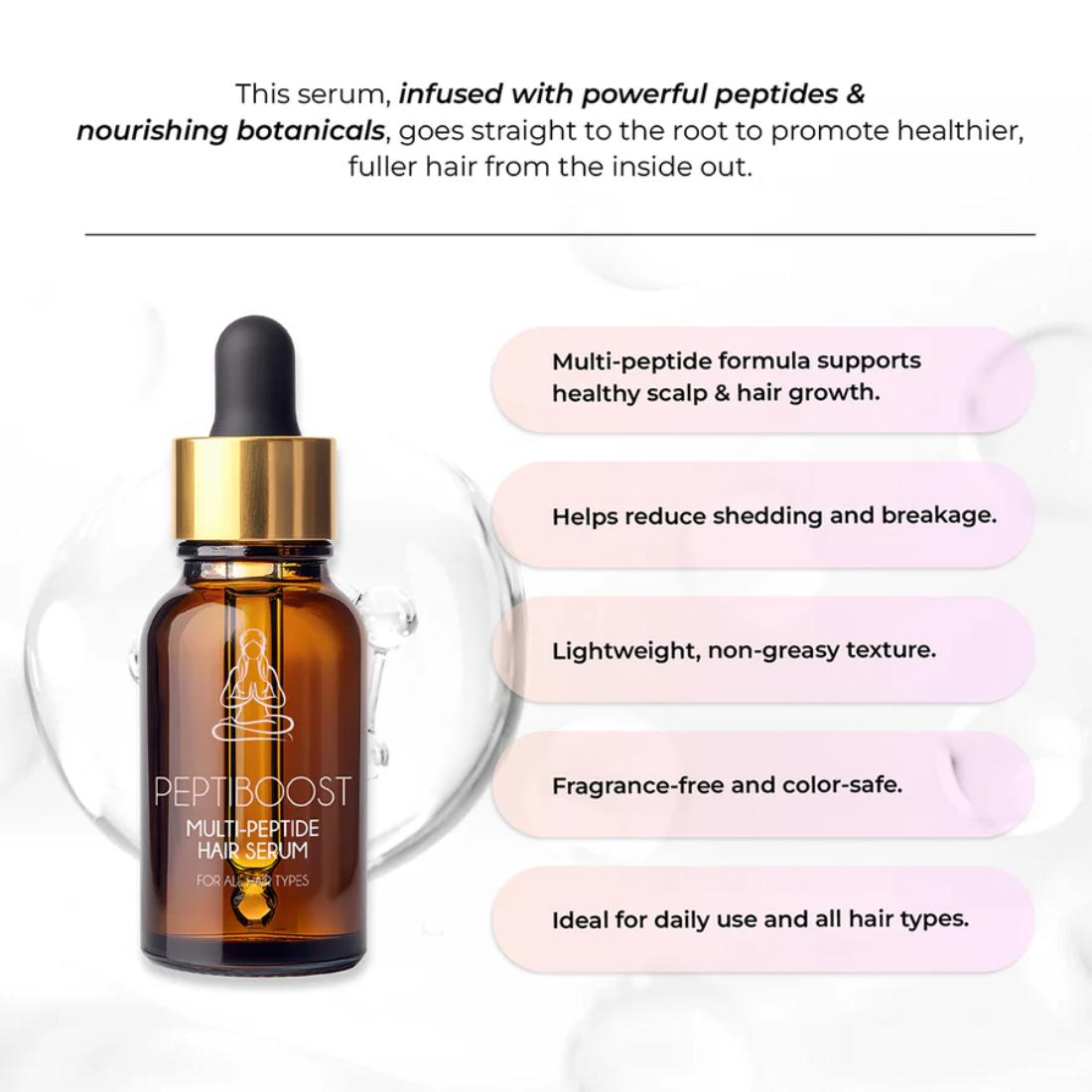 PeptiBoost Multi-Peptide Hair Serum is a lightweight, non-greasy formula packed with peptides and botanicals that strengthen strands, support healthy follicles, and promote fuller, thicker-looking hair.