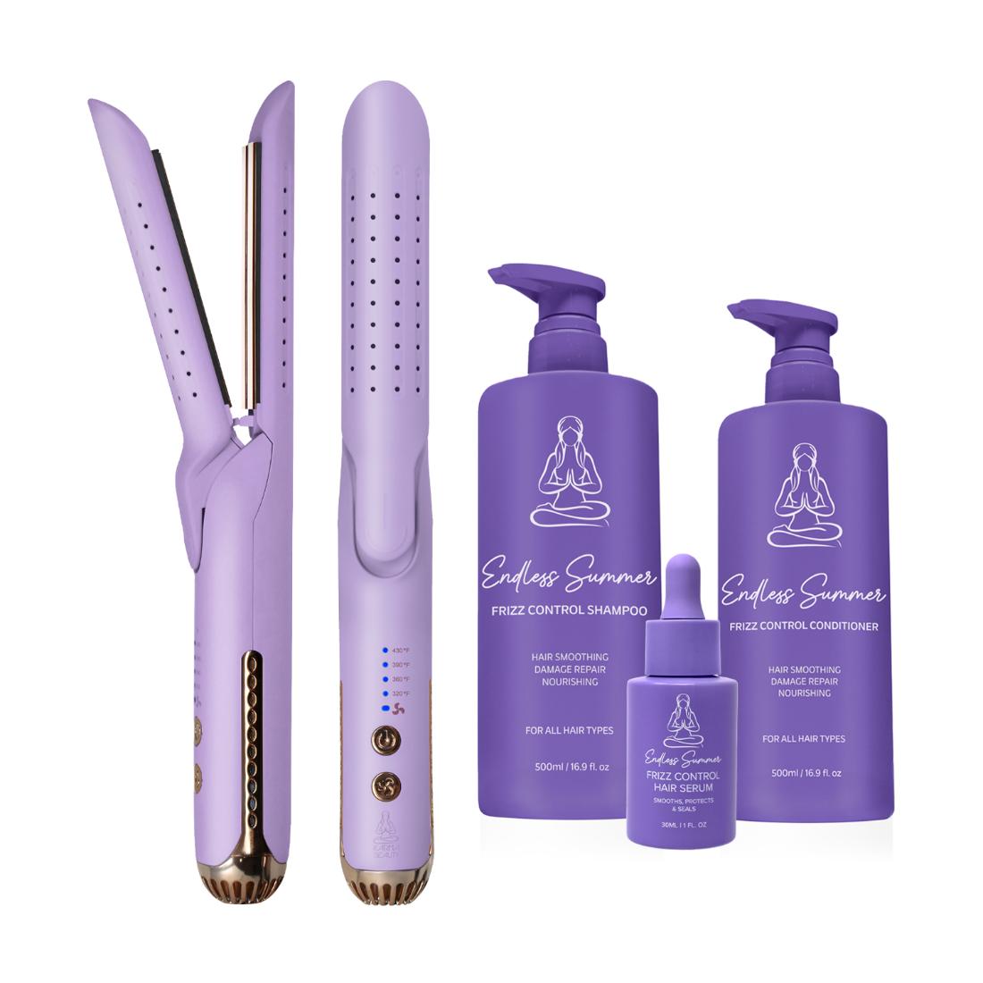 The Anti-Frizz Bundle combines the Beauty and the Breeze Air Styler with Endless Summer Shampoo, Conditioner, and Hair Serum to deliver salon-level smoothness and shine. The Air Styler straightens or curls in one pass while preserving moisture. The Endless Summer keratin and coconut oil–infused formulas help strengthen, repair, and tame flyaways for sleek, glossy, frizz-free results.
