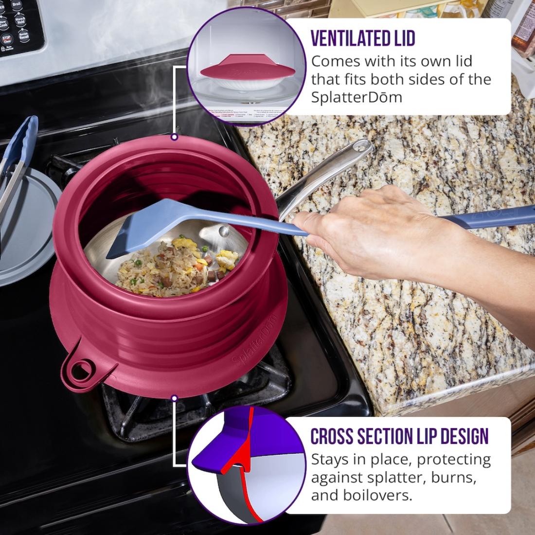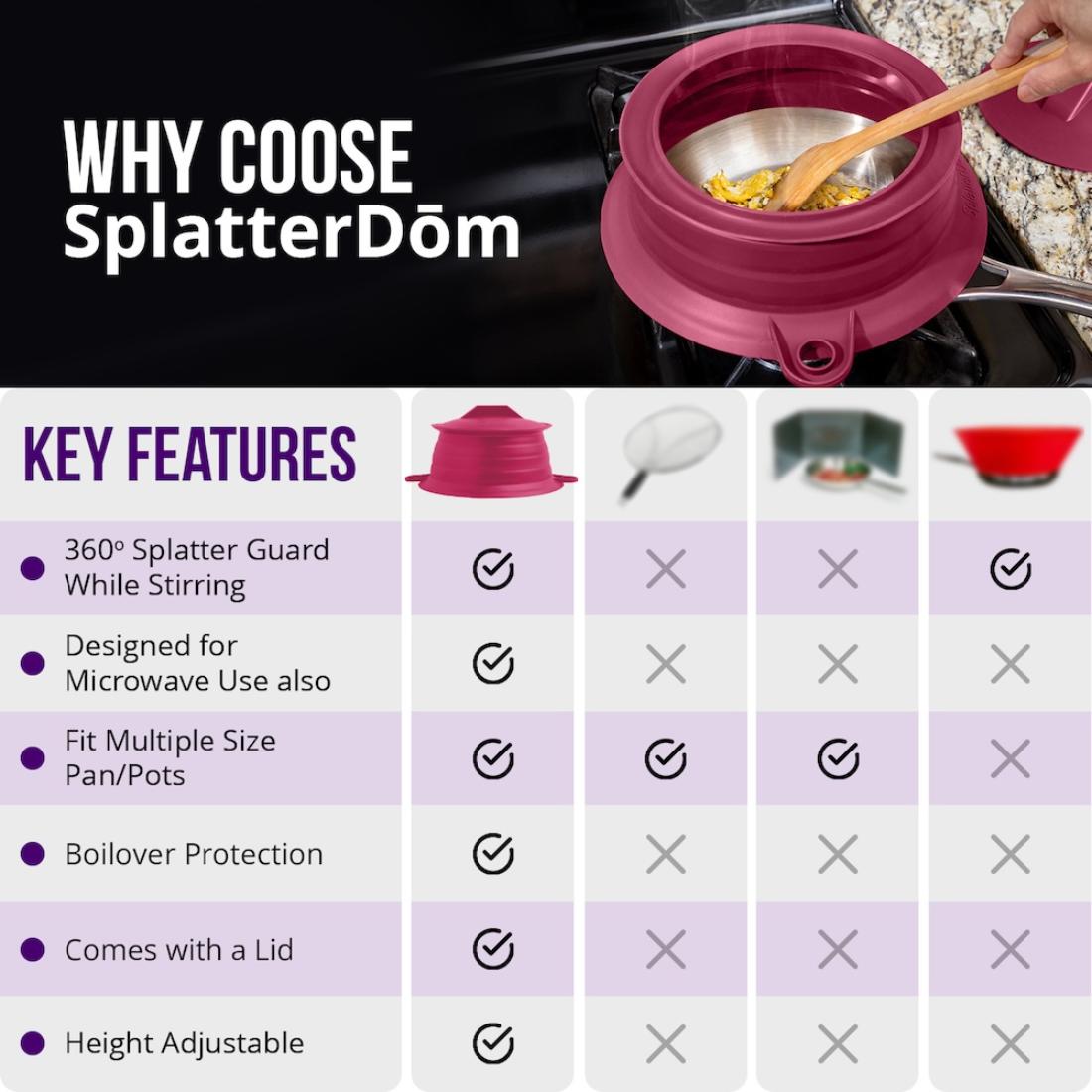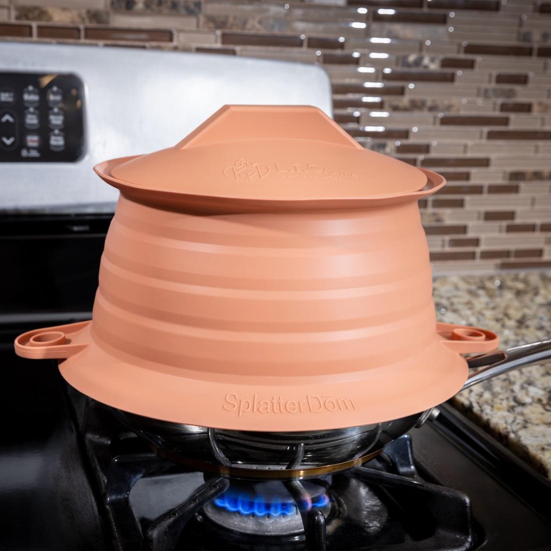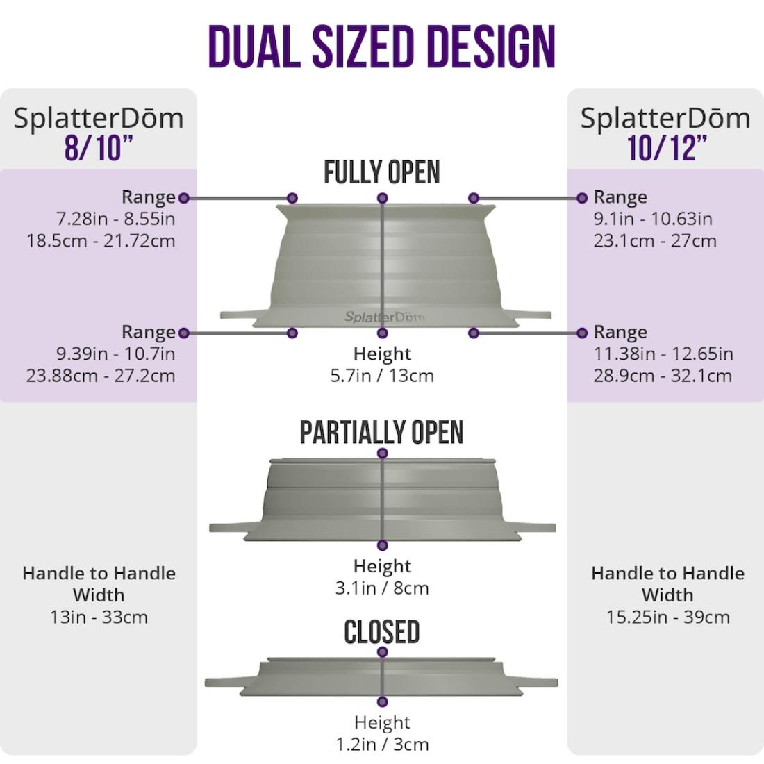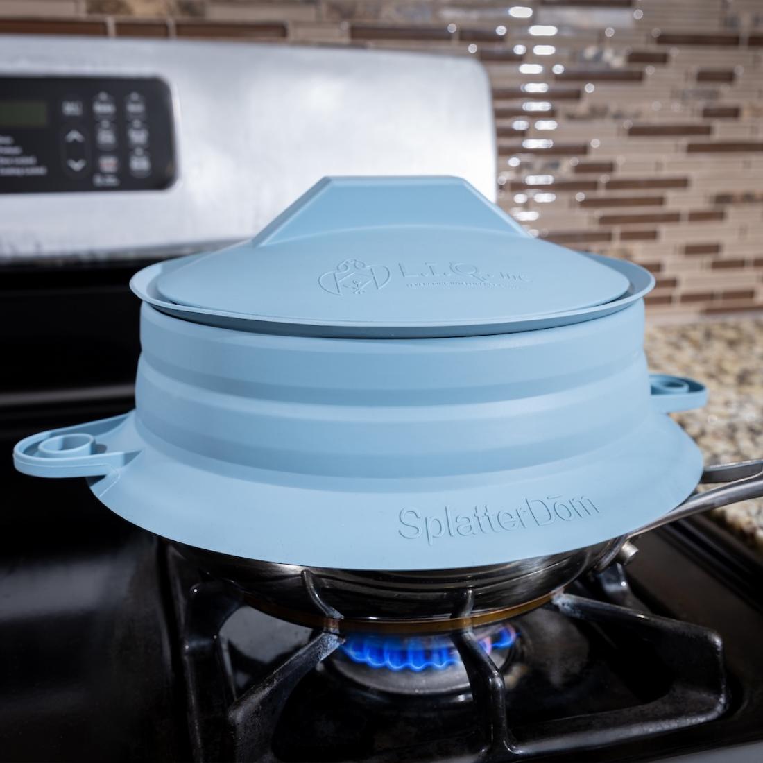 Meet SplatterDōm®, the patented, revolutionary, multifunctional stovetop splatter guard and microwave cover developed to protect your cooking area while providing uncompromised access to your food. It comes in two different sizes, each designed to fit multiple pots and pans. Use this versatile tool while you sauté, fry, sear, simmer, or boil, and enjoy limiting your mess but not your cooking!