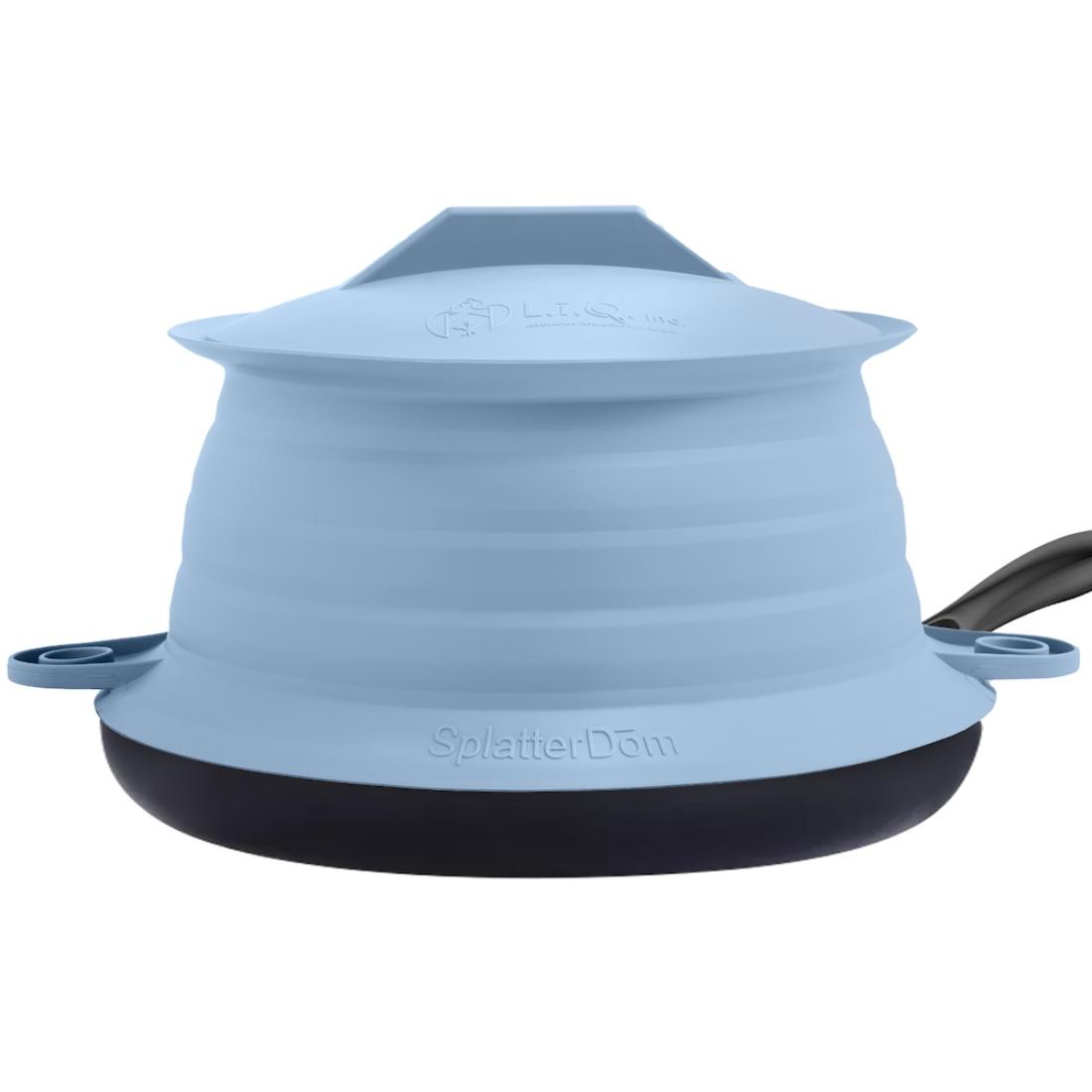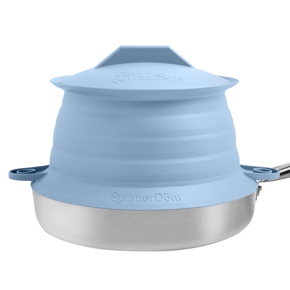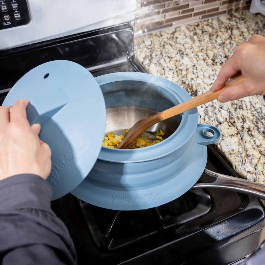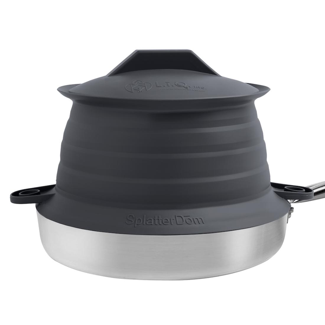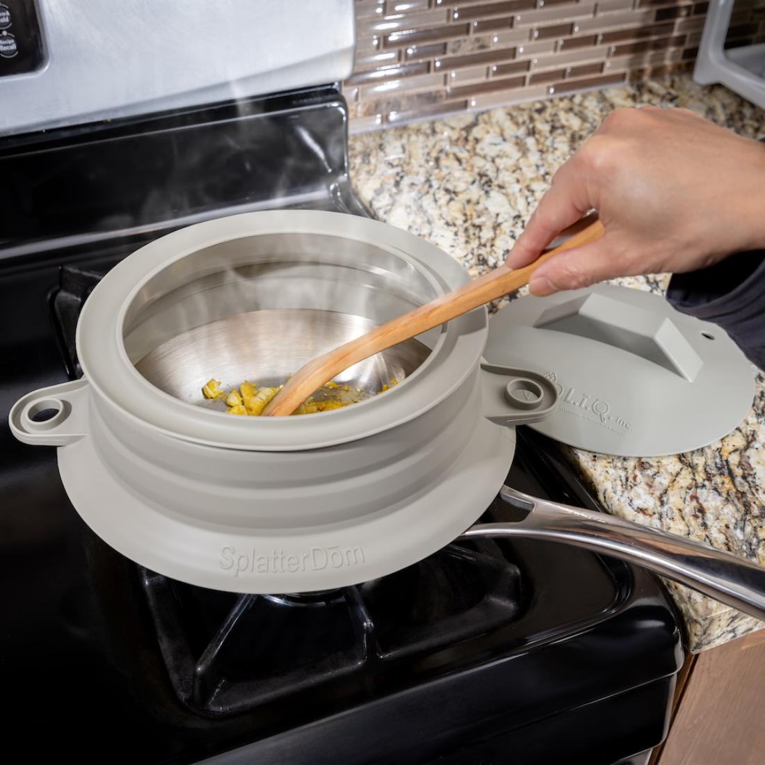Meet SplatterDōm®, the patented, revolutionary, multifunctional stovetop splatter guard and microwave cover developed to protect your cooking area while providing uncompromised access to your food. It comes in two different sizes, each designed to fit multiple pots and pans. Use this versatile tool while you sauté, fry, sear, simmer, or boil, and enjoy limiting your mess but not your cooking!
