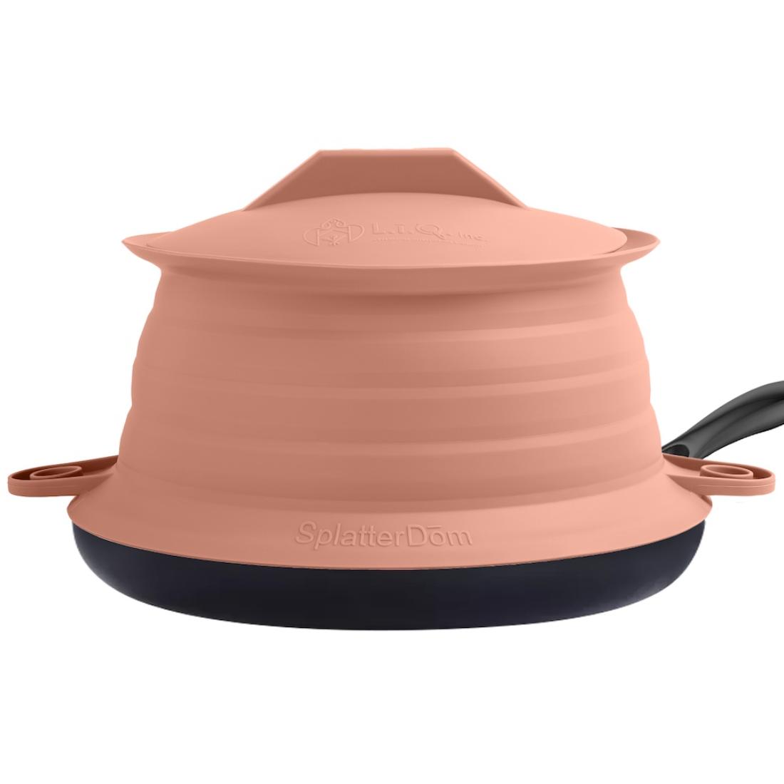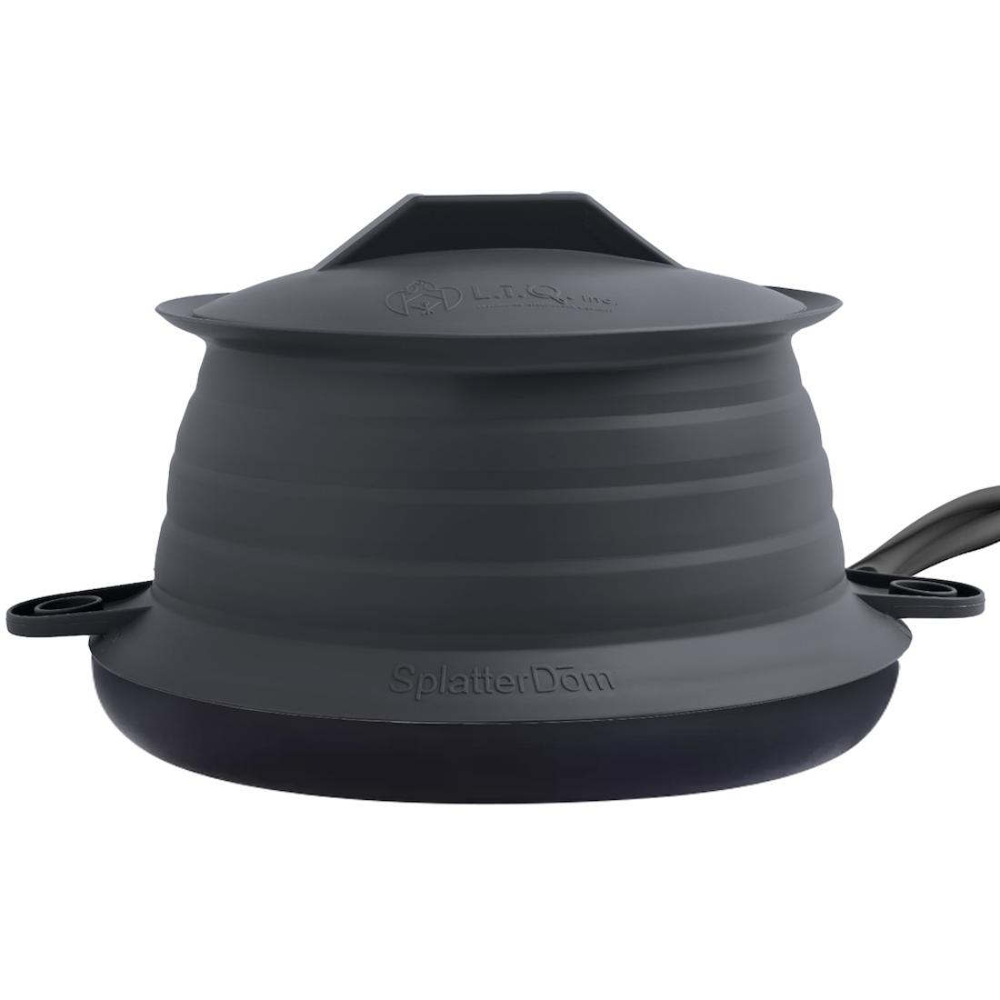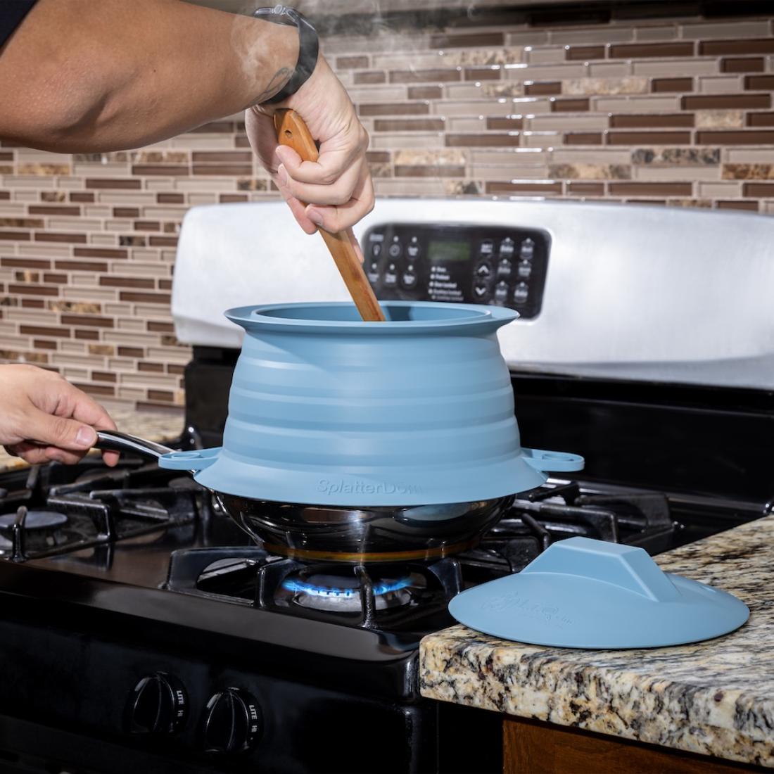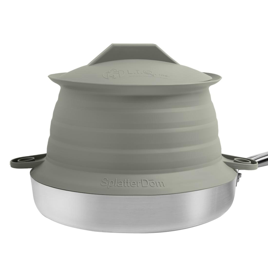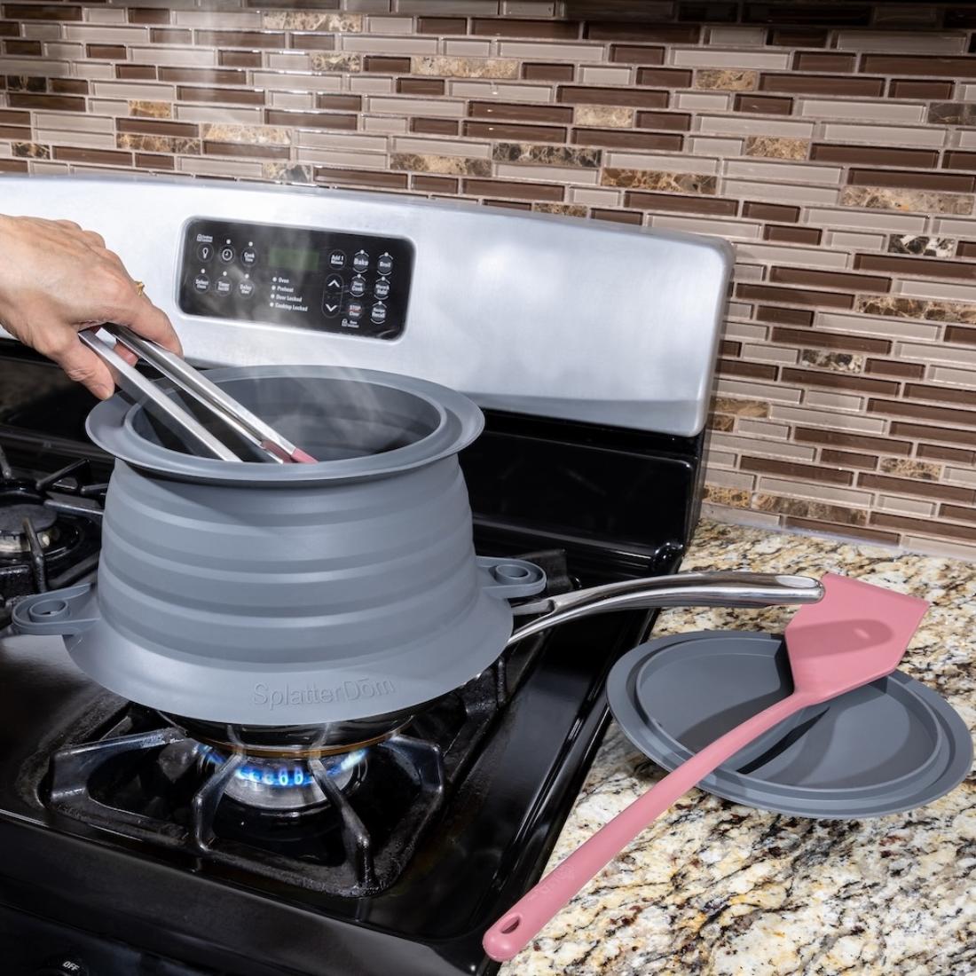 Meet SplatterDōm®, the patented, revolutionary, multifunctional stovetop splatter guard and microwave cover developed to protect your cooking area while providing uncompromised access to your food. It comes in two different sizes, each designed to fit multiple pots and pans. Use this versatile tool while you sauté, fry, sear, simmer, or boil, and enjoy limiting your mess but not your cooking!