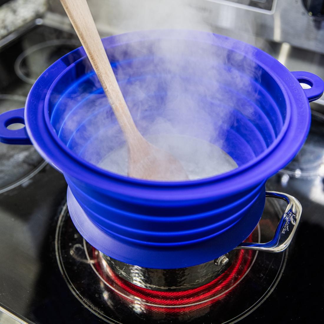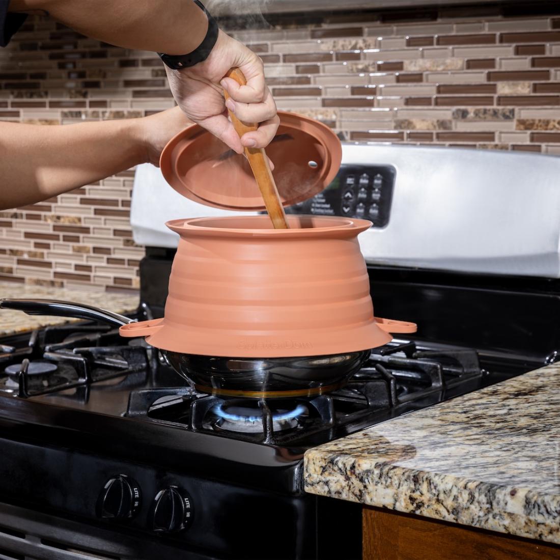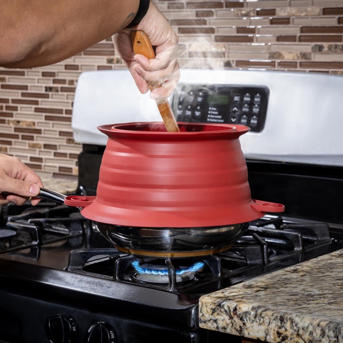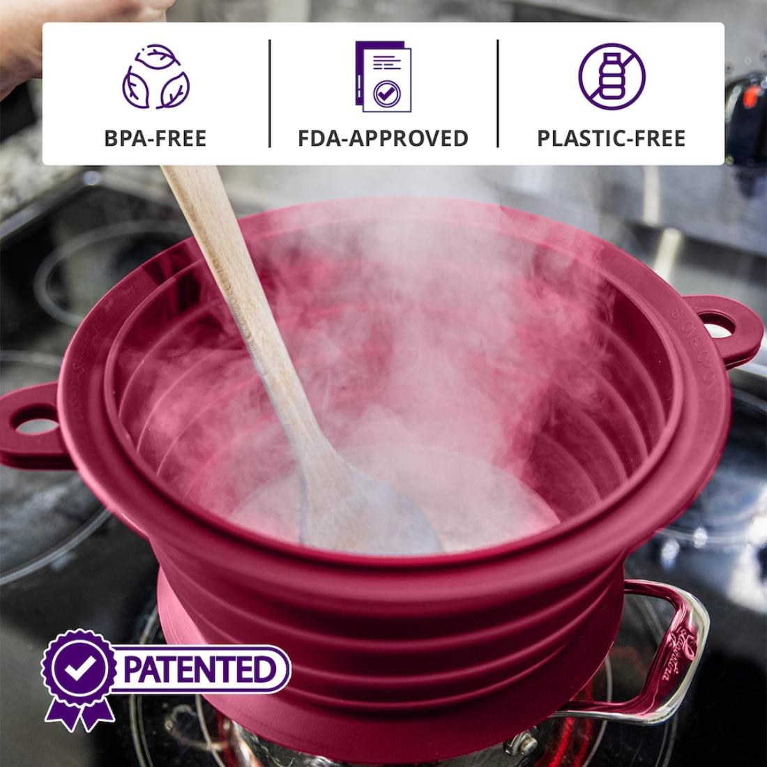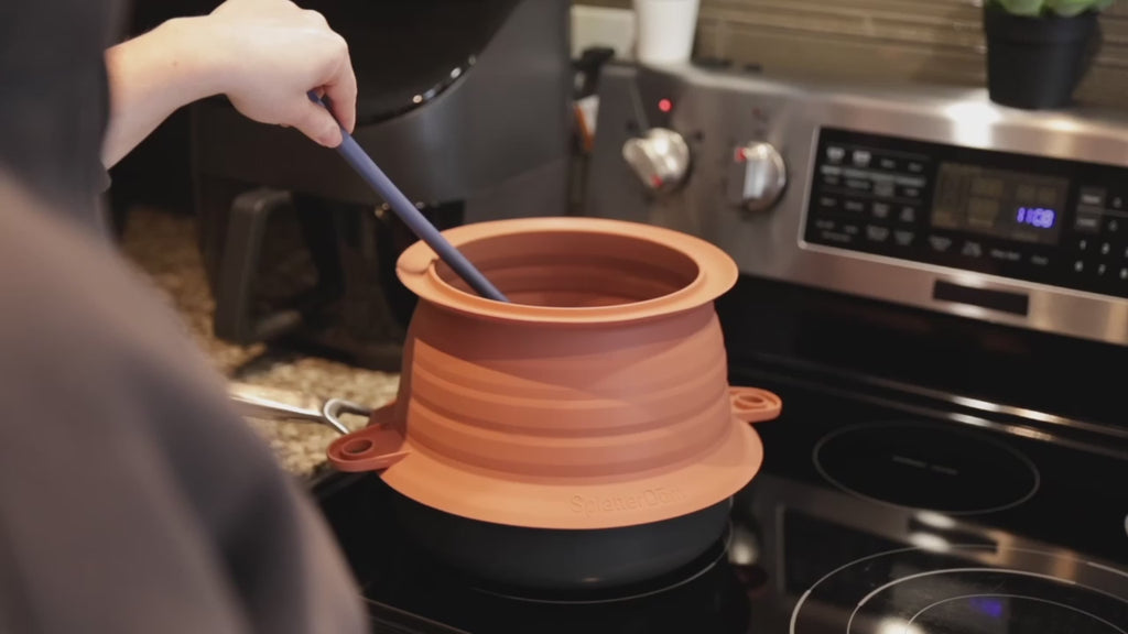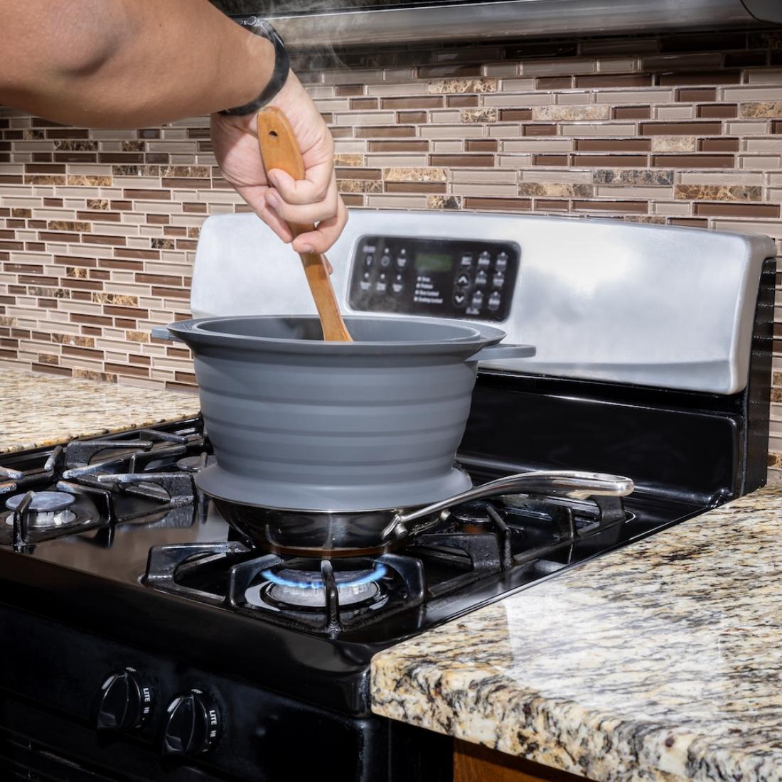 Meet SplatterDōm®, the patented, revolutionary, multifunctional stovetop splatter guard and microwave cover developed to protect your cooking area while providing uncompromised access to your food. It comes in two different sizes, each designed to fit multiple pots and pans. Use this versatile tool while you sauté, fry, sear, simmer, or boil, and enjoy limiting your mess but not your cooking!
