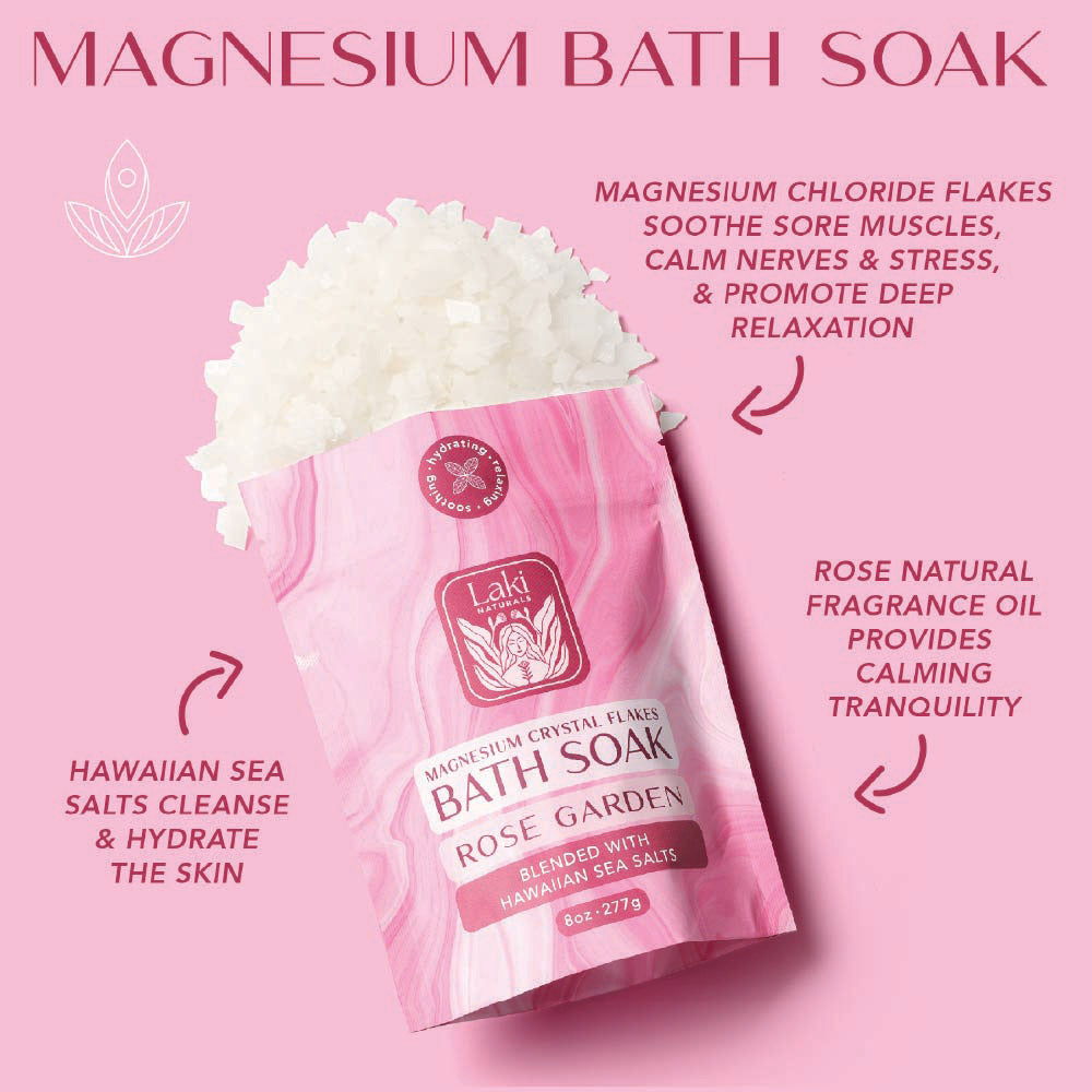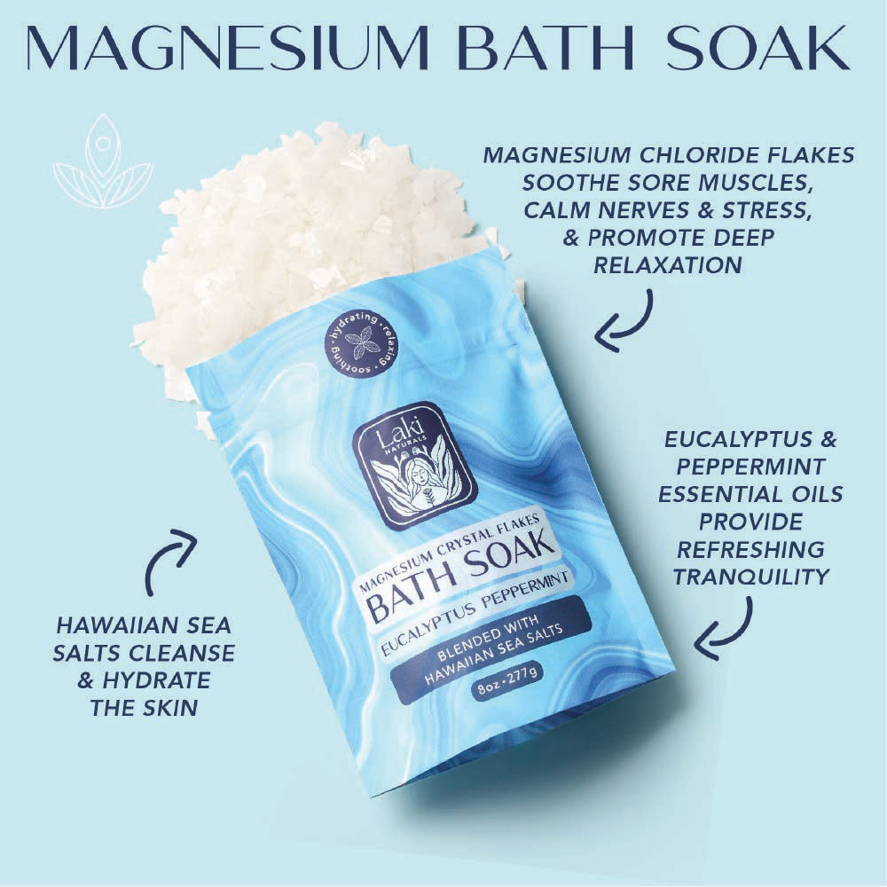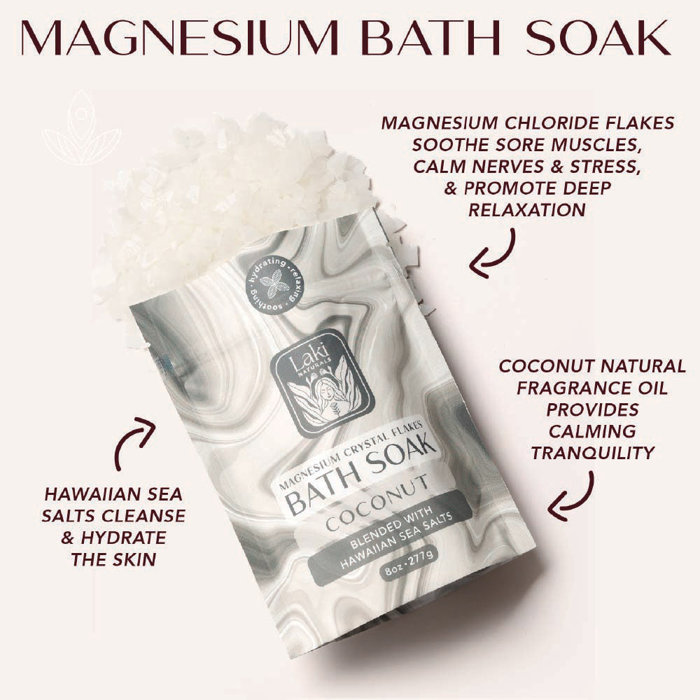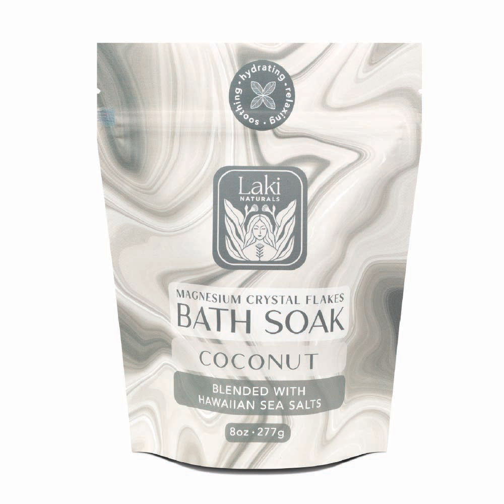 Let go and relax into the soothing, calming properties of magnesium flakes blended with hydrating Hawaiian sea salts, pure essential oils, and natural fragrances. This bath soak is formulated to help soothe sore and tired muscles, calm nerves, and promote deep relaxation.