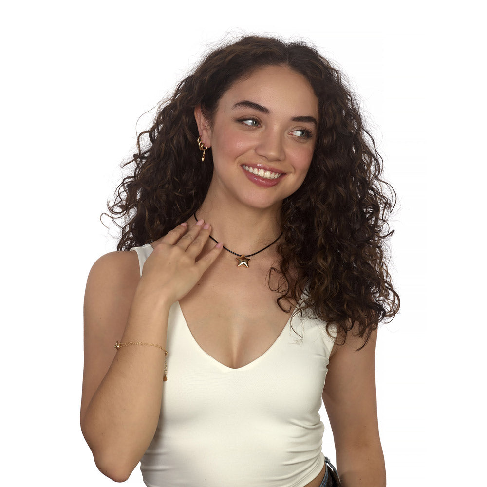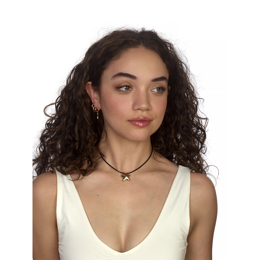 The Midnight Star Necklace features a bold, high-polish gold-plated puffed star with a fresh, fashion edge. Strung on a sleek black cord, it’s effortlessly cool—ideal solo or layered.